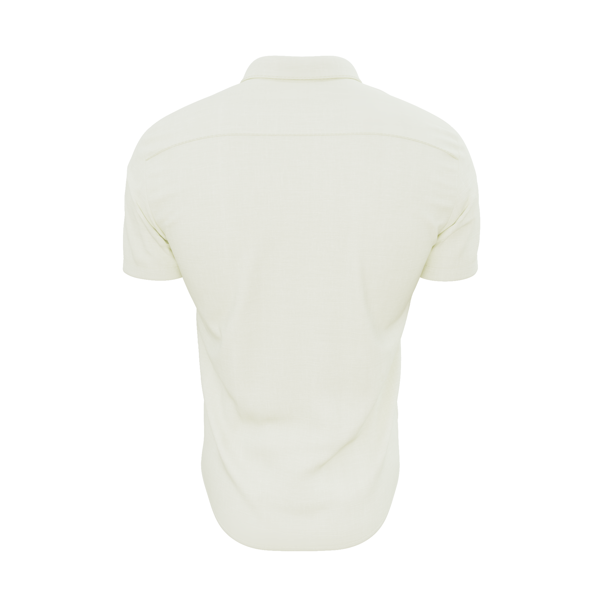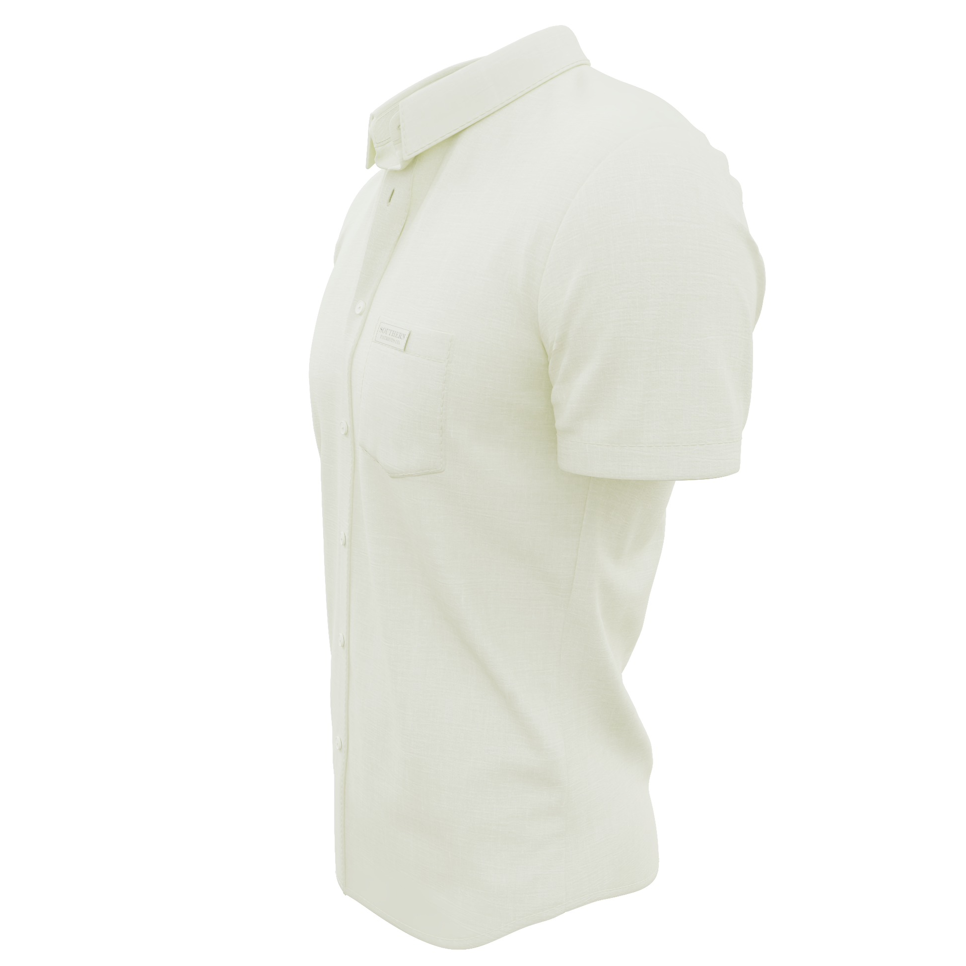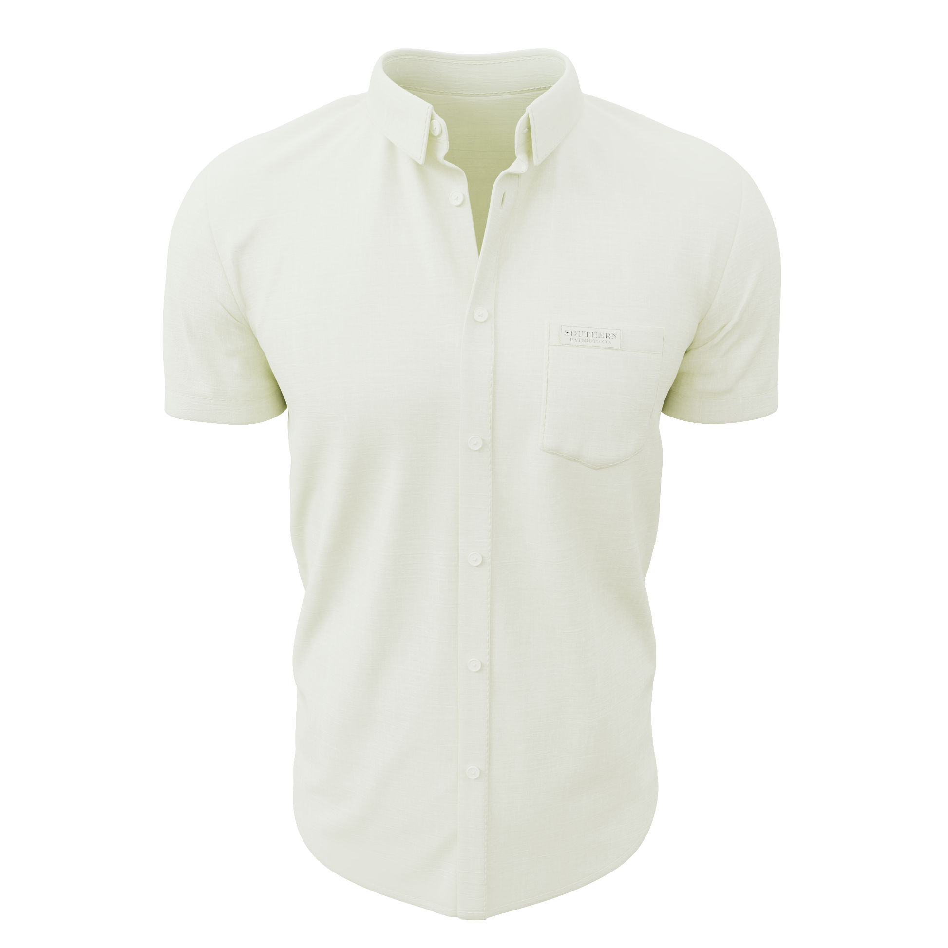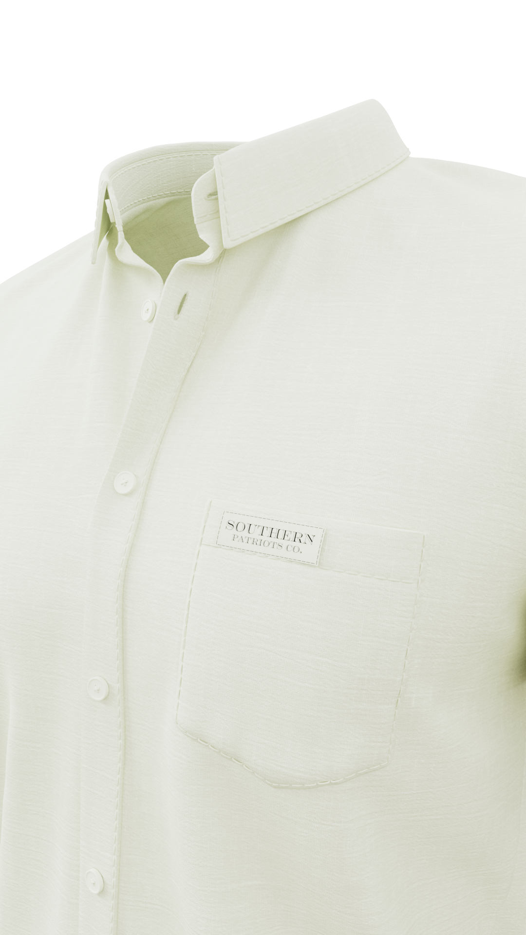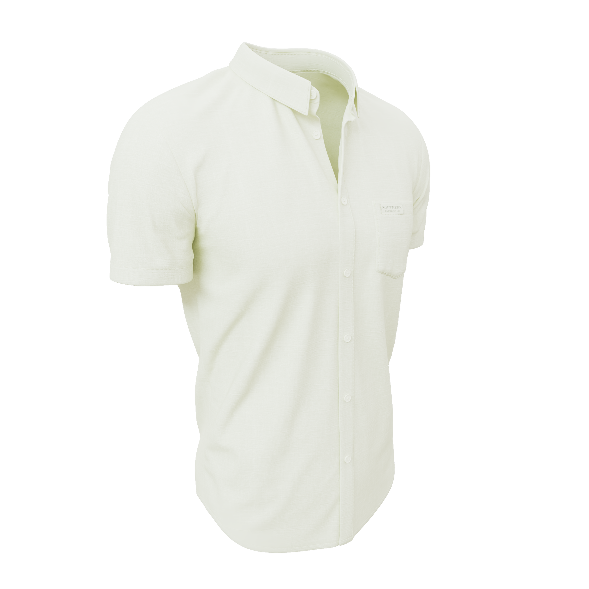 Our Beige button down polo shirt. It is 92% Poly, 8% Spandex. It is stretchy, durable, quick drying, moisture wicking, and it is UV 50+.