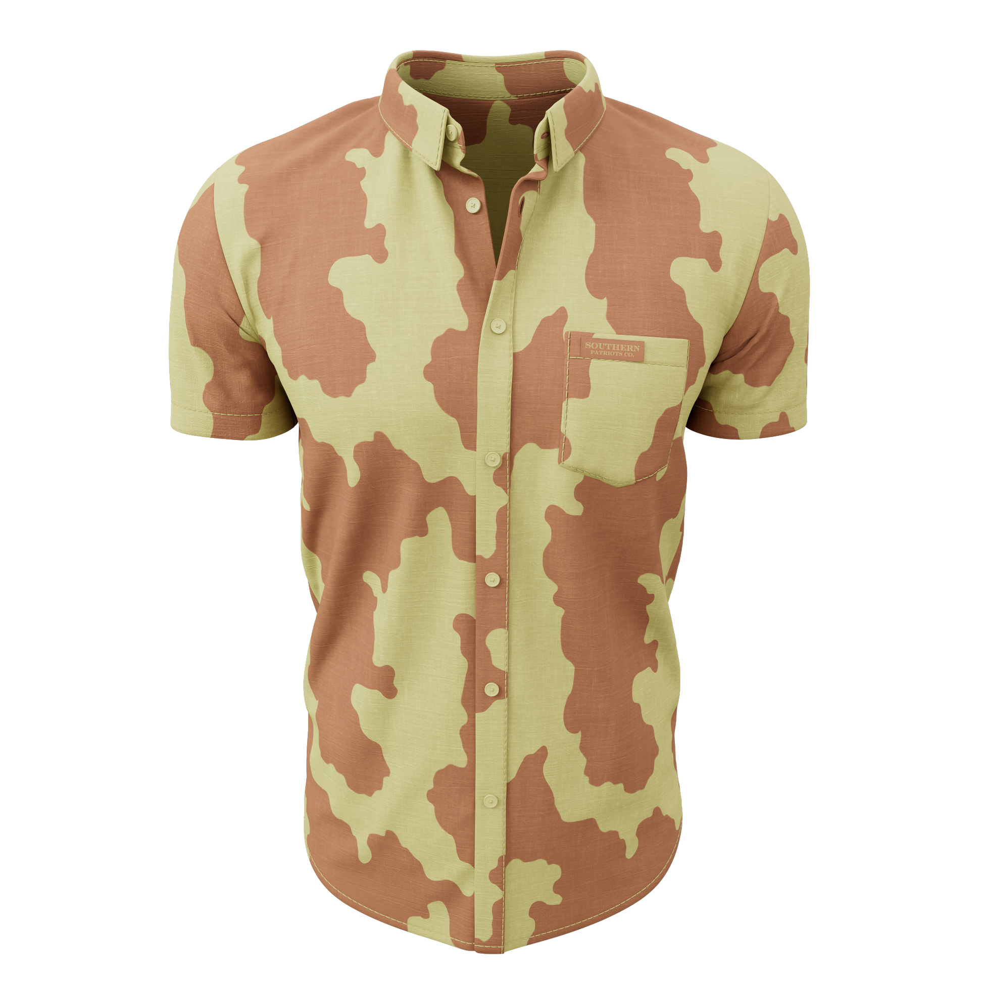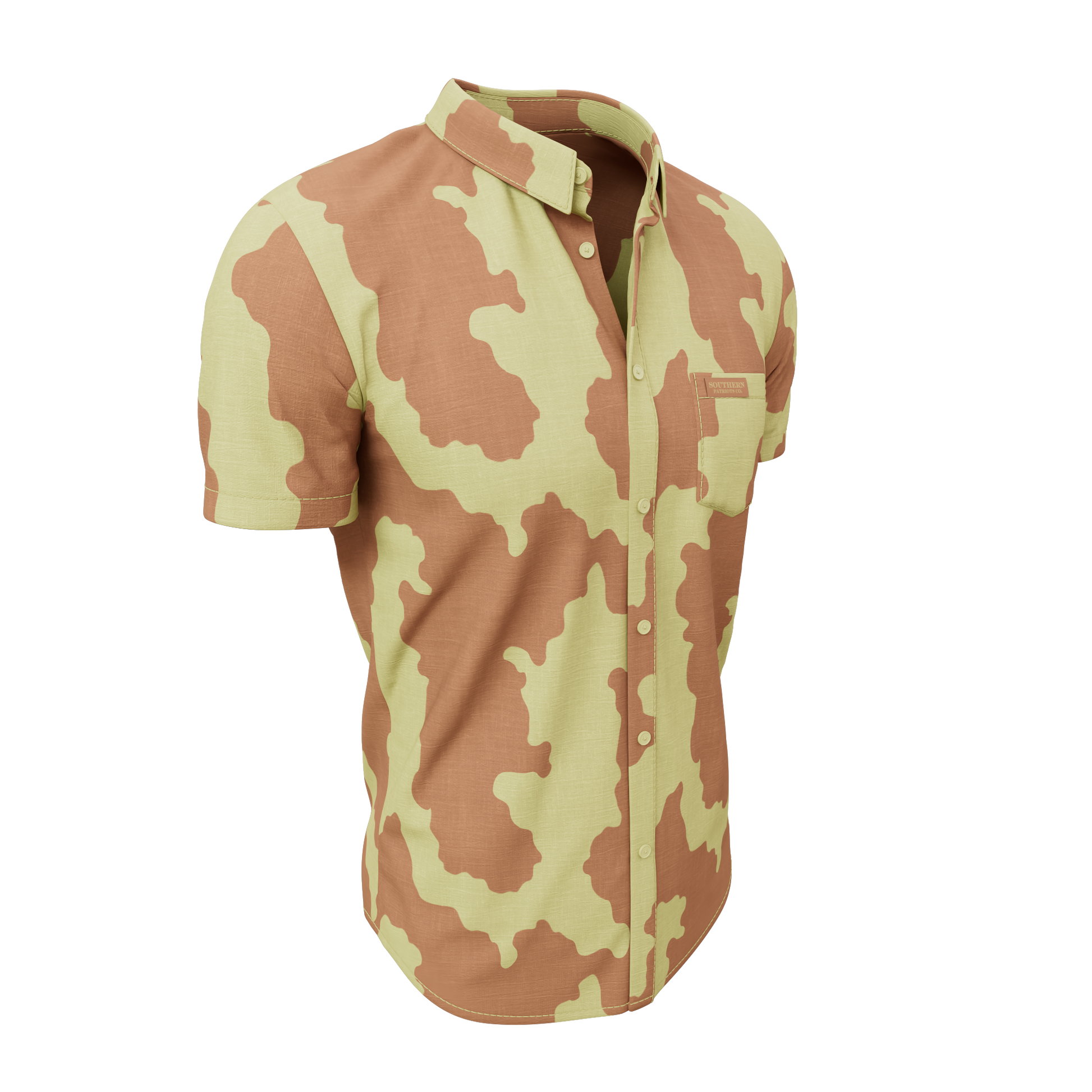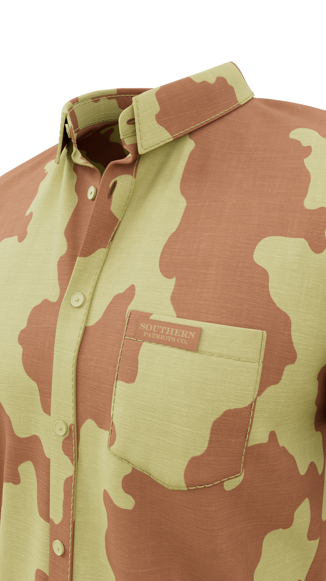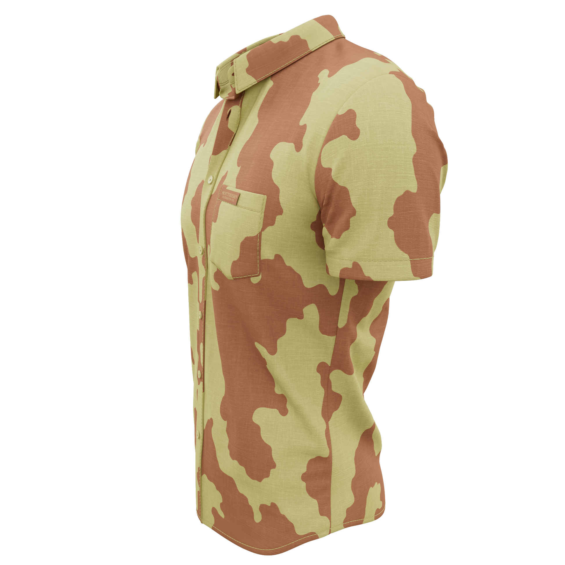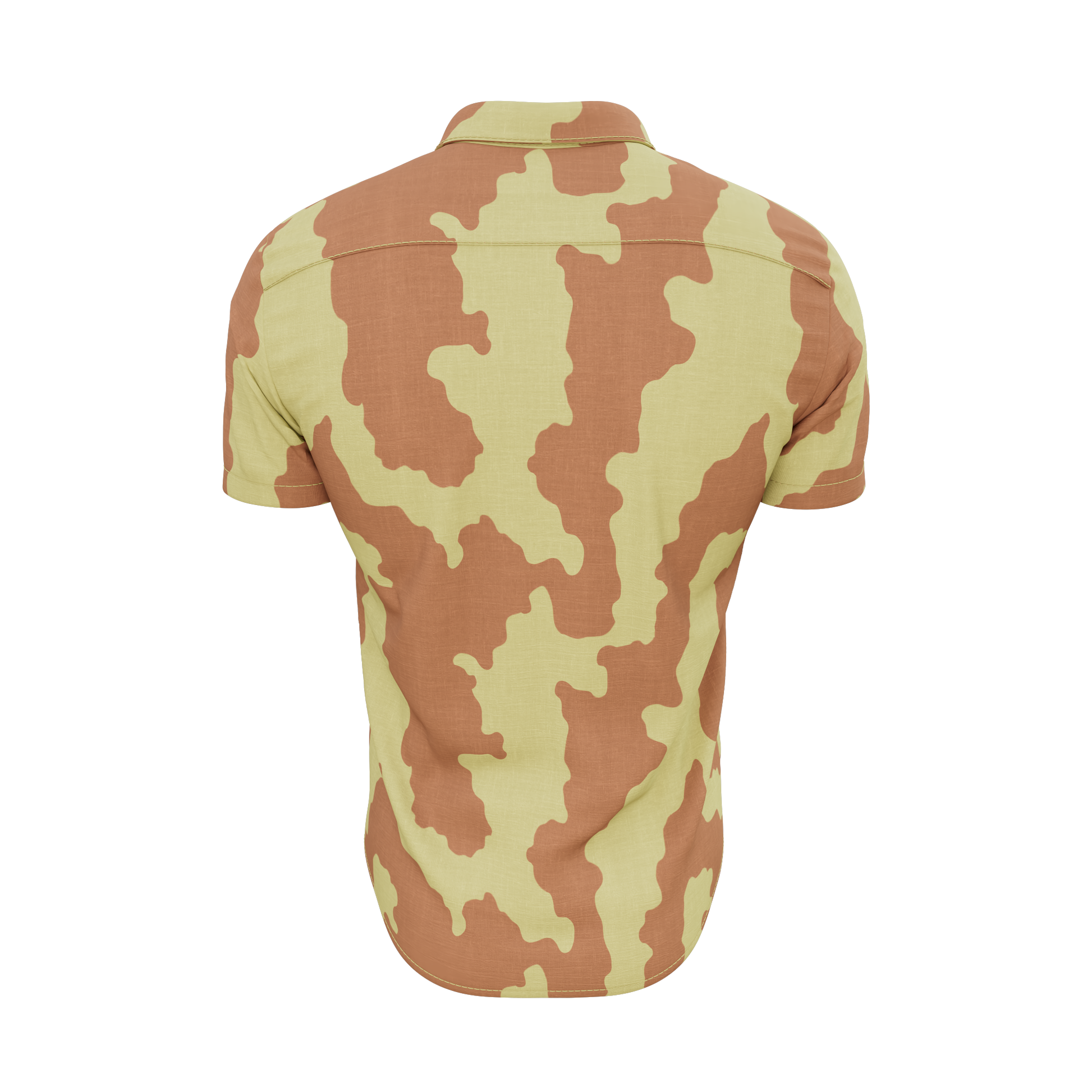Our version of the British Anti-Gas Camo in a button down polo shirt. During World War II, gas capes with this pattern were passed around in Britain to protect against gas attacks. It is 92% Poly, 8% Spandex. It is stretchy, durable, quick drying, moisture wicking, and it is UV 50+.