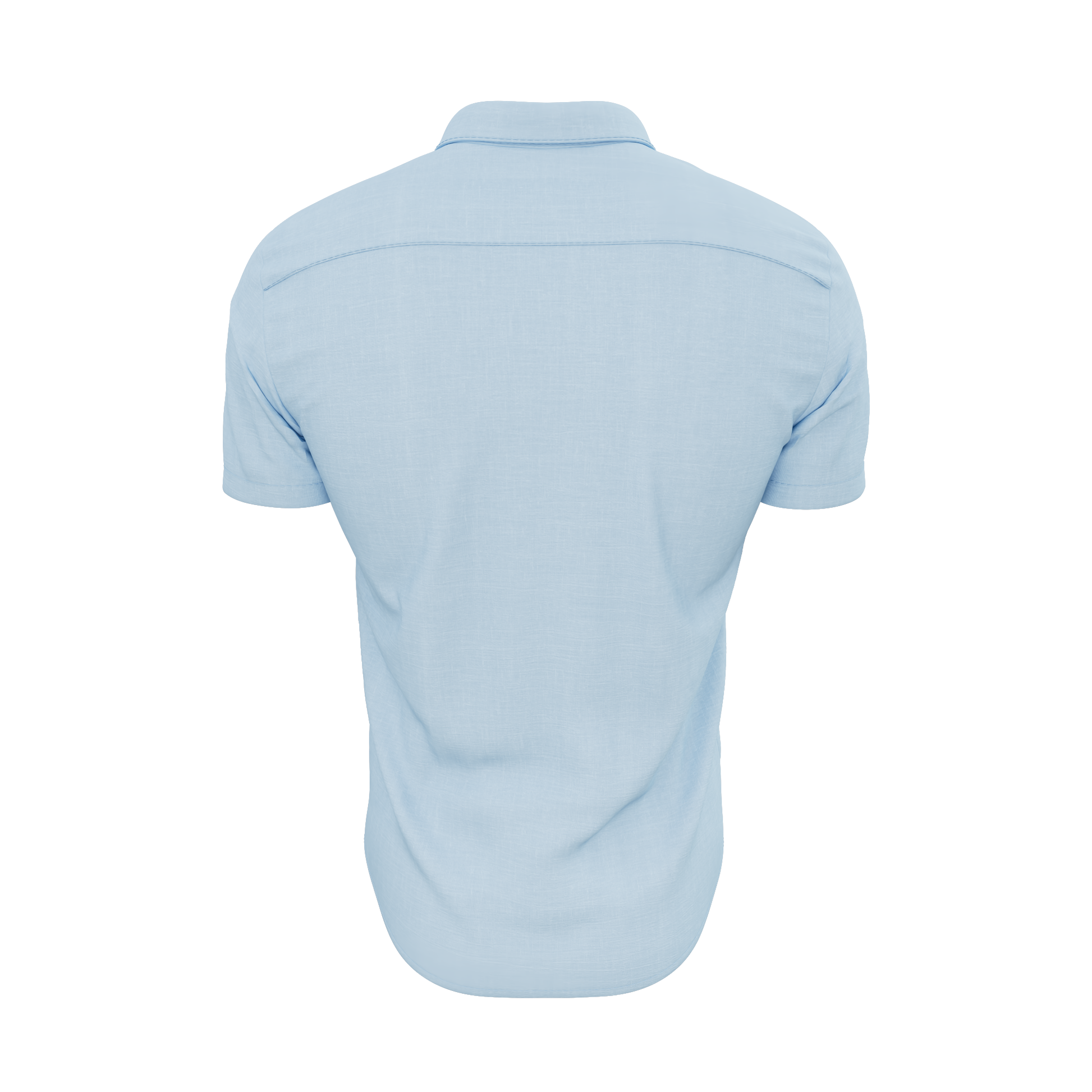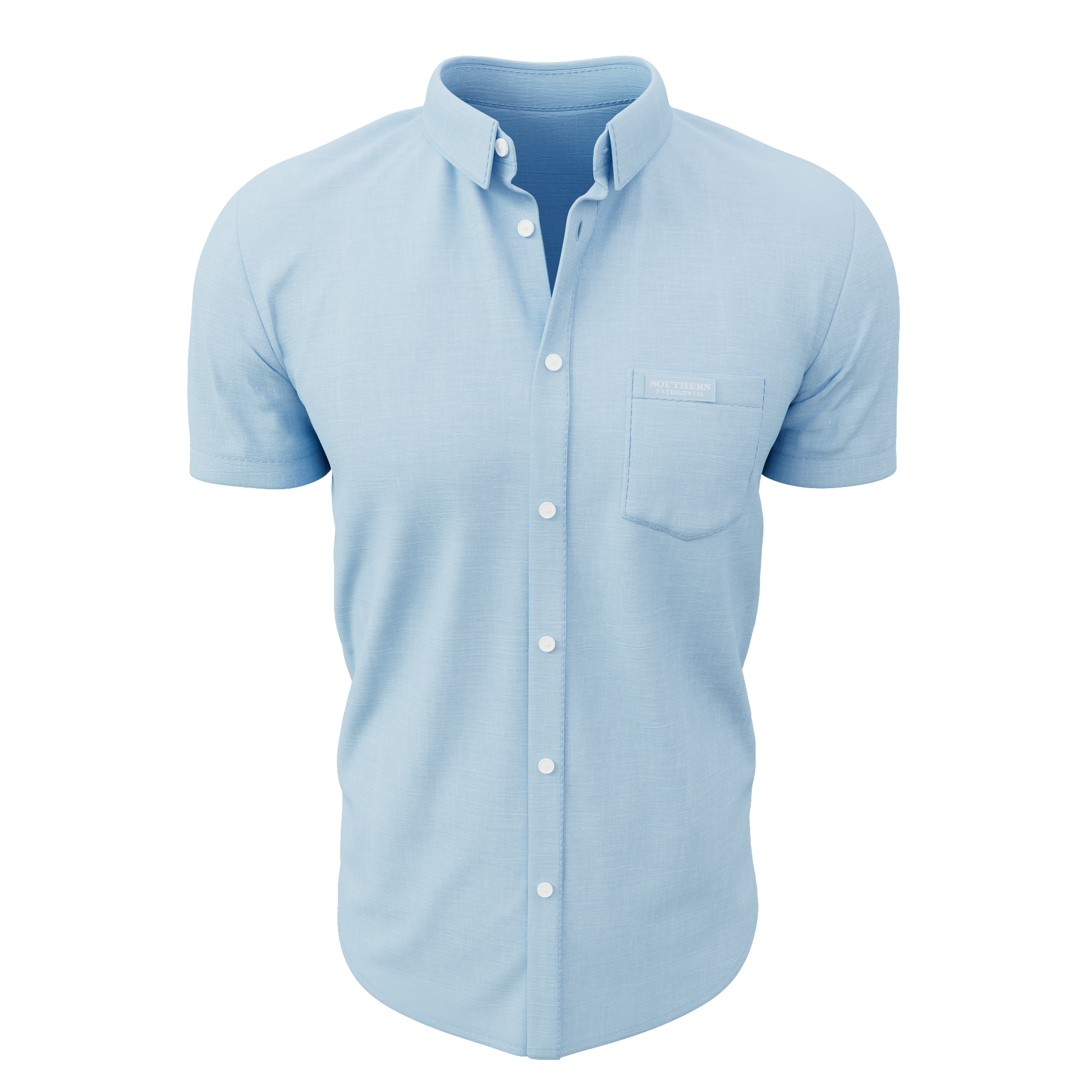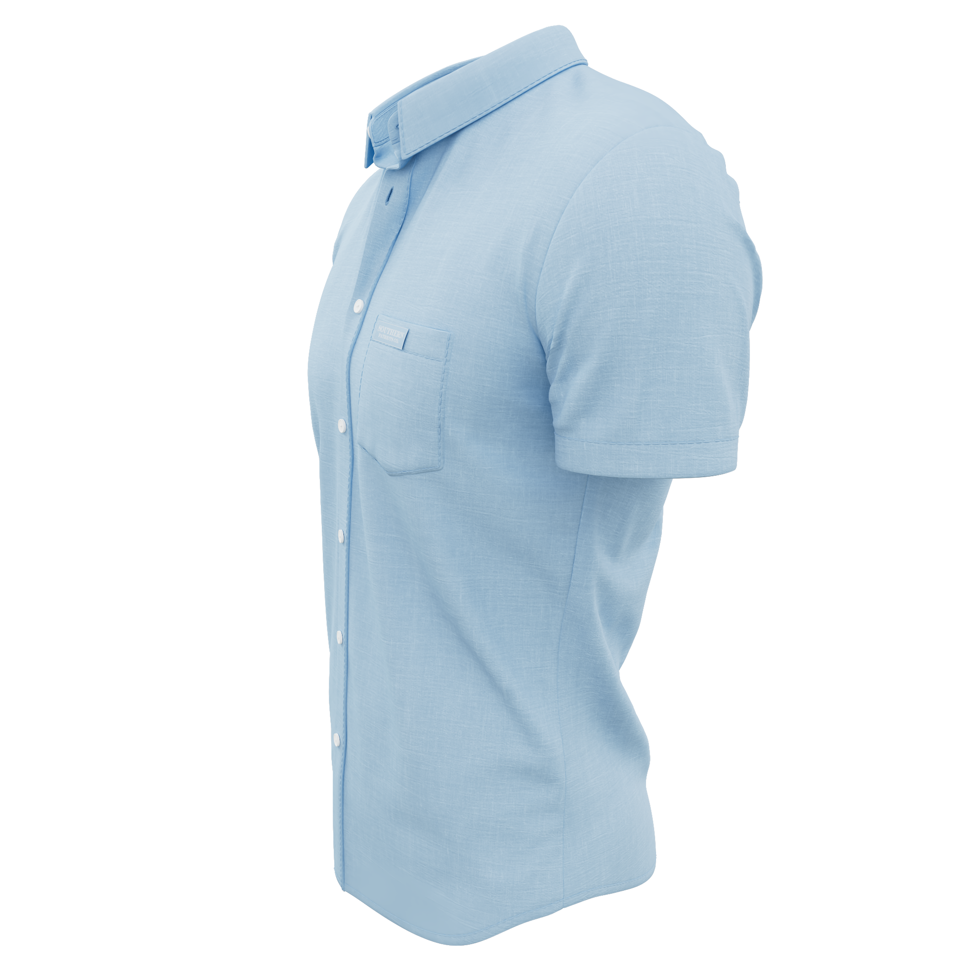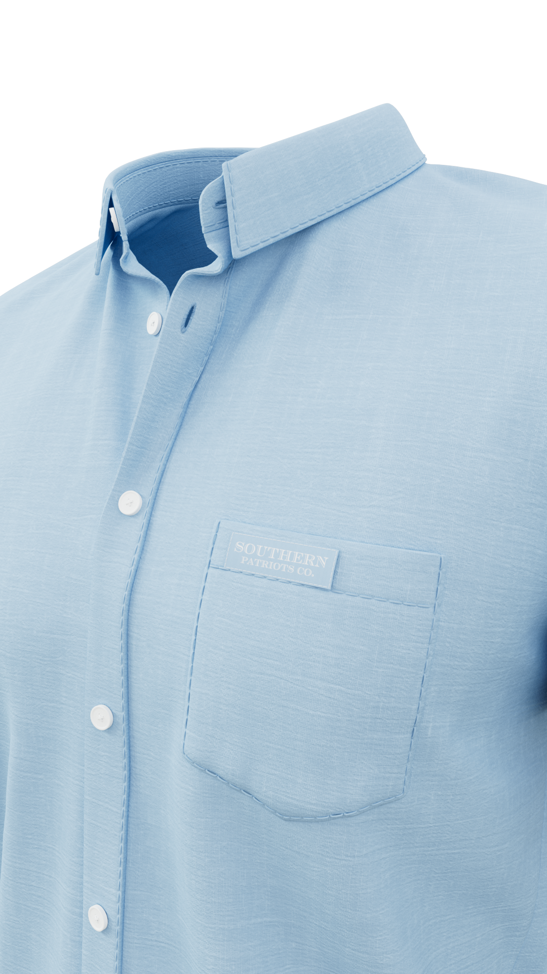Our Carolina Blue button down polo shirt. It is 92% Poly, 8% Spandex. It is stretchy, durable, quick drying, moisture wicking, and it is UV 50+.
