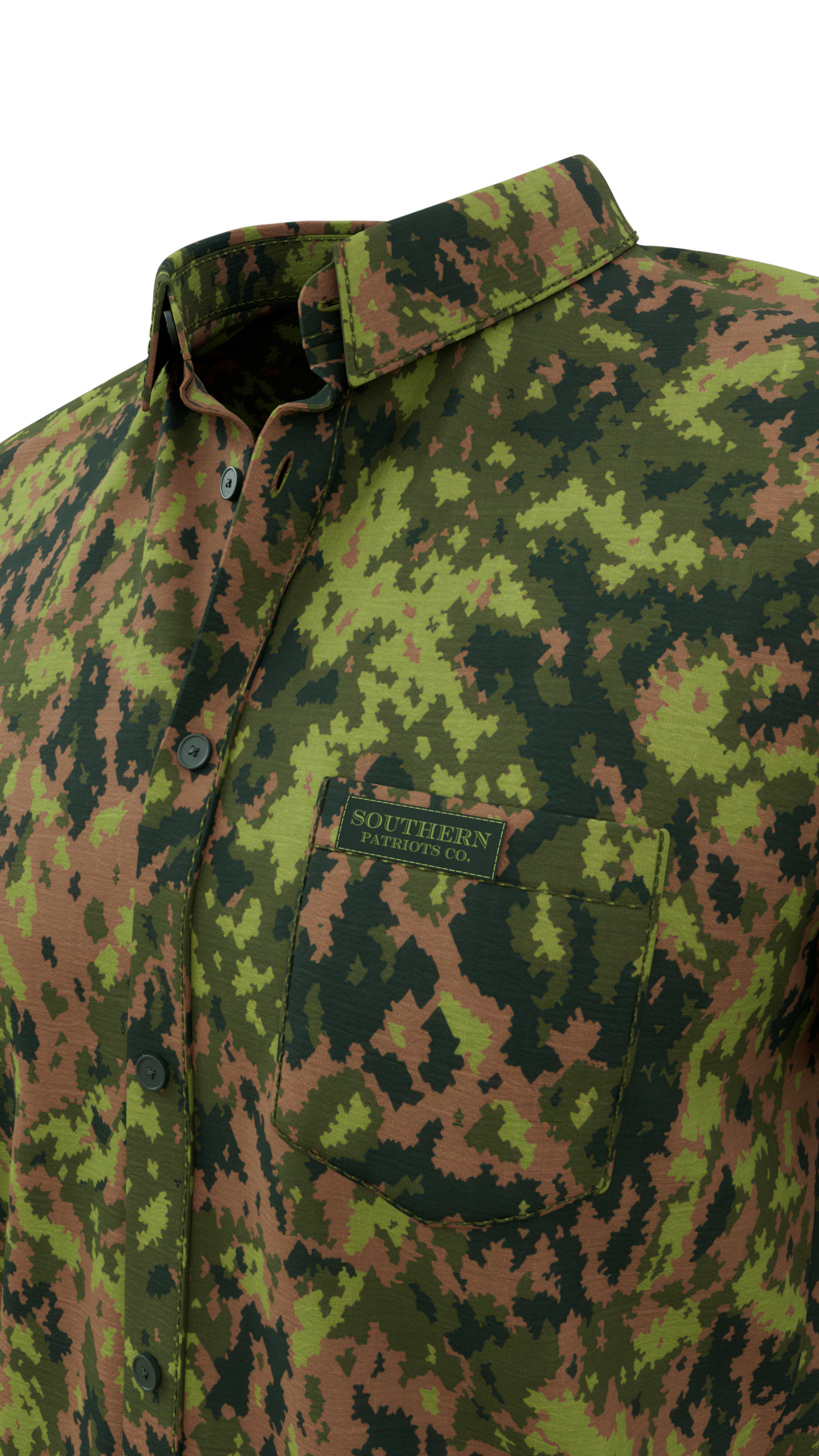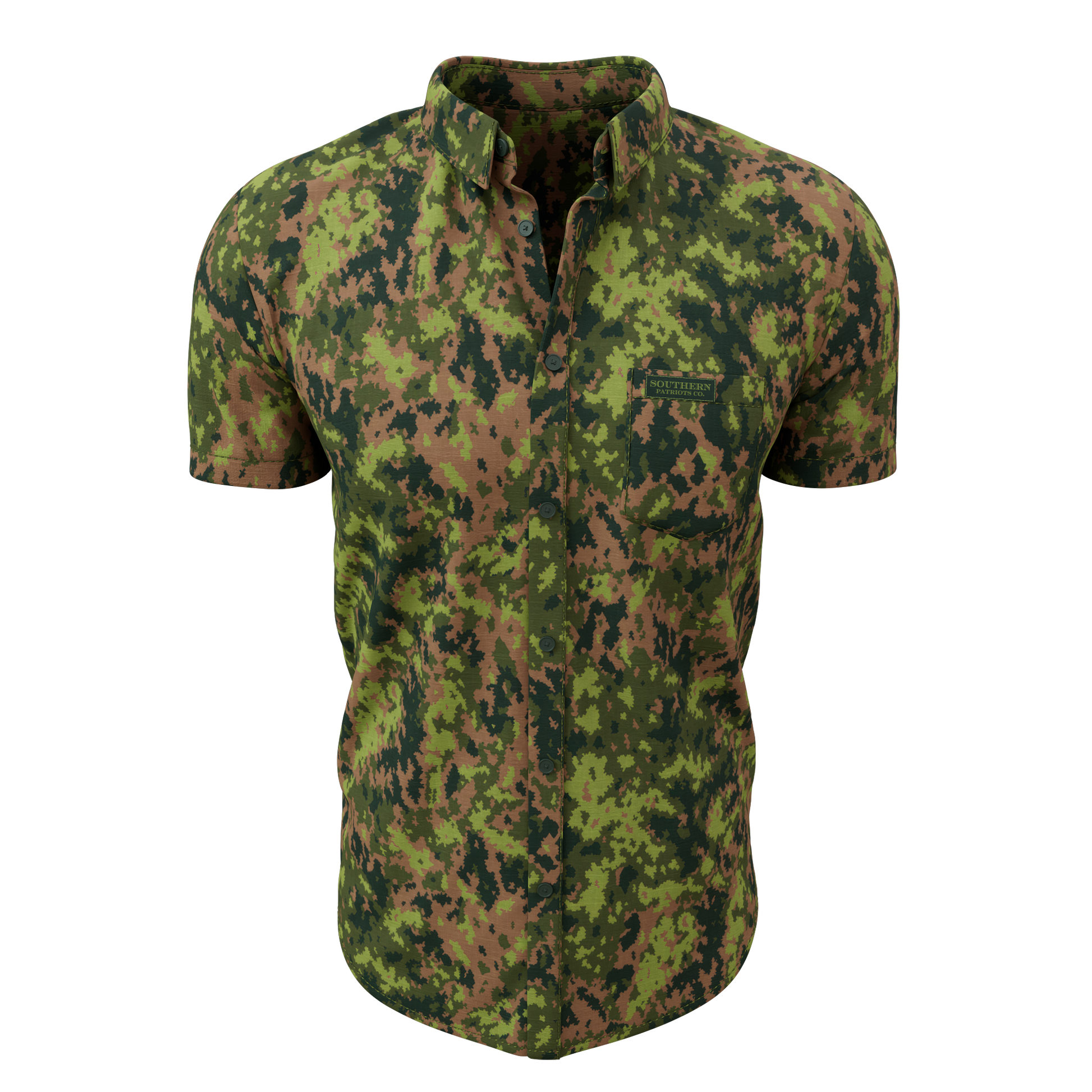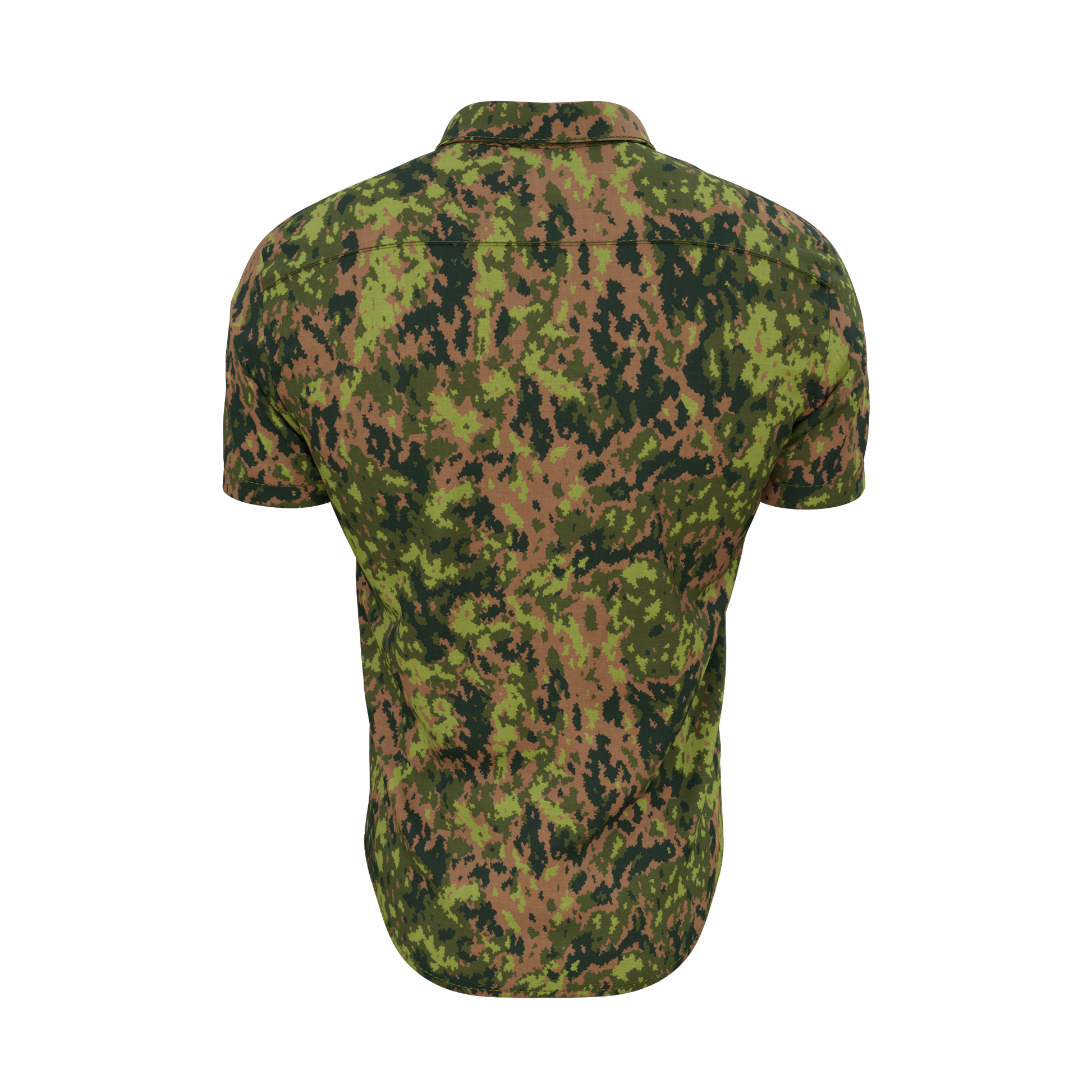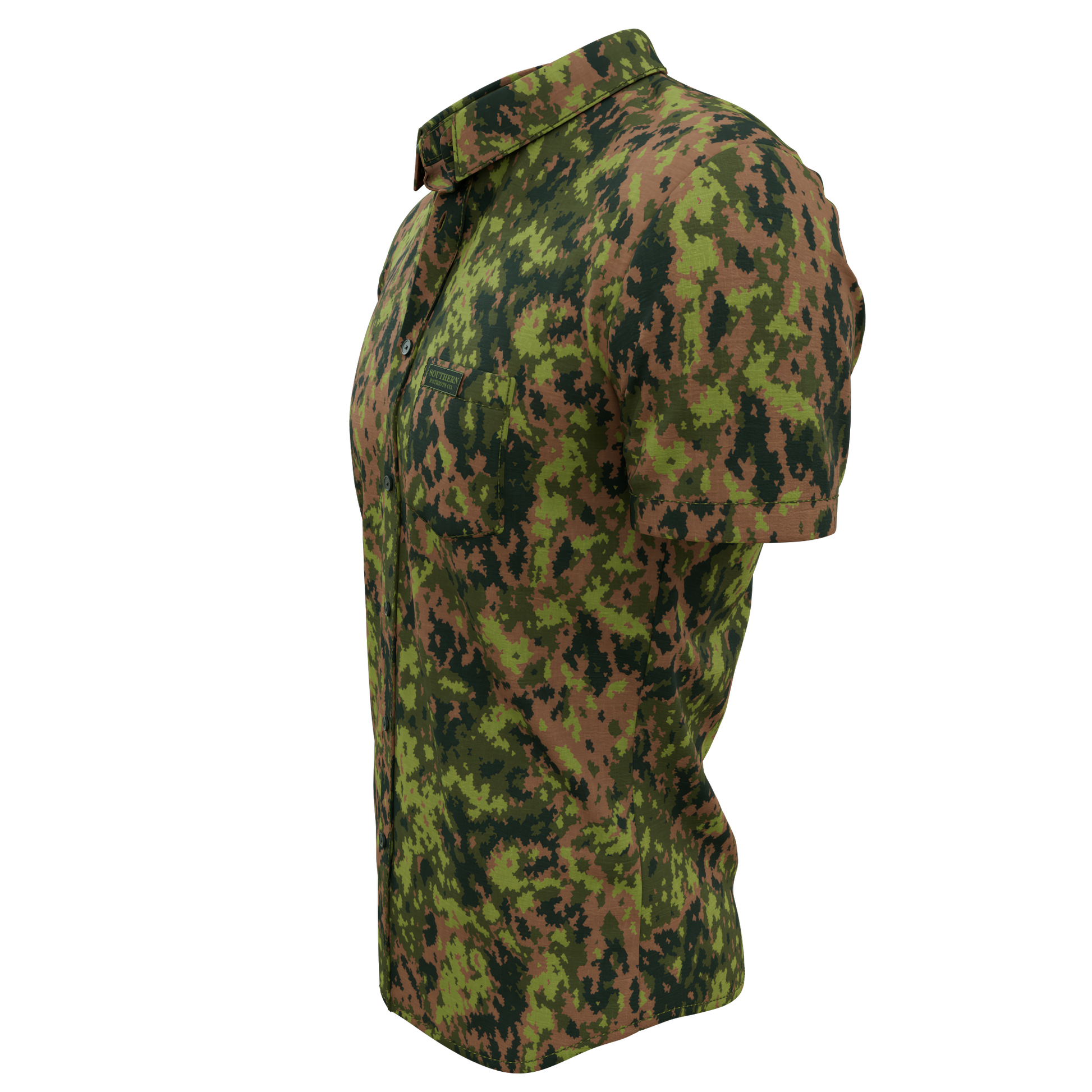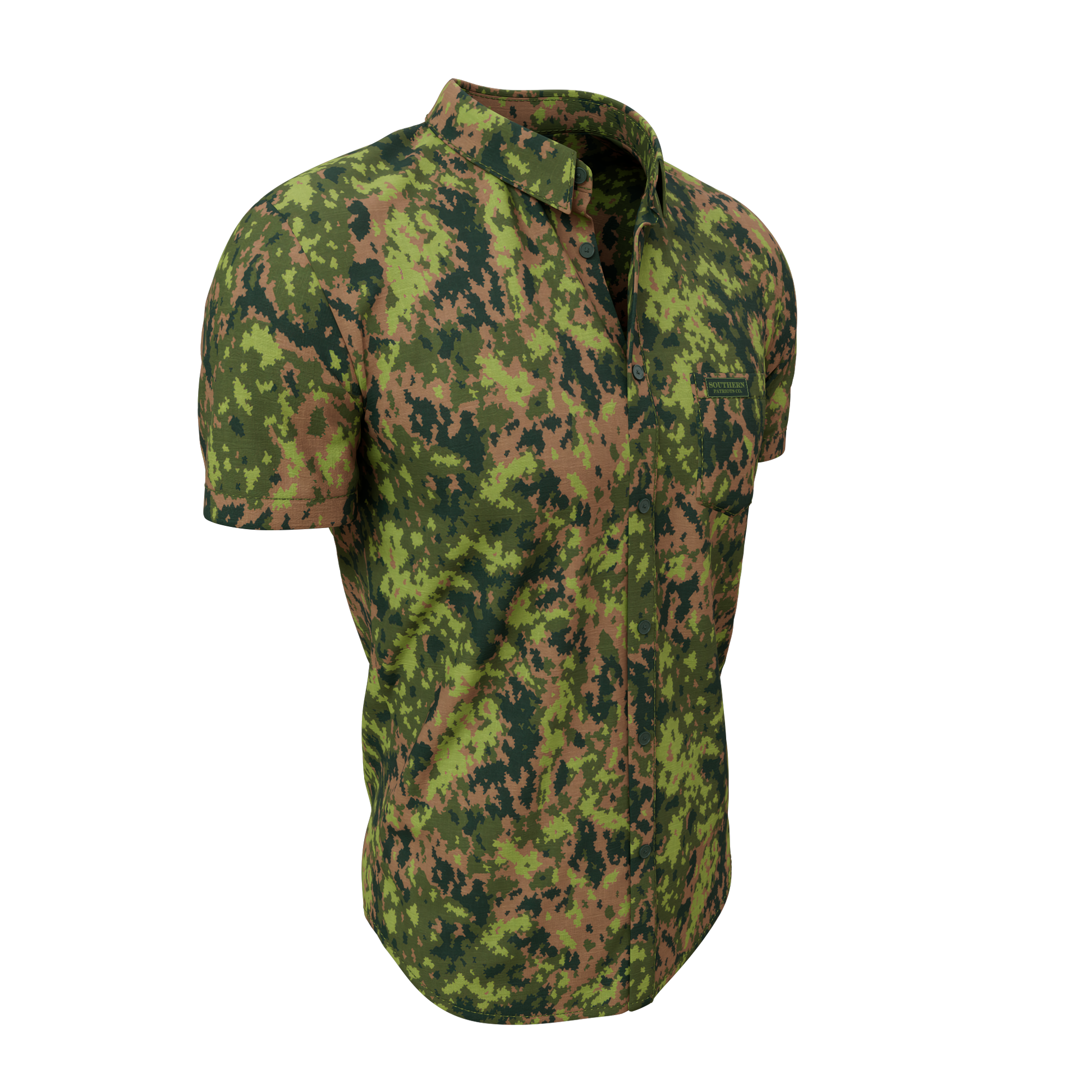 Finnish M05 Woodland Pattern. Often referred to as “Relish.” It is 92% Poly, 8% Spandex. It is stretchy, durable, quick drying, moisture wicking, and it is UV 50+.