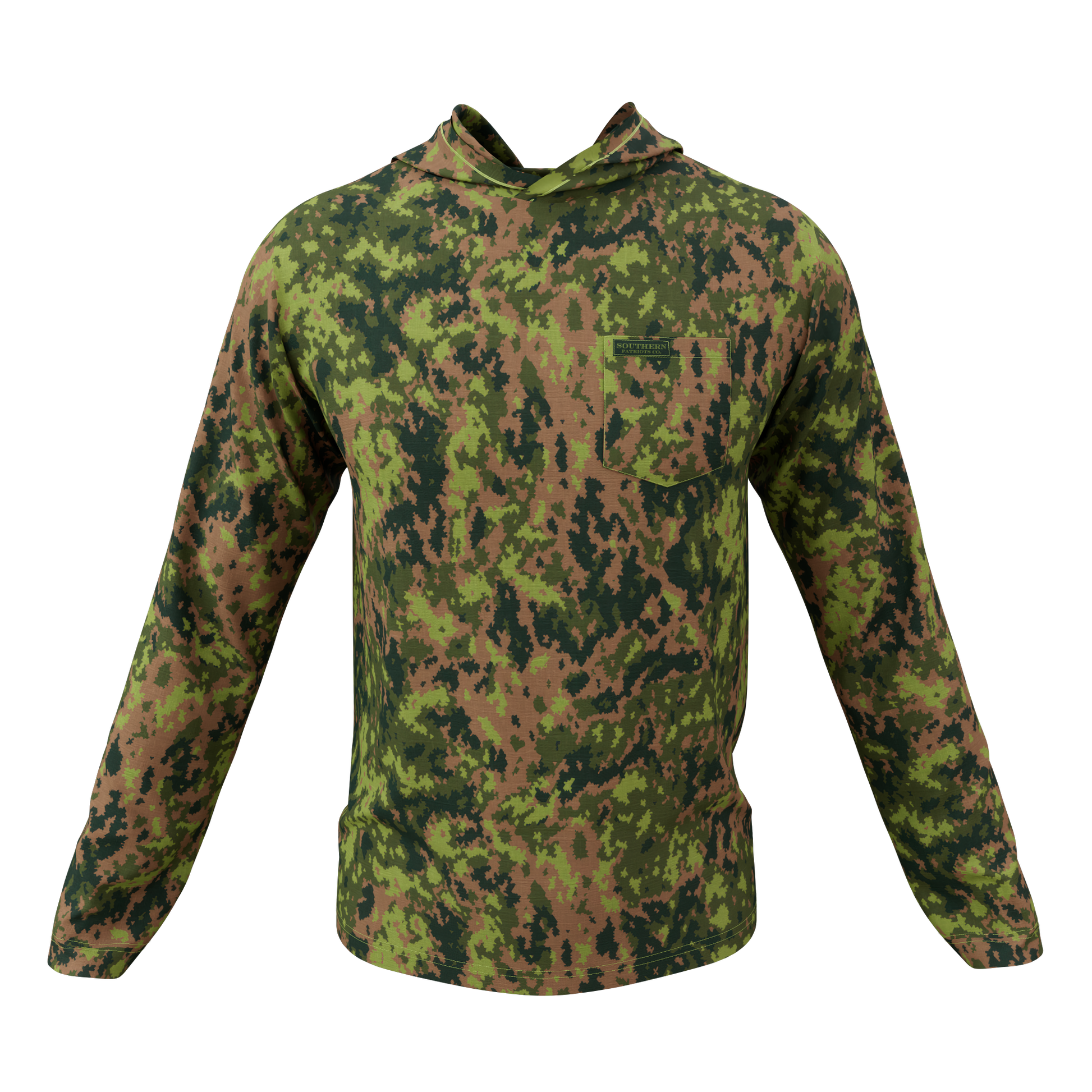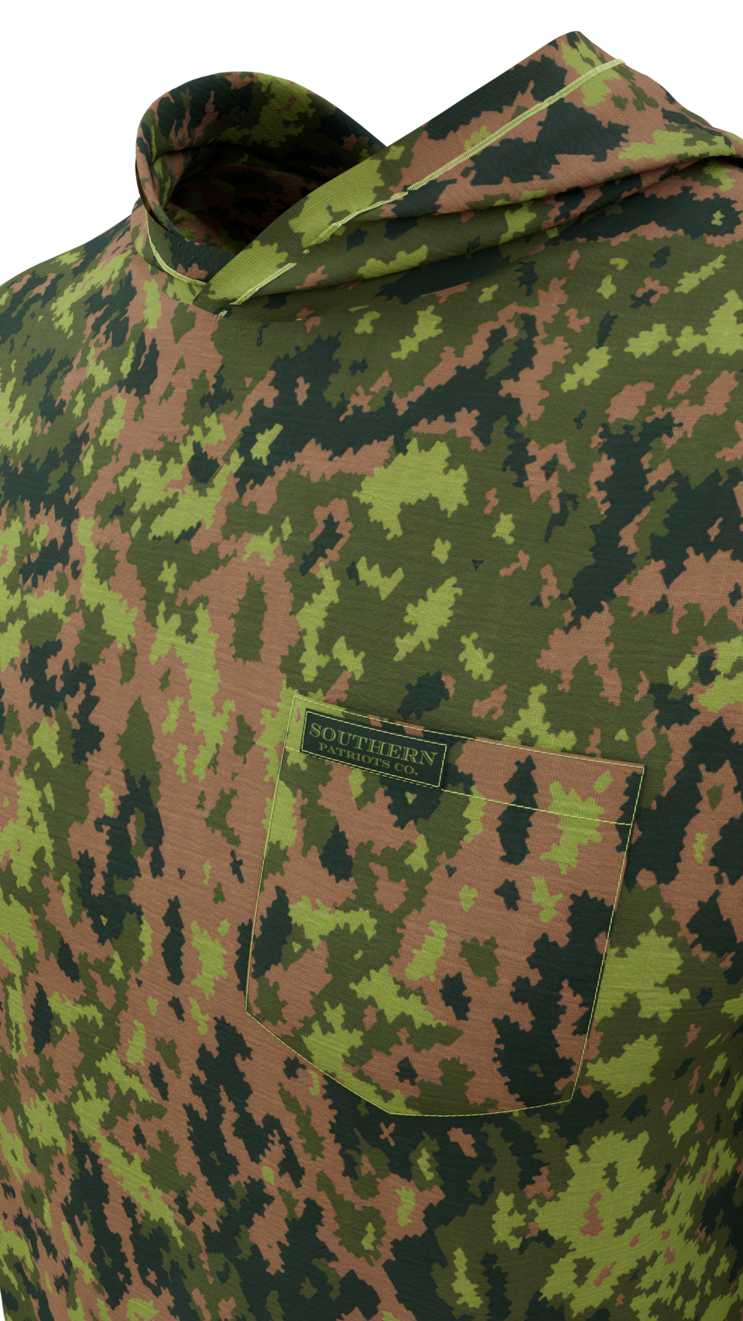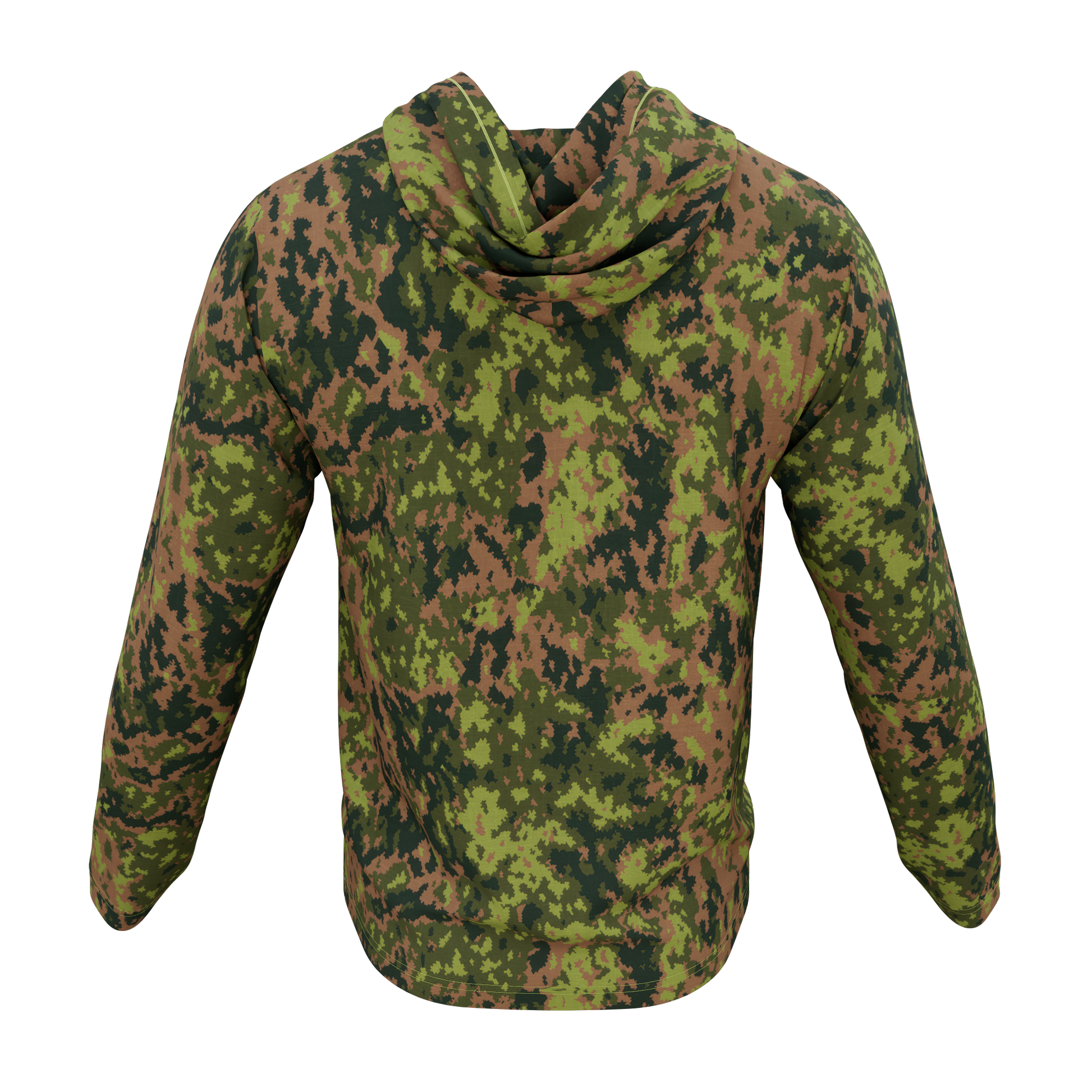 Finnish M05 Woodland Pattern. Often referred to as “Relish.” It is 92% Poly, 8% Spandex. It is stretchy, durable, quick drying, moisture wicking, and it is UV 50+.