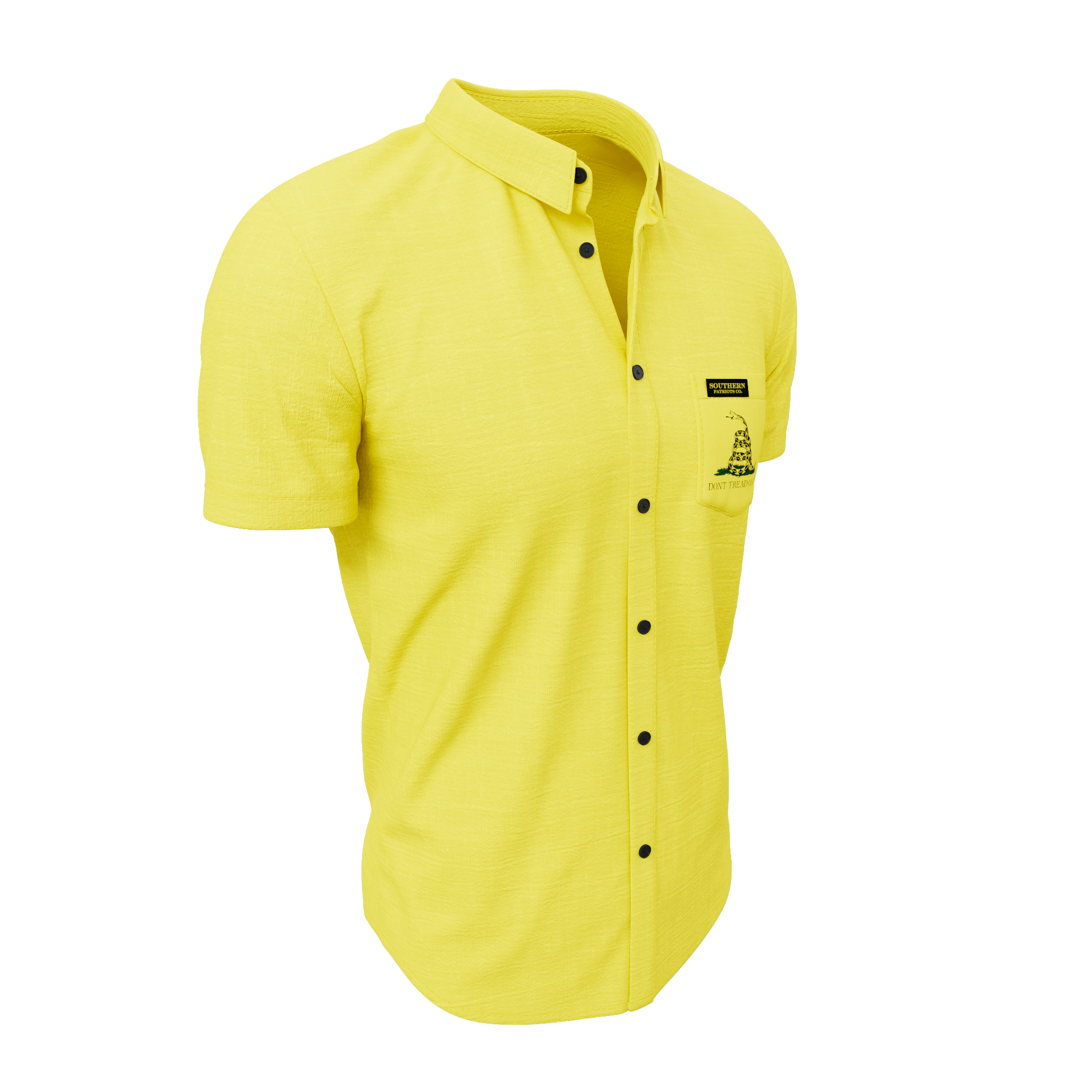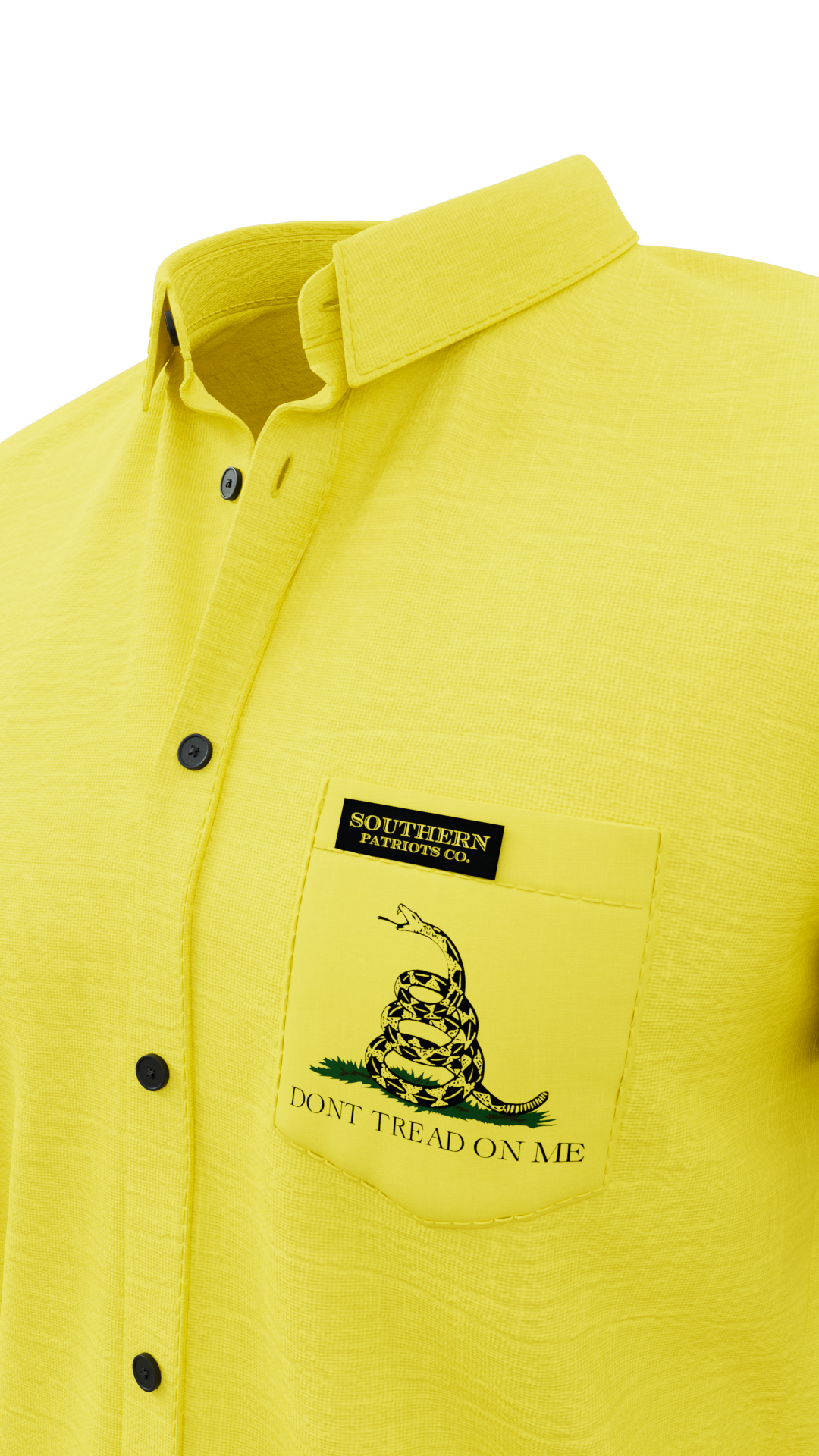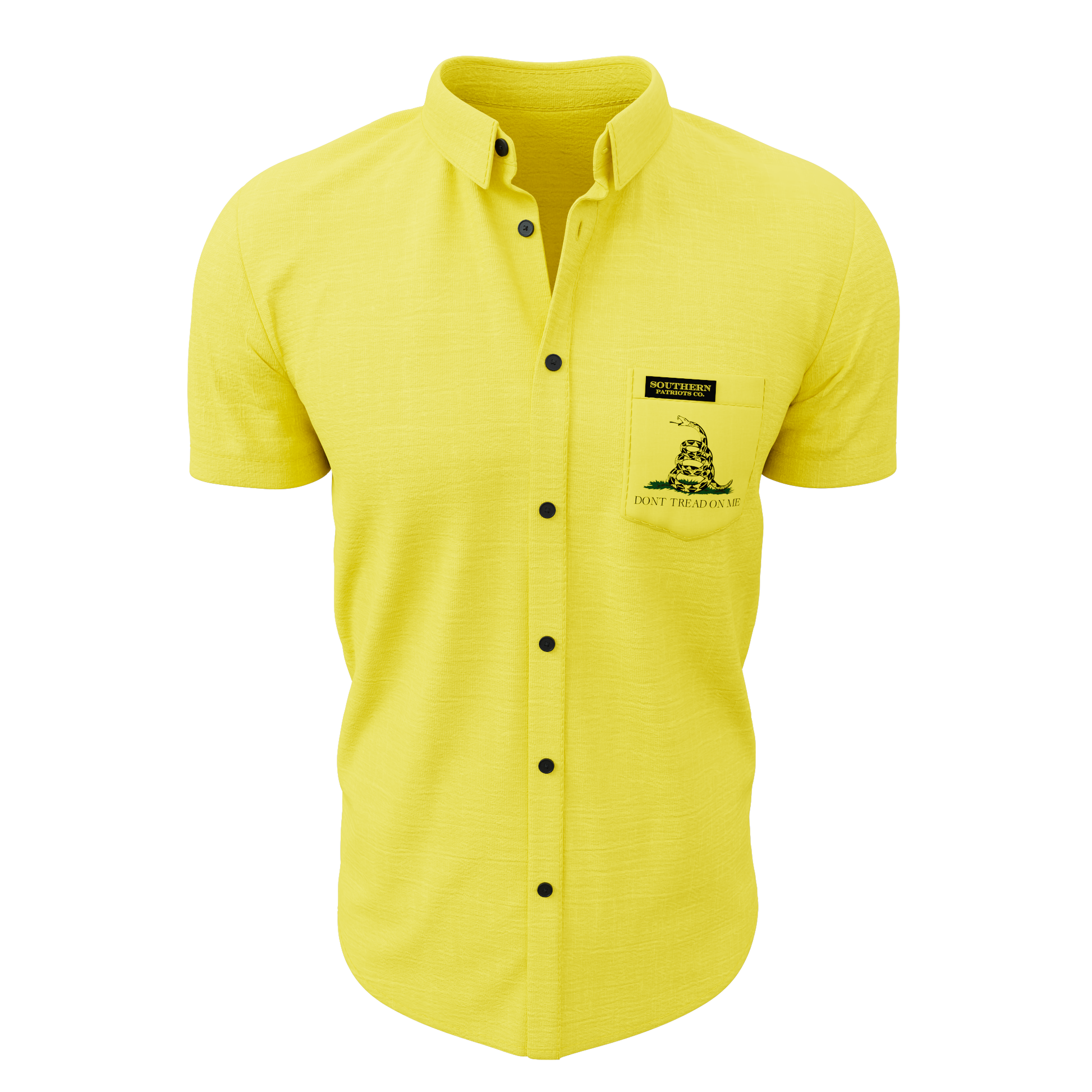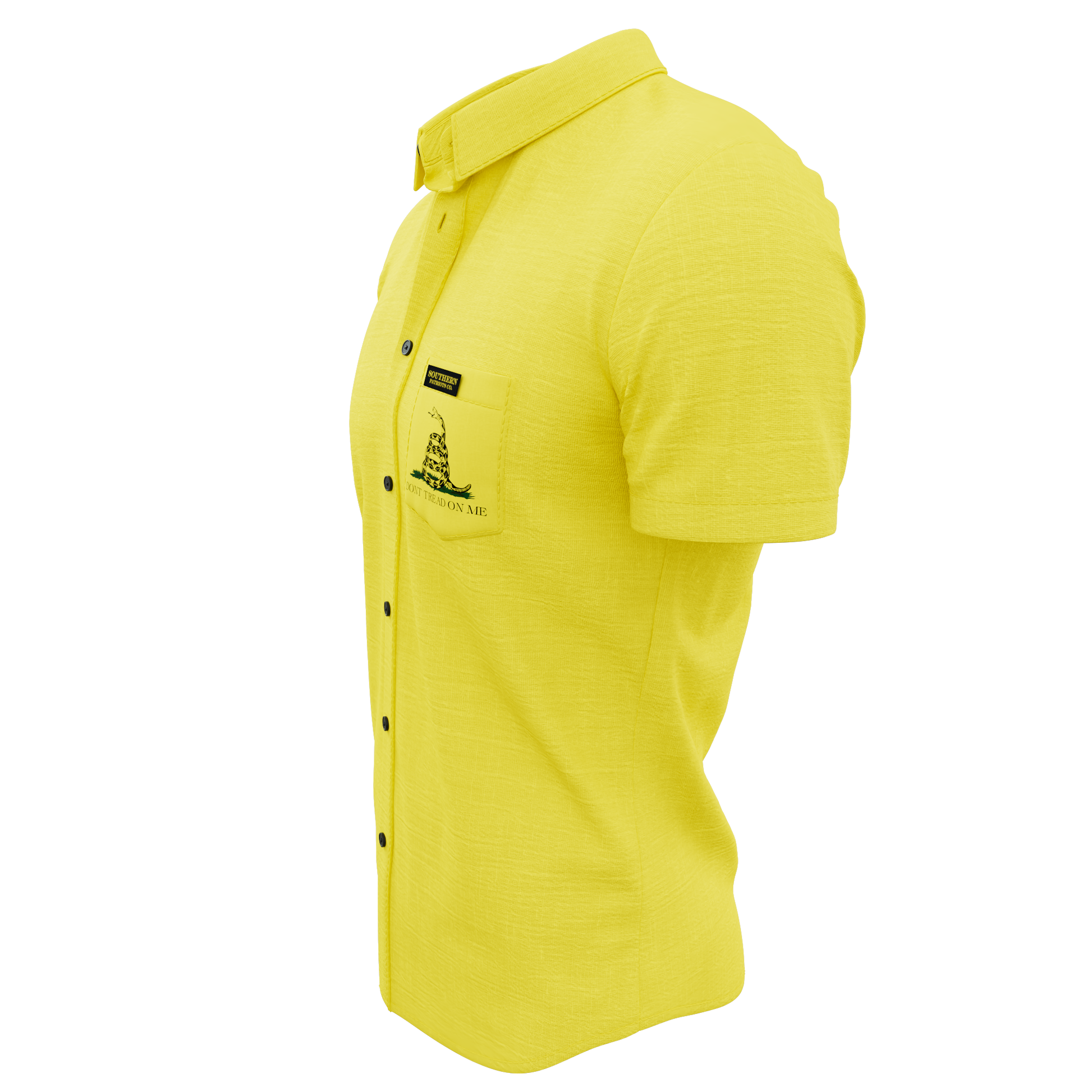 A yellow Gadsden flag themed polo shirt. Symbolizing unity among the 13 colonies and a stern warning/willingness to act in defense against British colonialism and coercion. The rattlesnake symbolizing that the United States will not bite unless provoked. It is 92% Poly, 8% Spandex. It is stretchy, durable, quick drying, moisture wicking, and it is UV 50+.