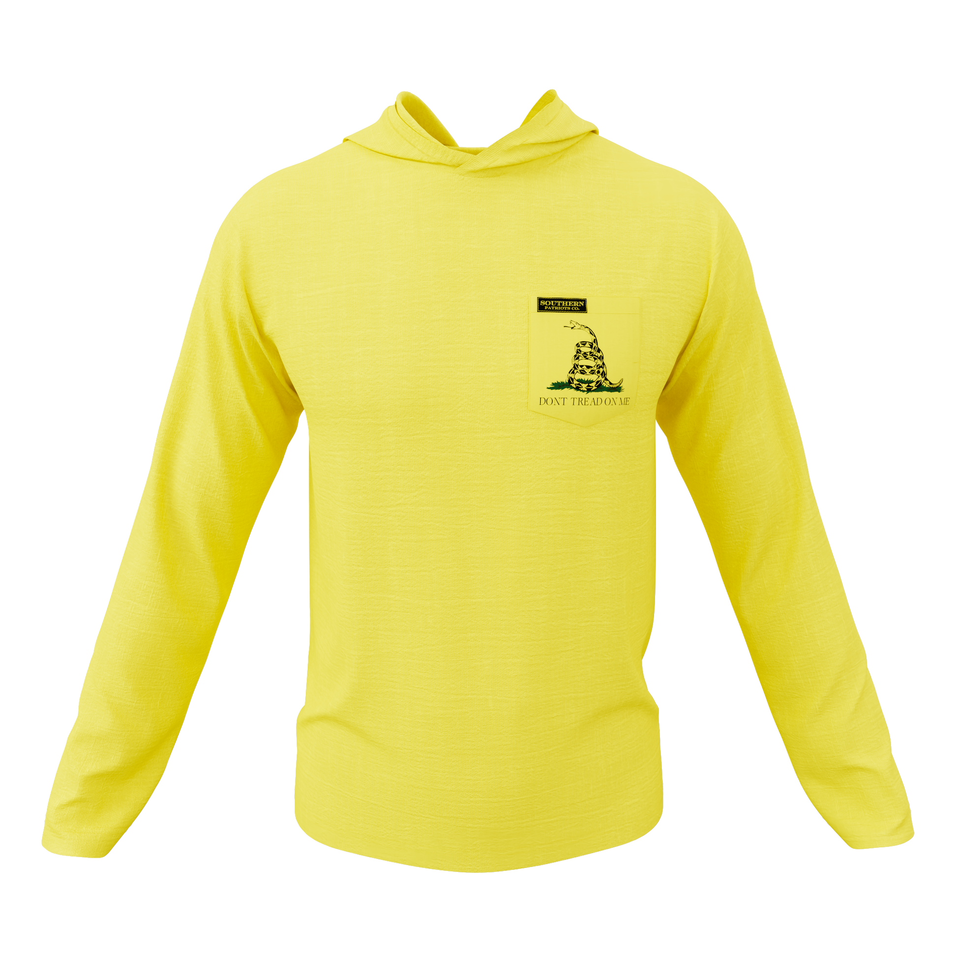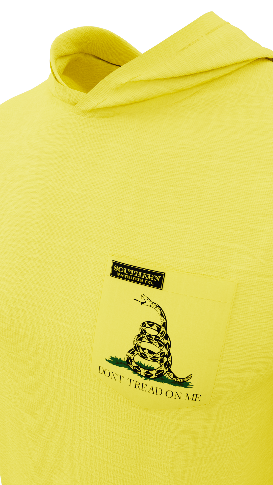 A yellow Gadsden flag themed lightweight hoodie. Symbolizing unity among the 13 colonies and a stern warning/willingness to act in defense against British colonialism and coercion. The rattlesnake symbolizing that the United States will not bite unless provoked. It is 92% Poly, 8% Spandex. It is stretchy, durable, quick drying, moisture wicking, and it is UV 50+.