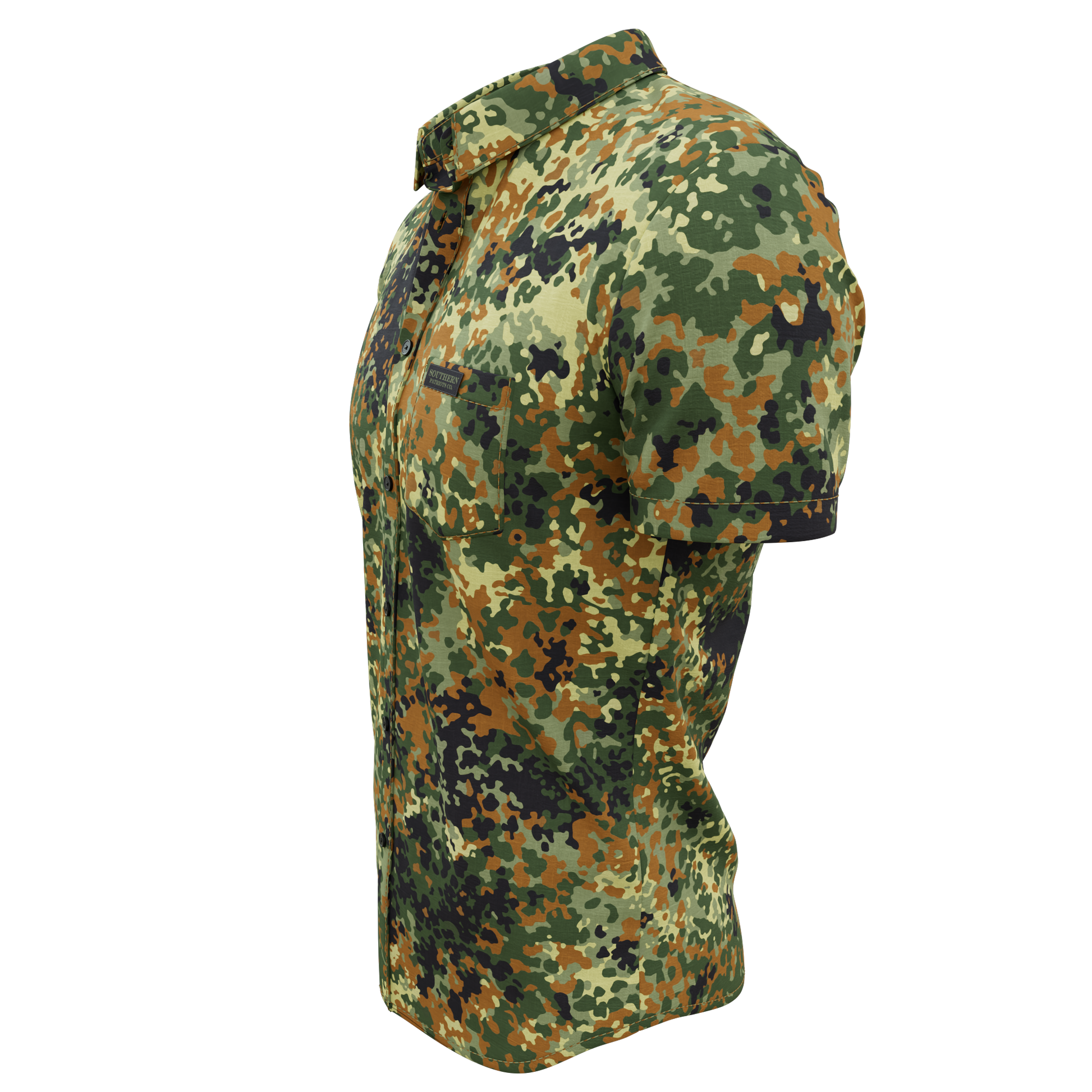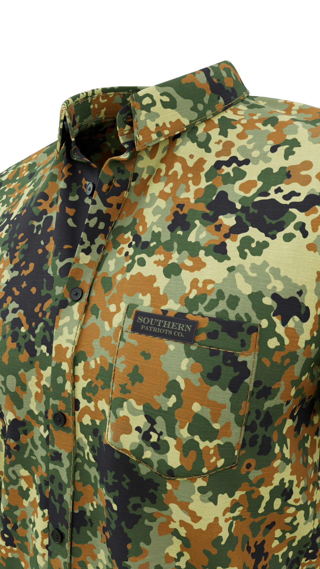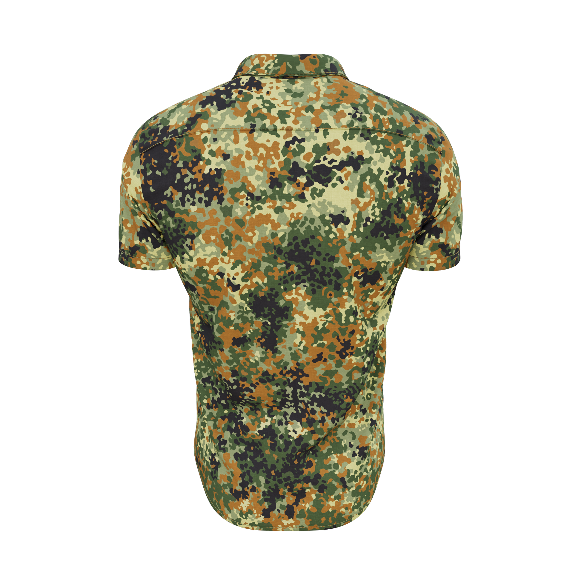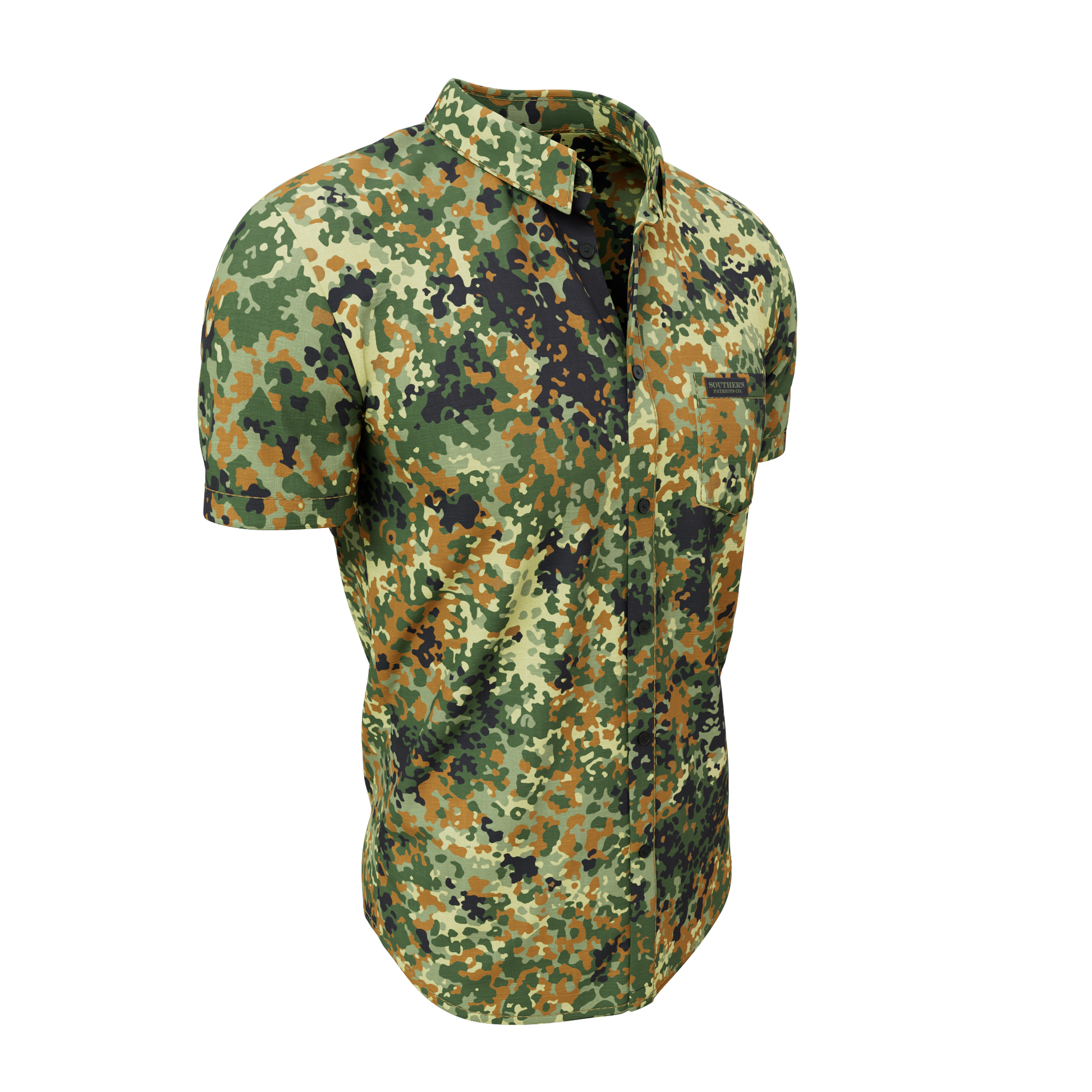 Our version of German Flecktarn. It is 92% Poly, 8% Spandex. It is stretchy, durable, quick drying, moisture wicking, and it is UV 50+.