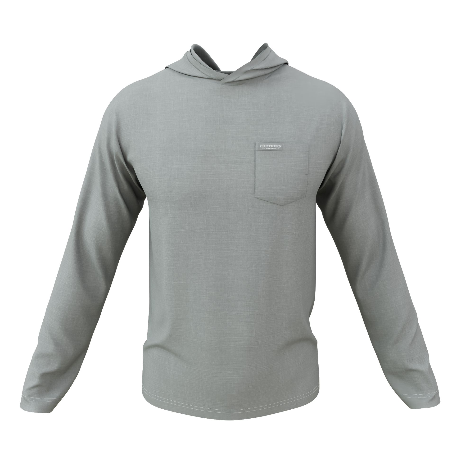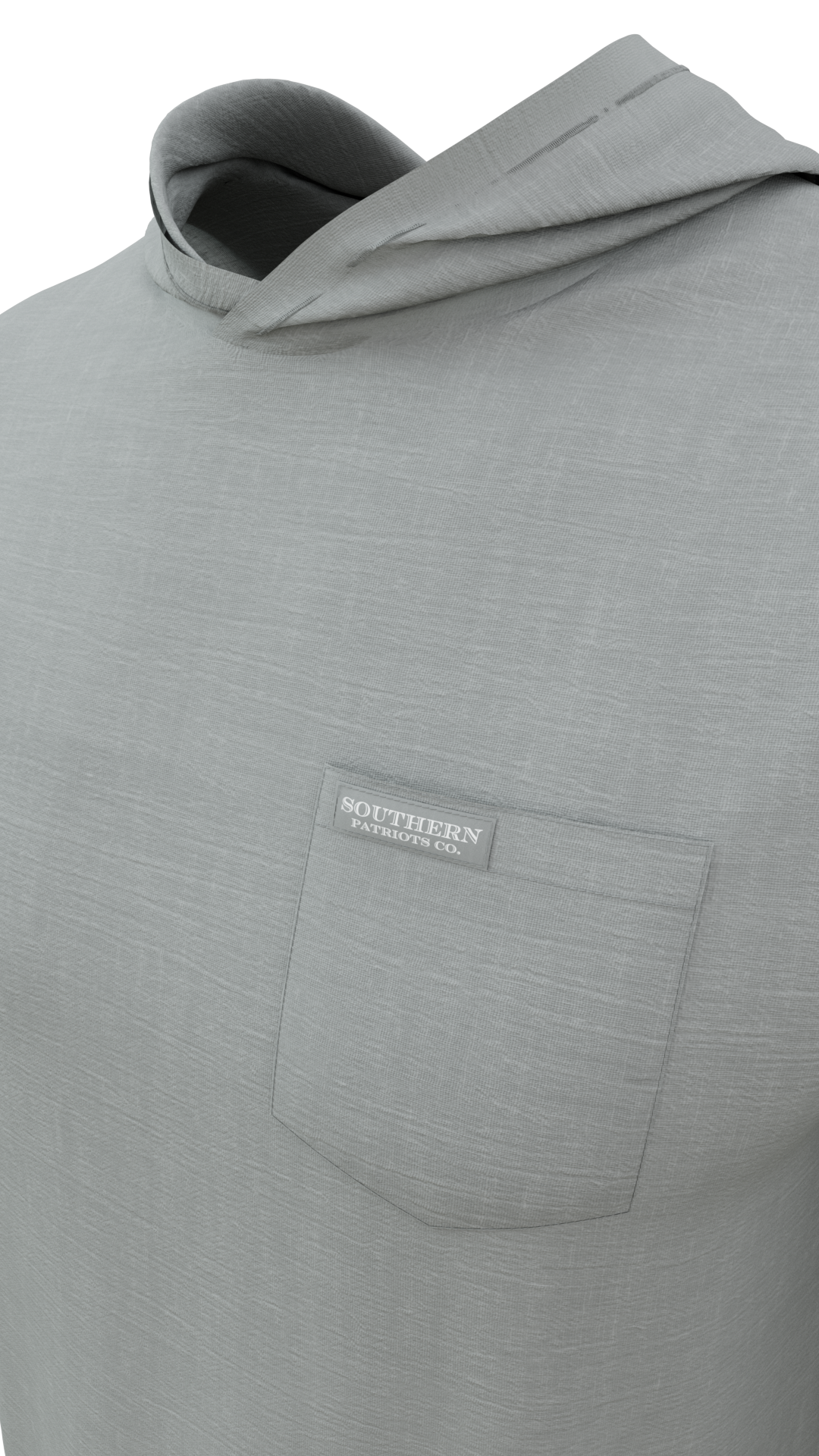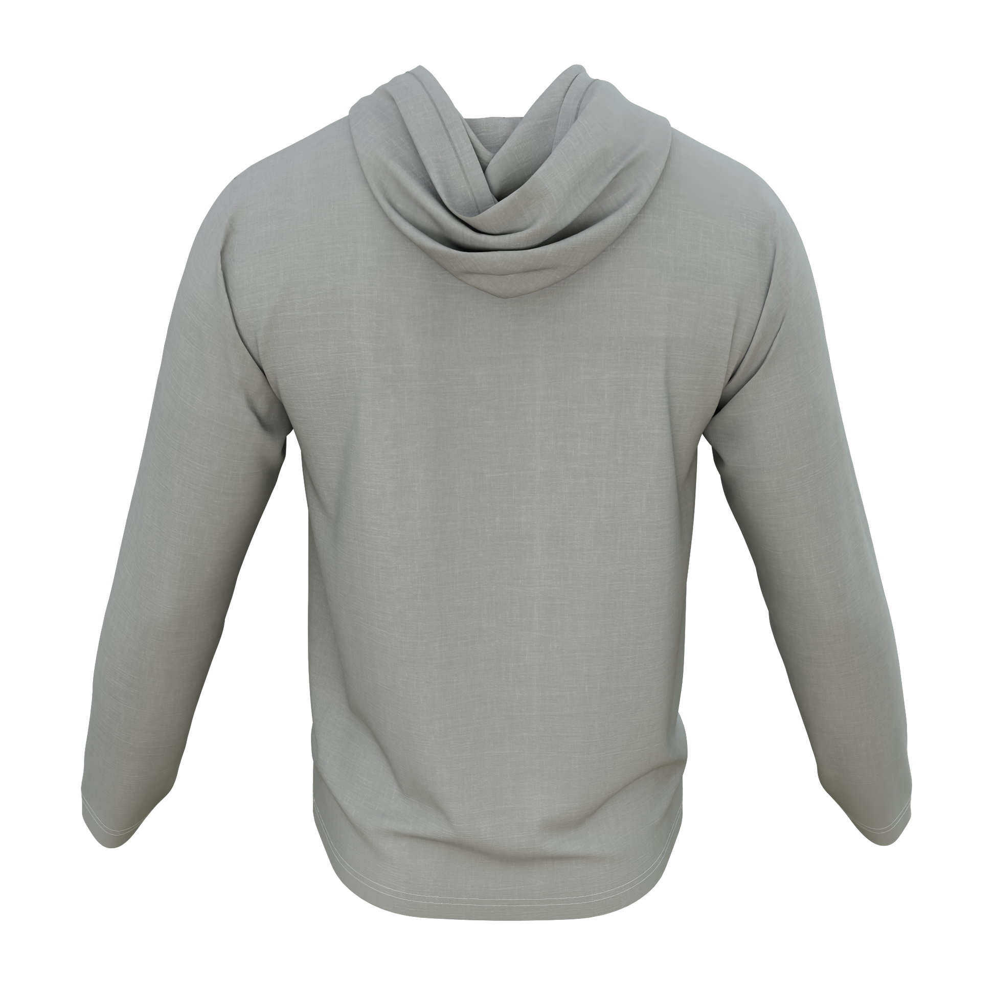 Our Gray lightweight hoodie. It is 92% Poly, 8% Spandex. It is stretchy, durable, quick drying, moisture wicking, and it is UV 50+.