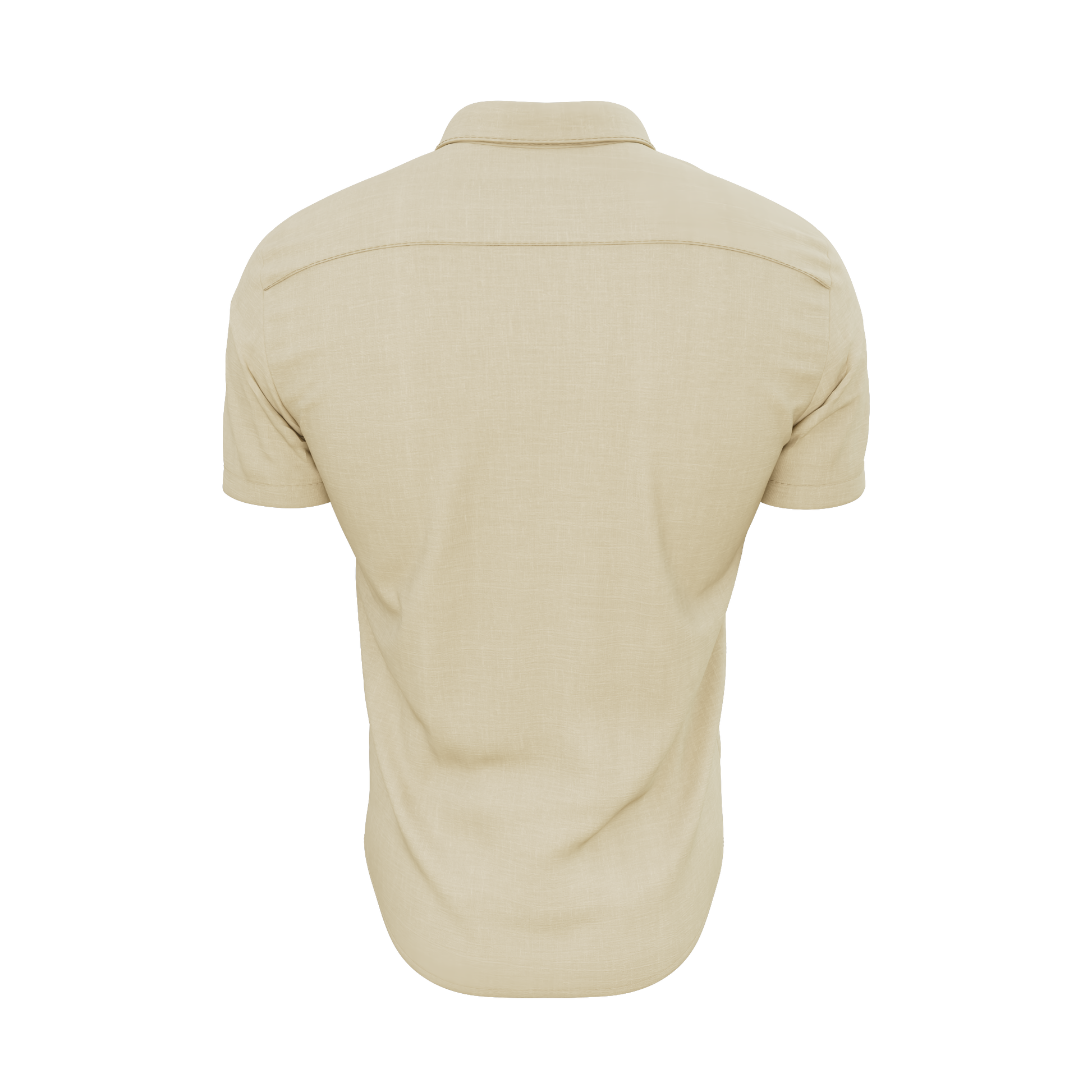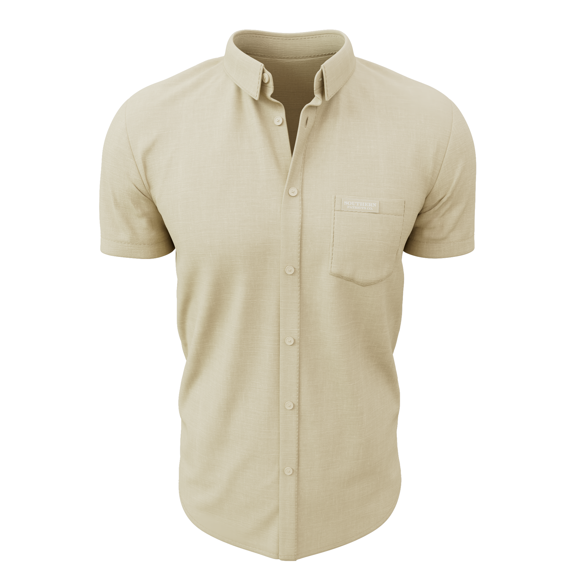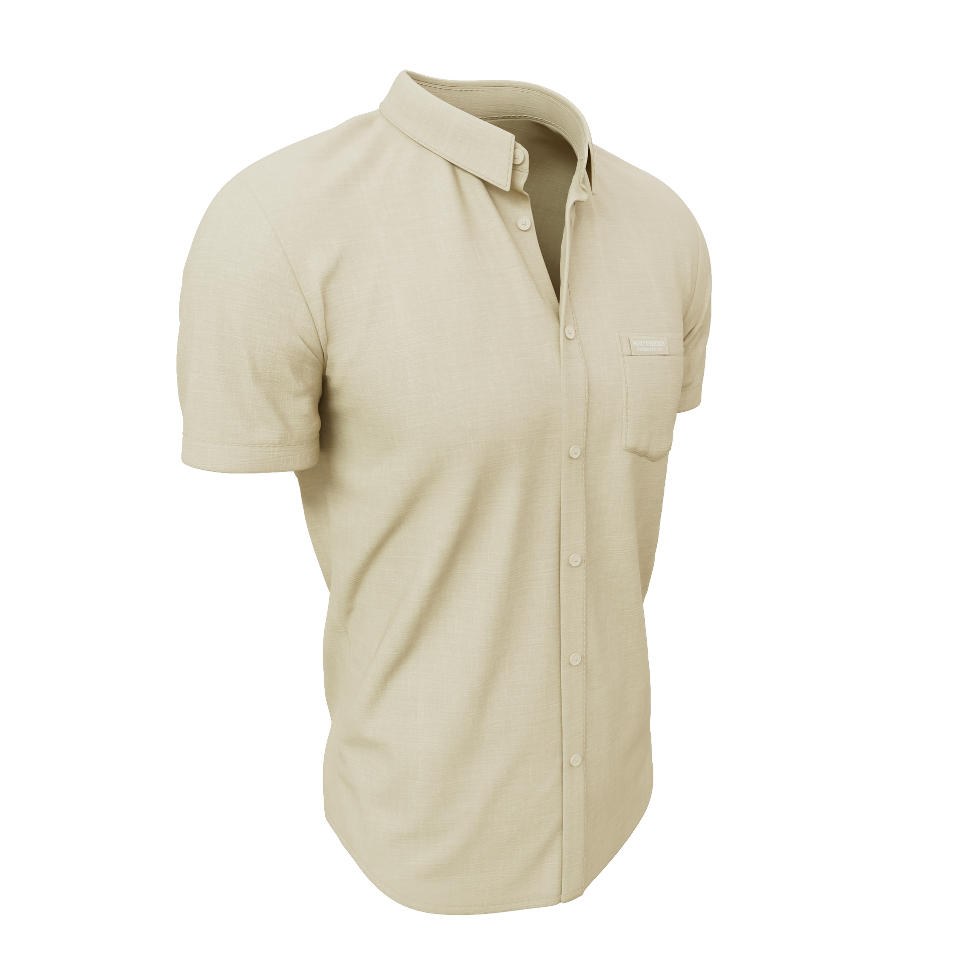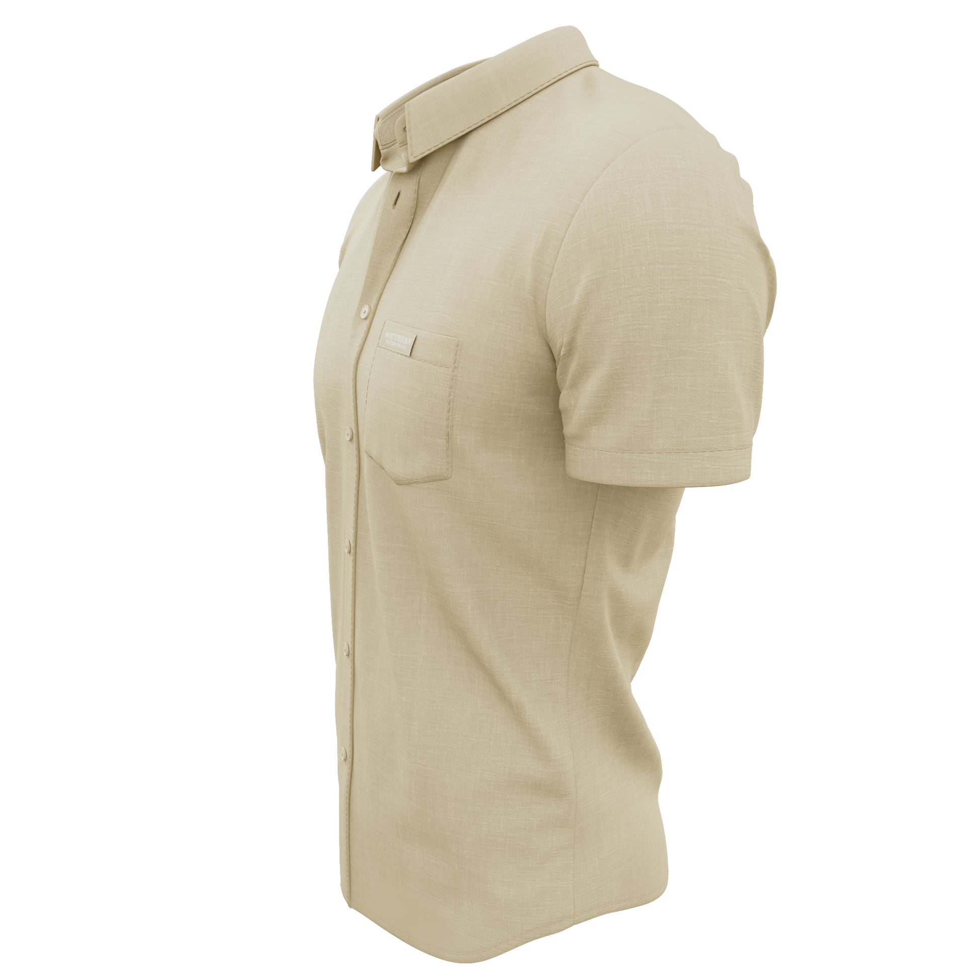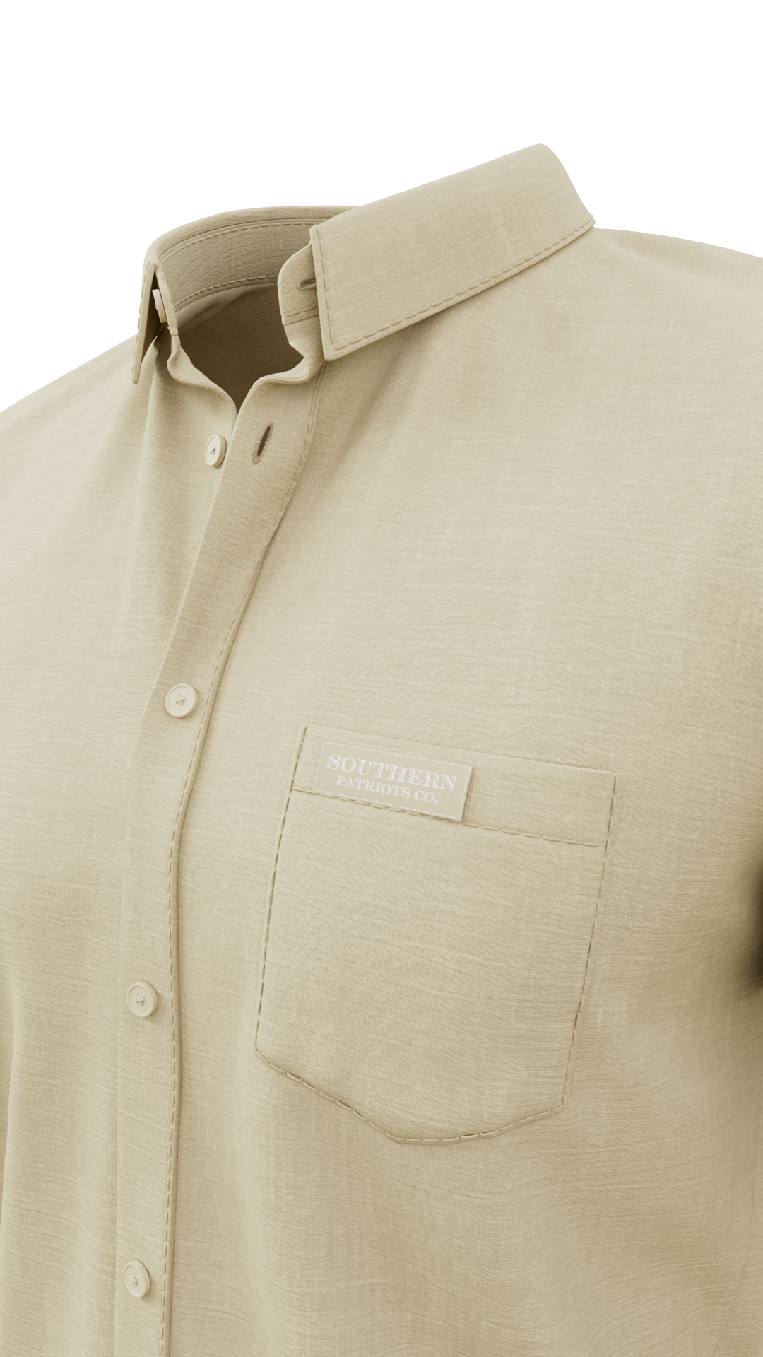 Our Khaki button down polo shirt. It is 92% Poly, 8% Spandex. It is stretchy, durable, quick drying, moisture wicking, and it is UV 50+.