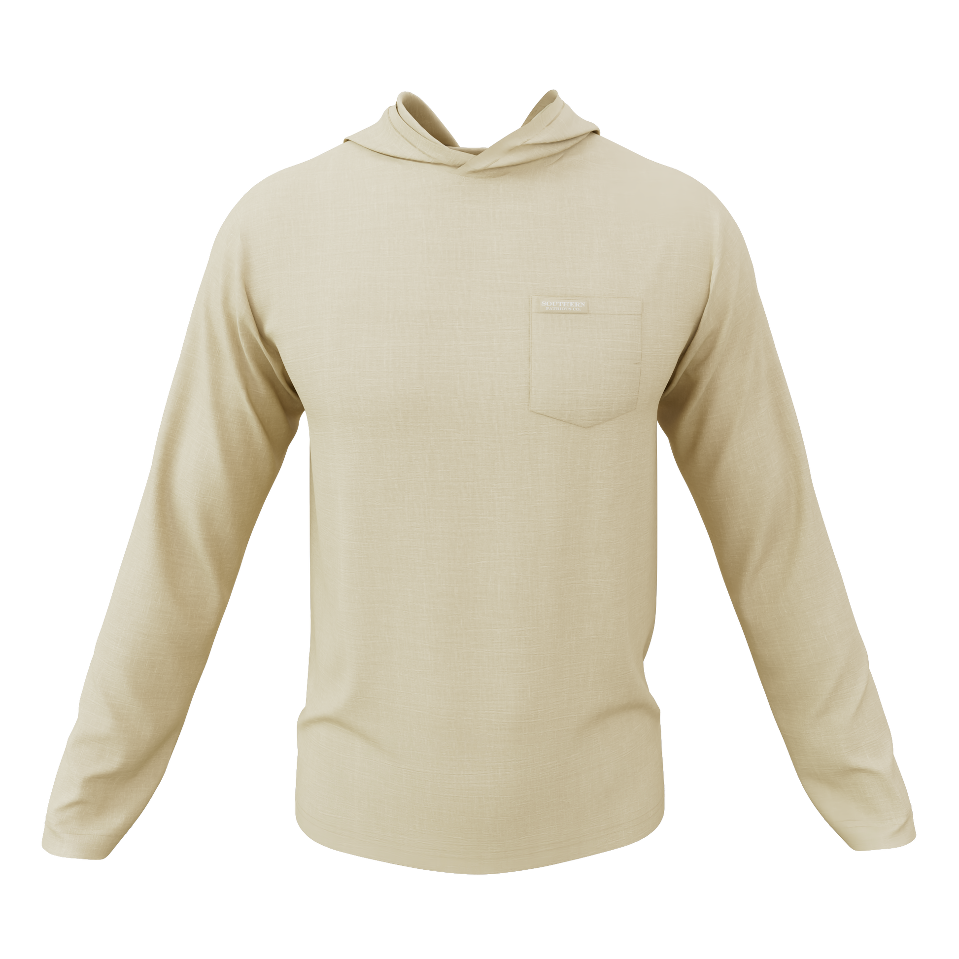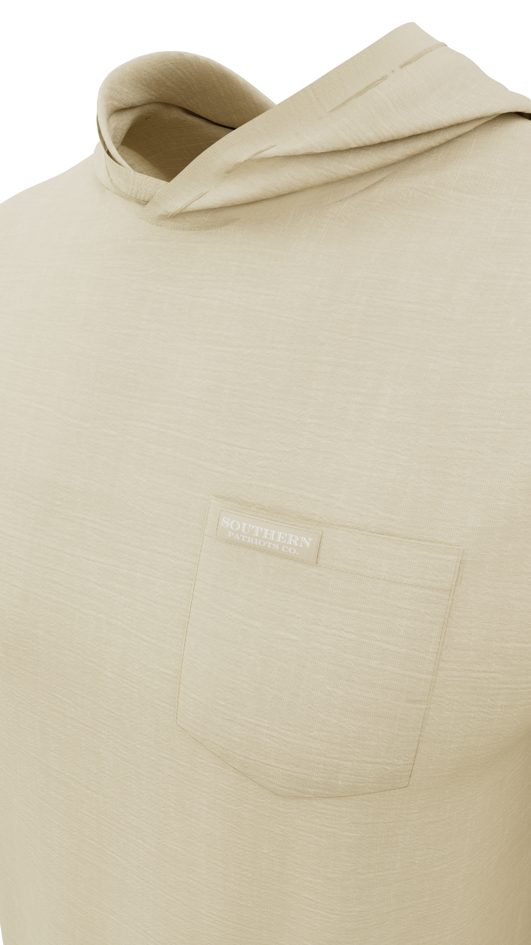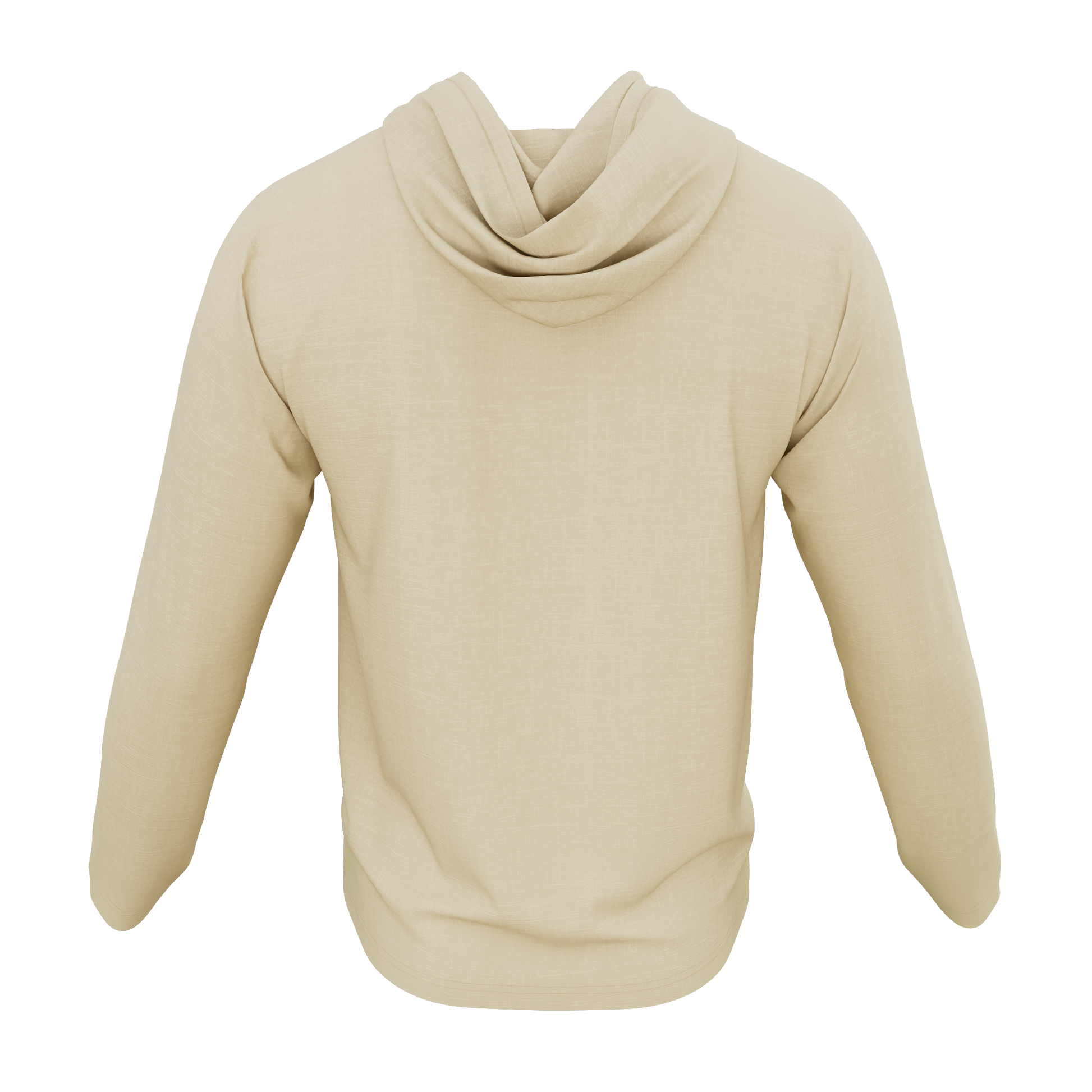 Our Khaki lightweight hoodie. It is 92% Poly, 8% Spandex. It is stretchy, durable, quick drying, moisture wicking, and it is UV 50+.
