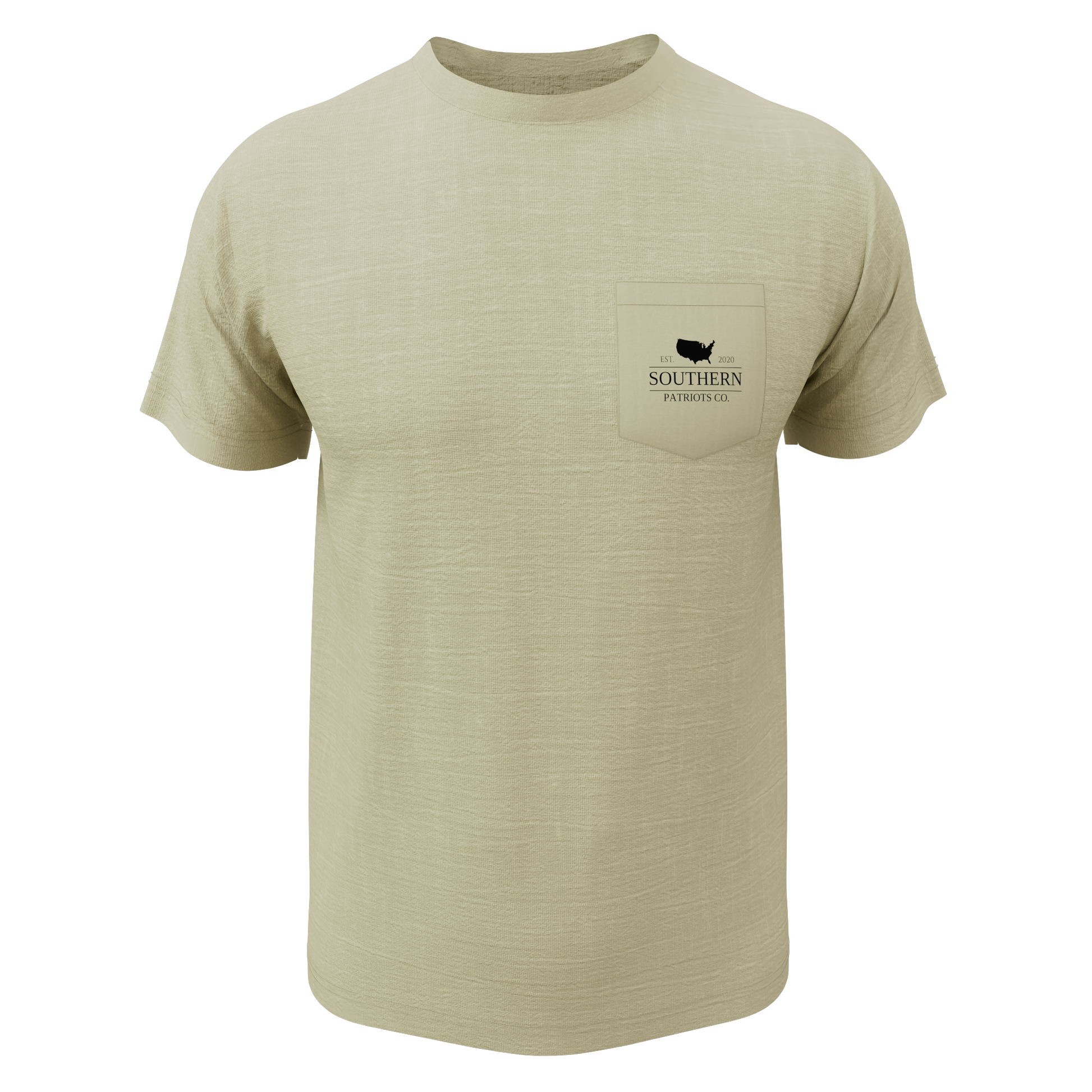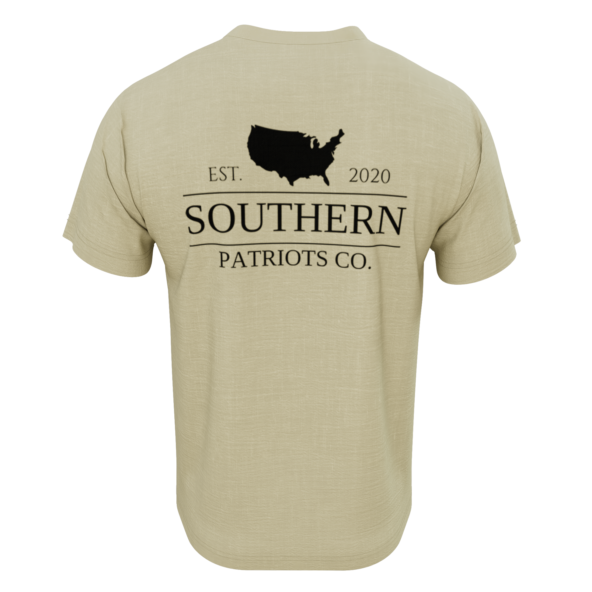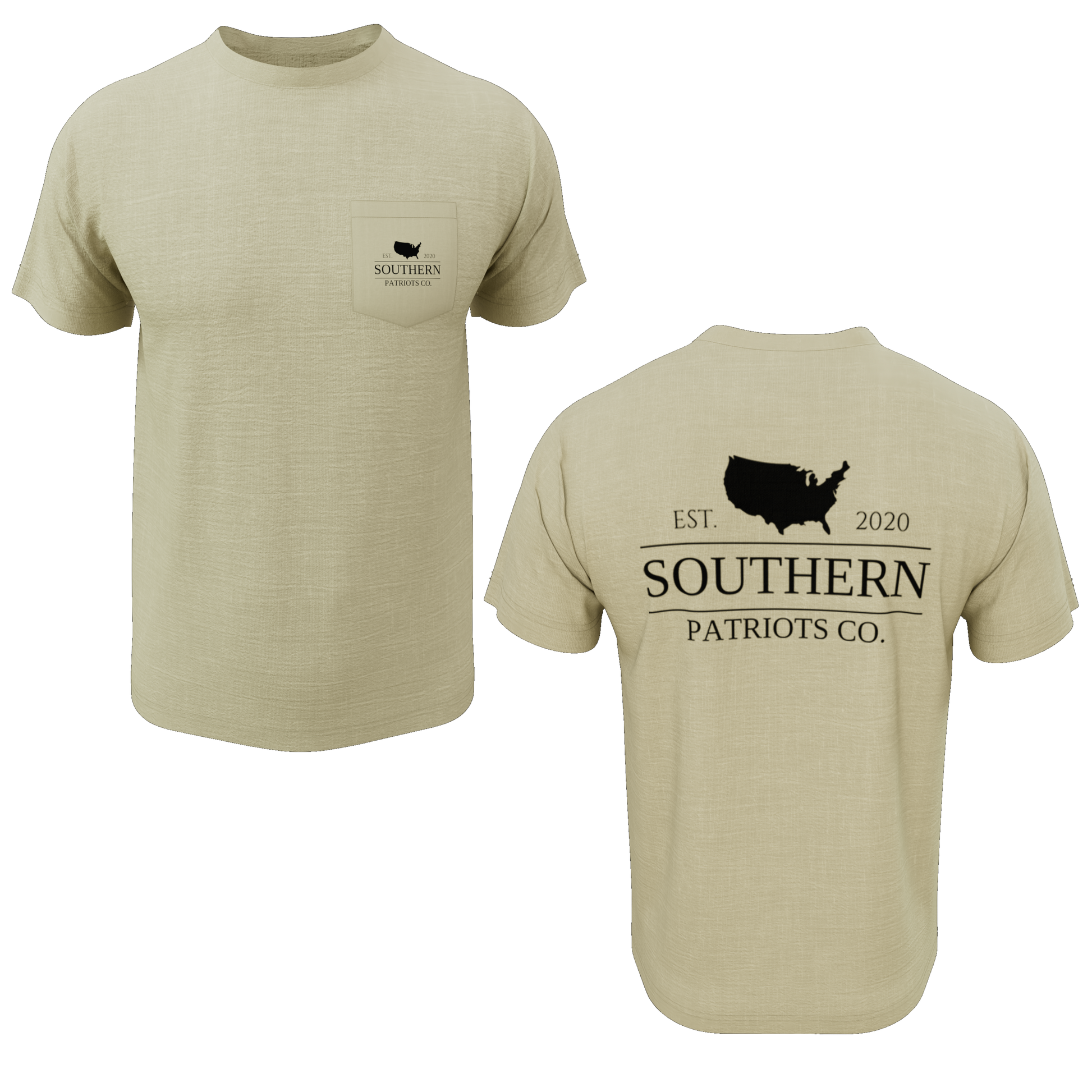 Khaki colored shirt. 50% Cotton, 50% Polyester.