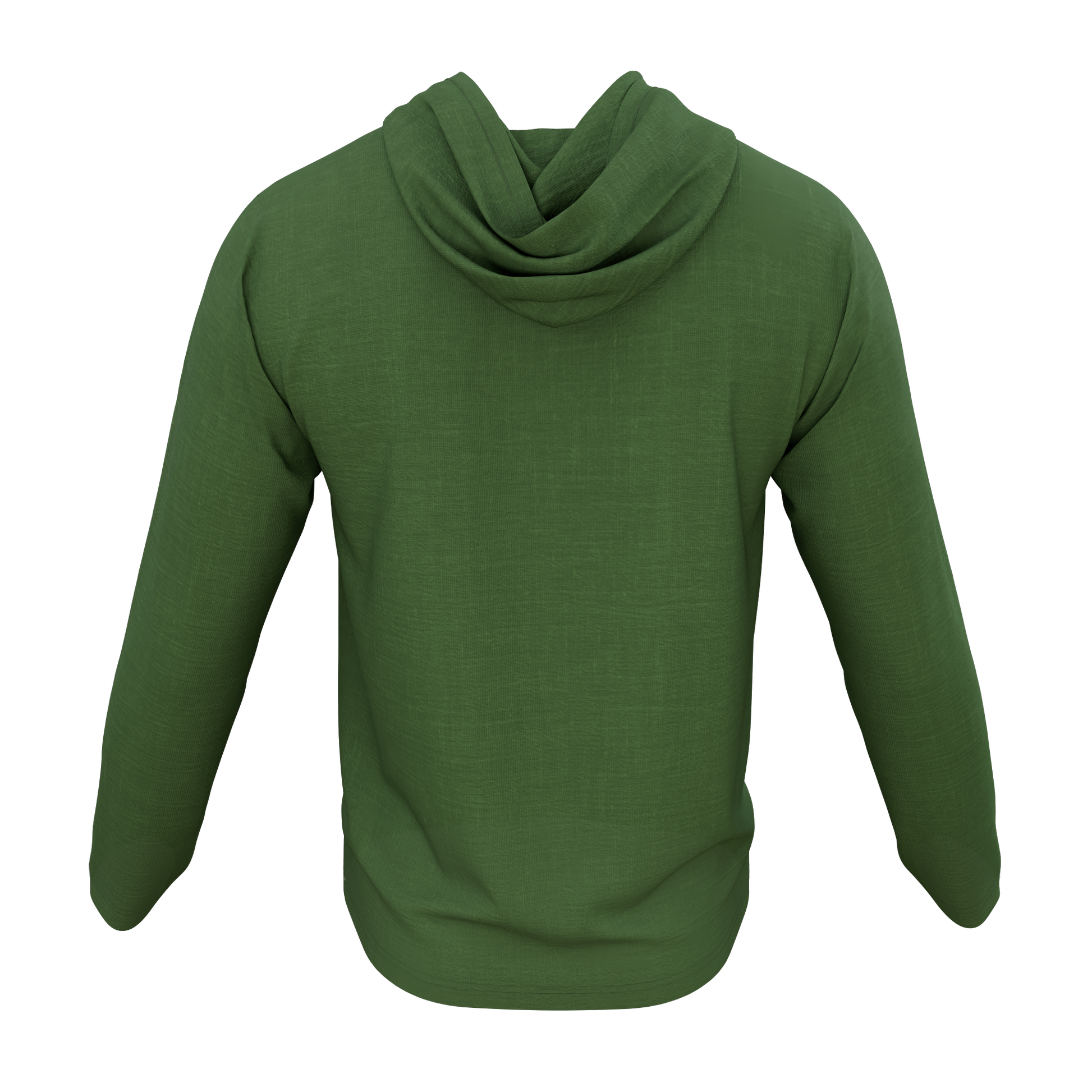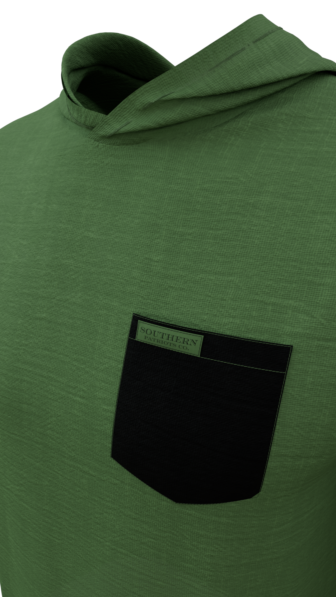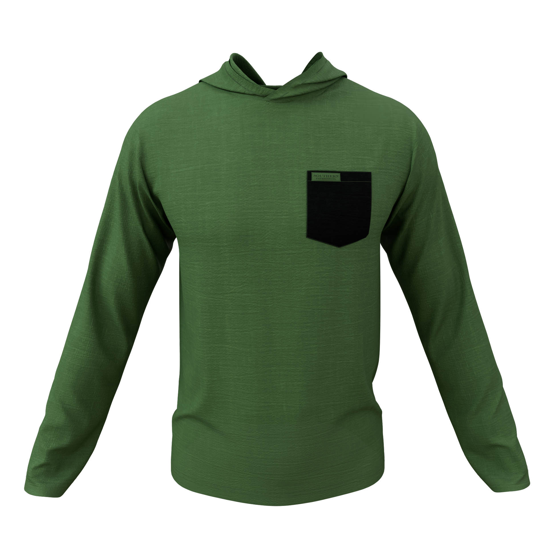 Our Loden Green & Black pocket lightweight hoodie. It is 92% Poly, 8% Spandex. It is stretchy, durable, quick drying, moisture wicking, and it is UV 50+.