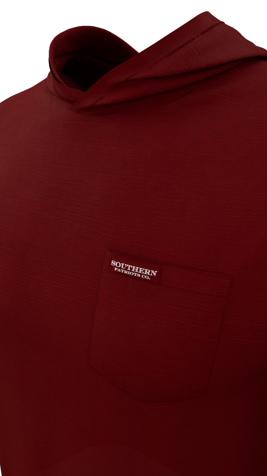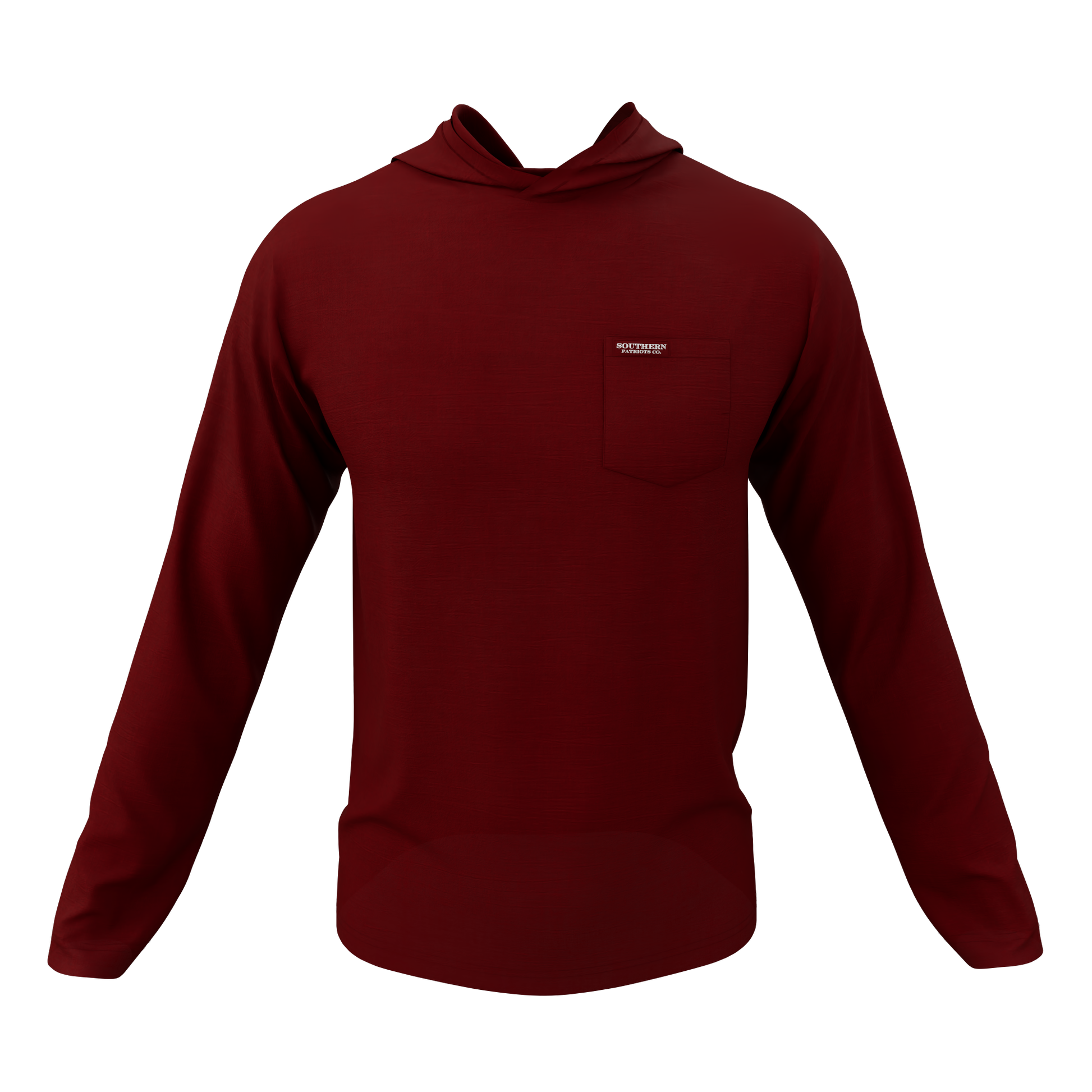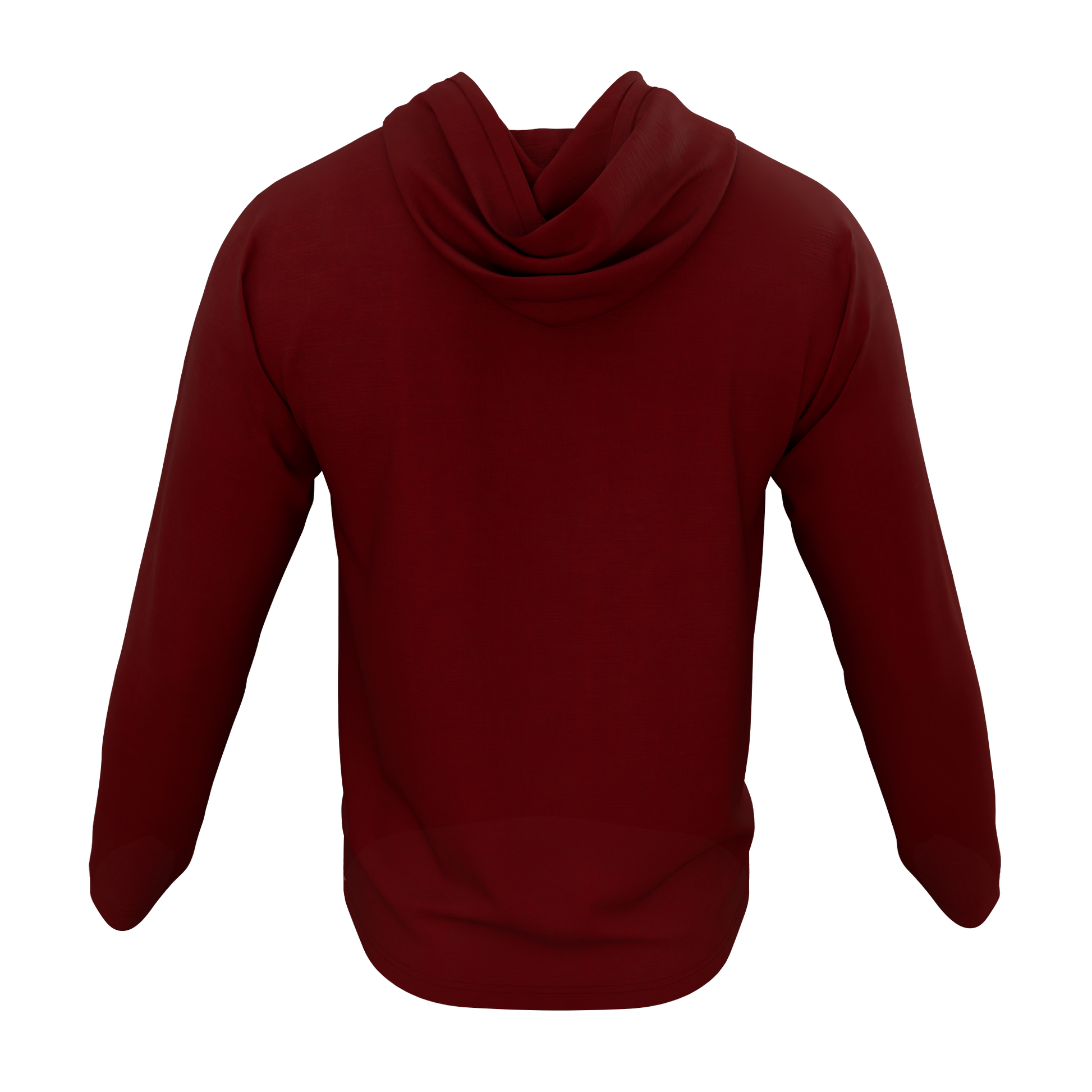 Our Maroon lightweight hoodie. It is 92% Poly, 8% Spandex. It is stretchy, durable, quick drying, moisture wicking, and it is UV 50+.