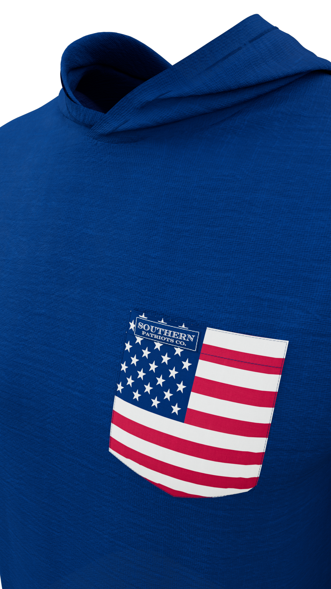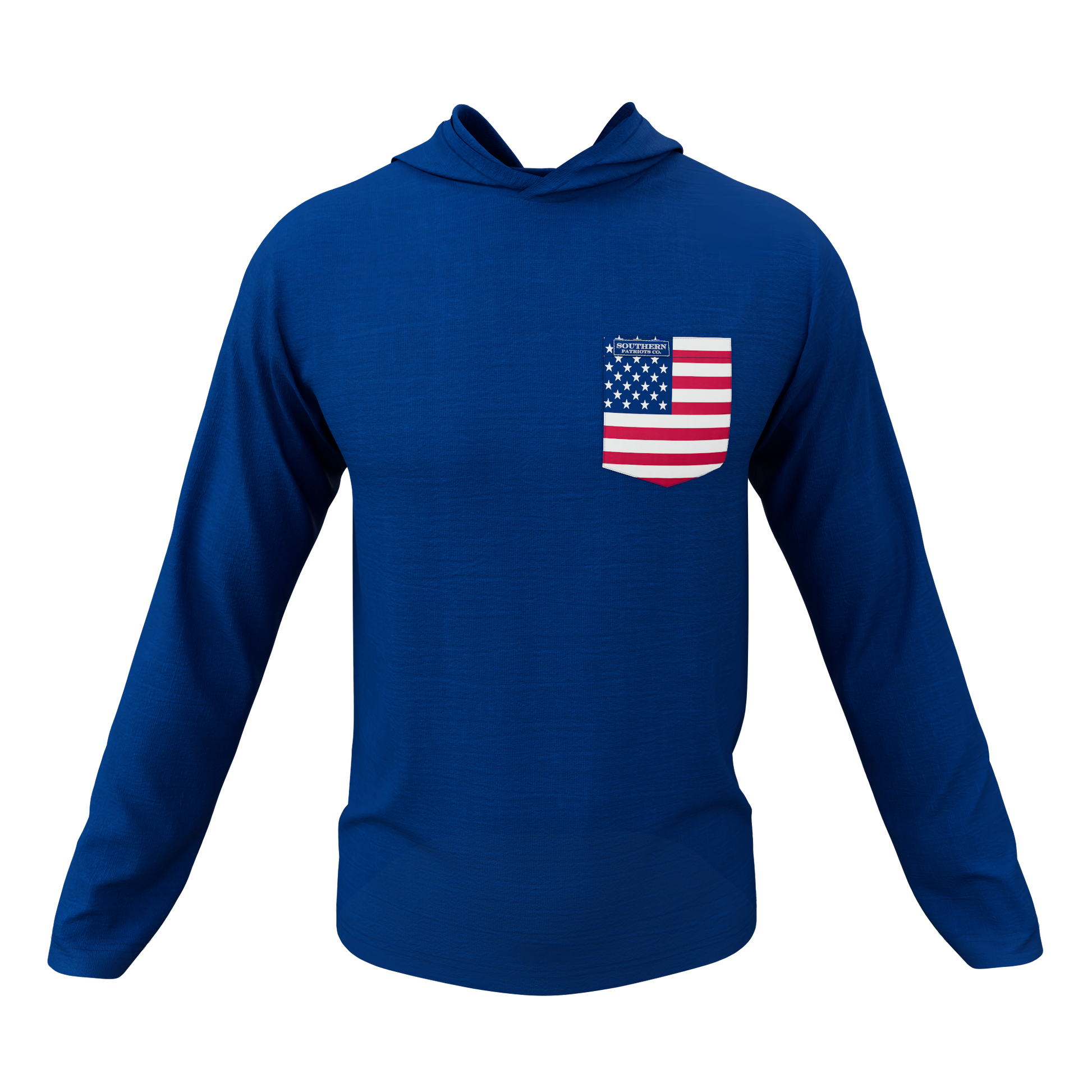 Our Navy Blue lightweight hoodie with an American flag pocket. It is 92% Poly, 8% Spandex. It is stretchy, durable, quick drying, moisture wicking, and it is UV 50+.