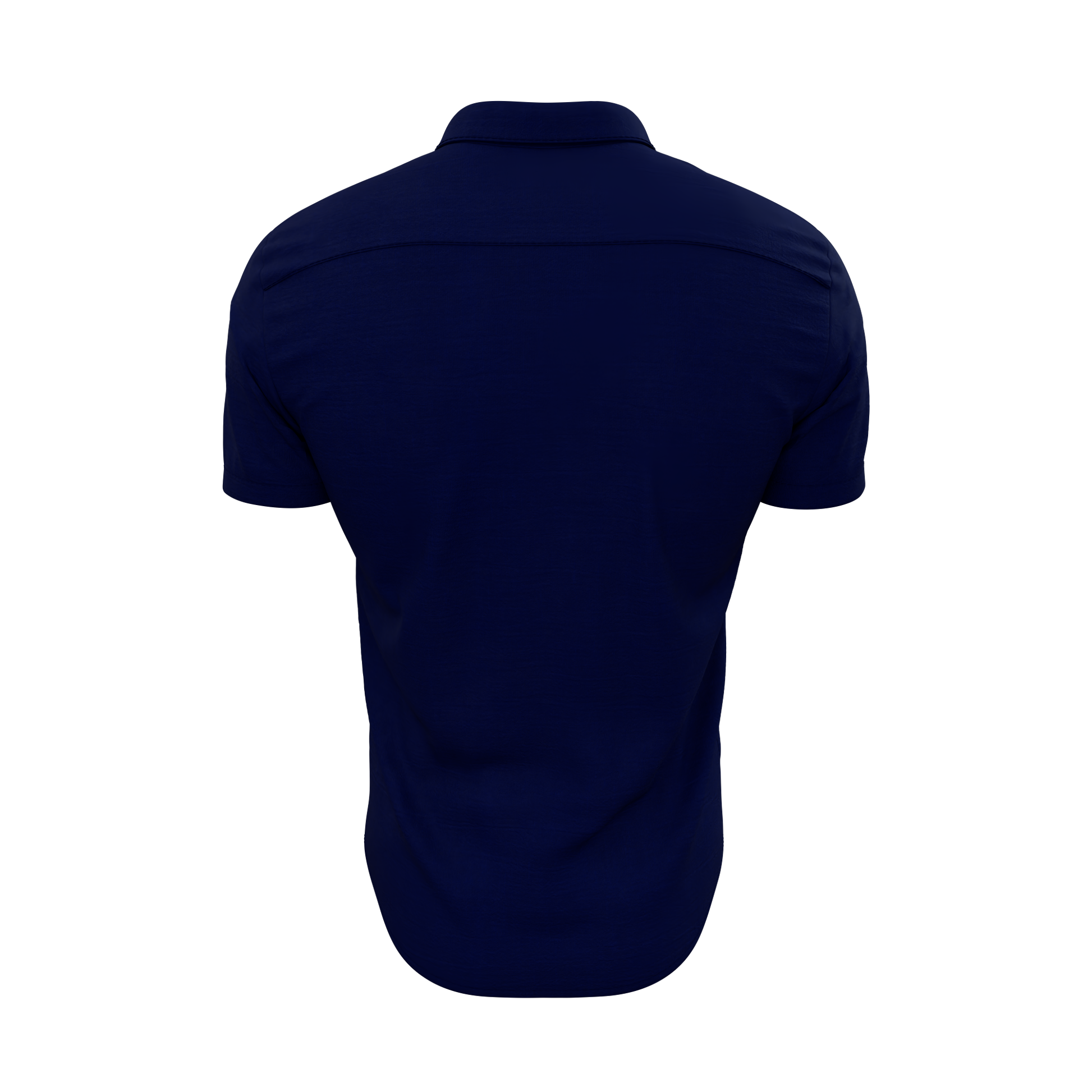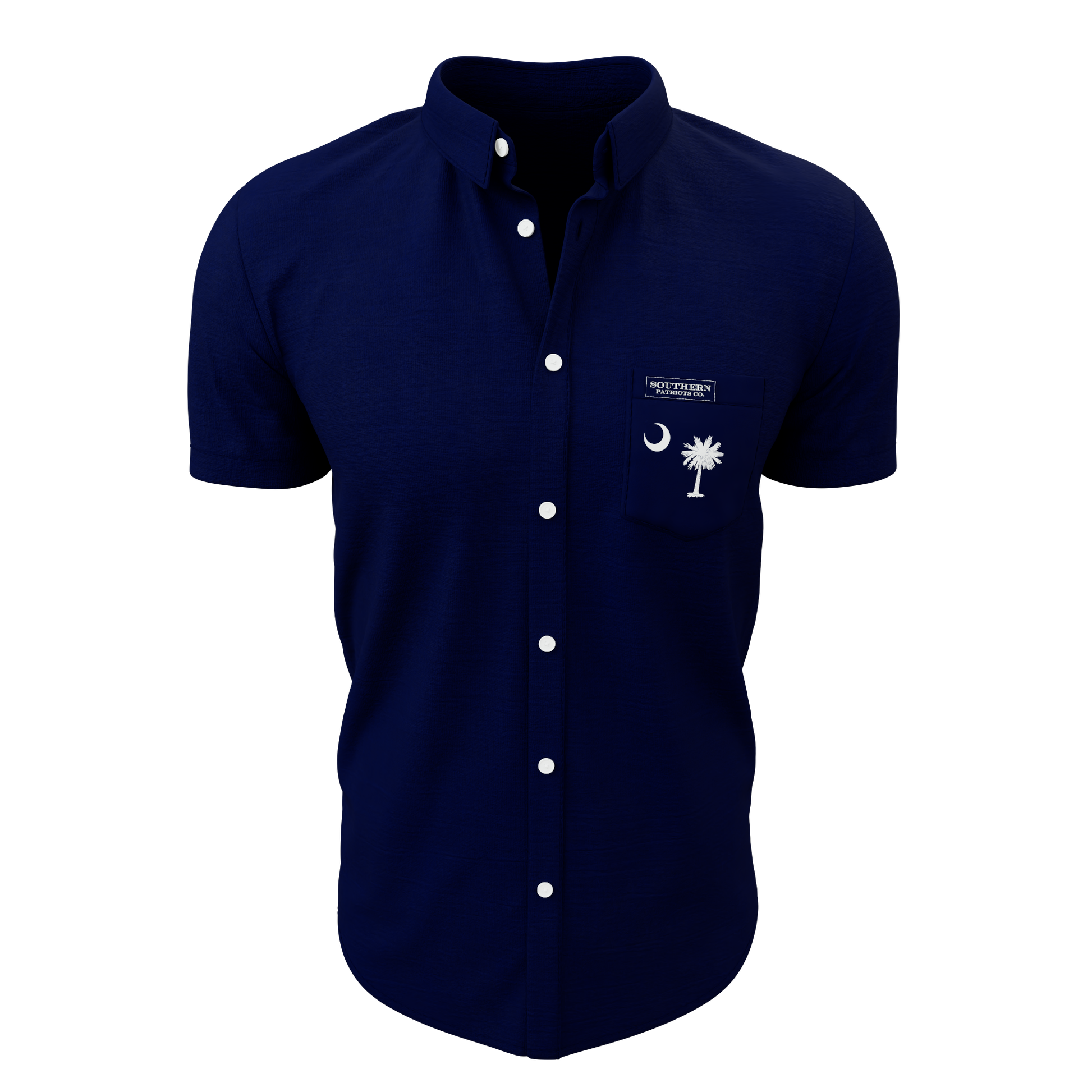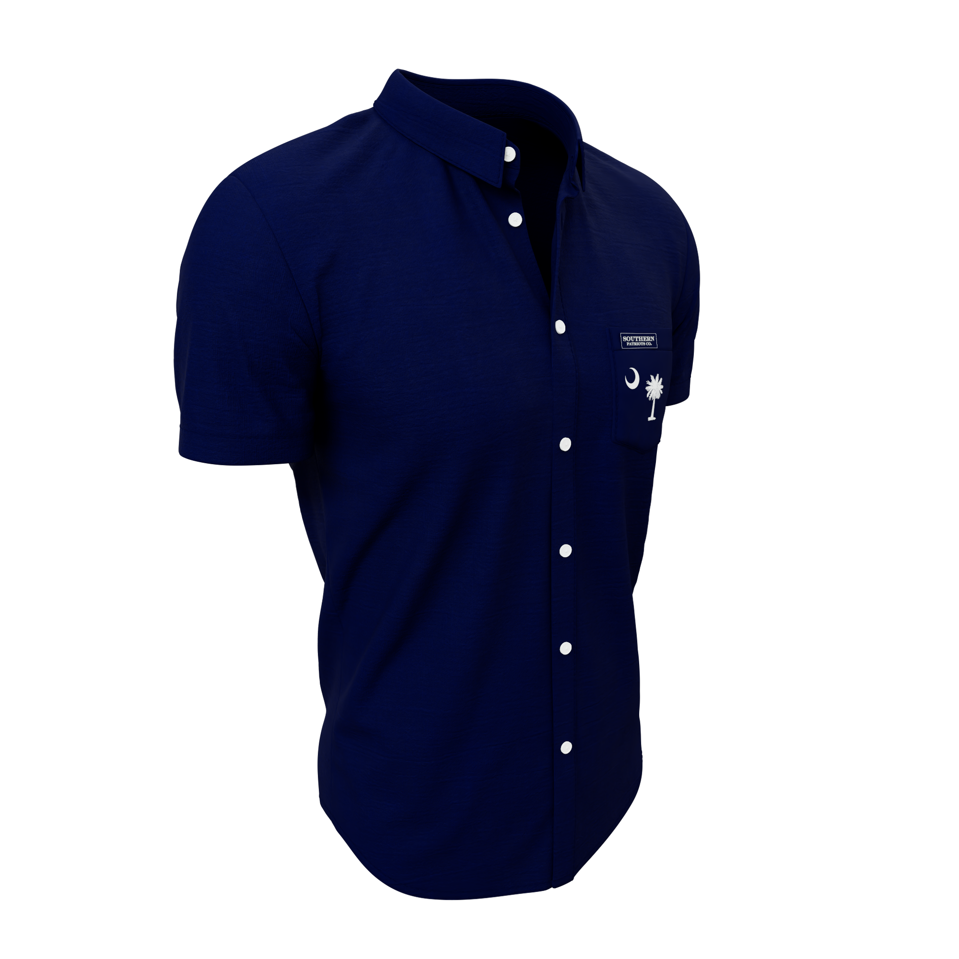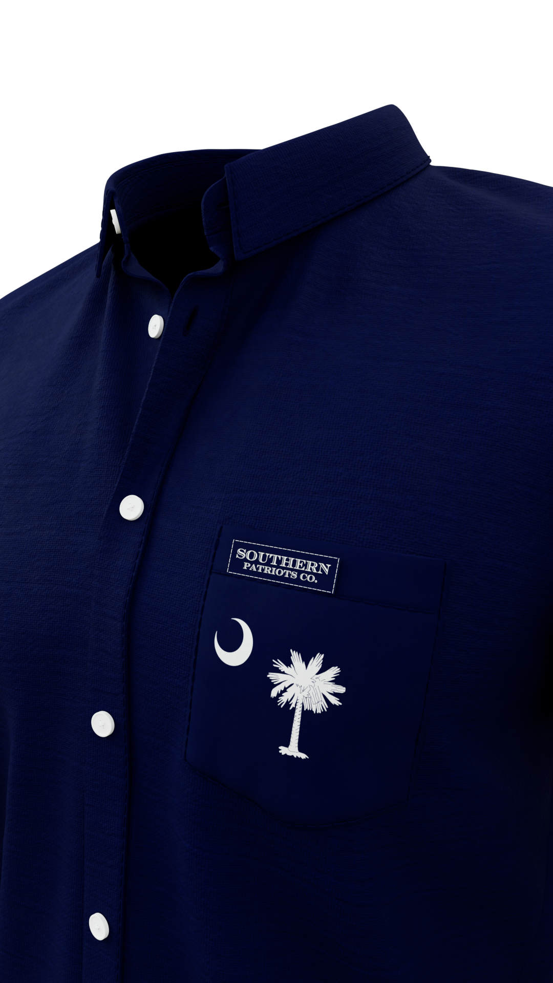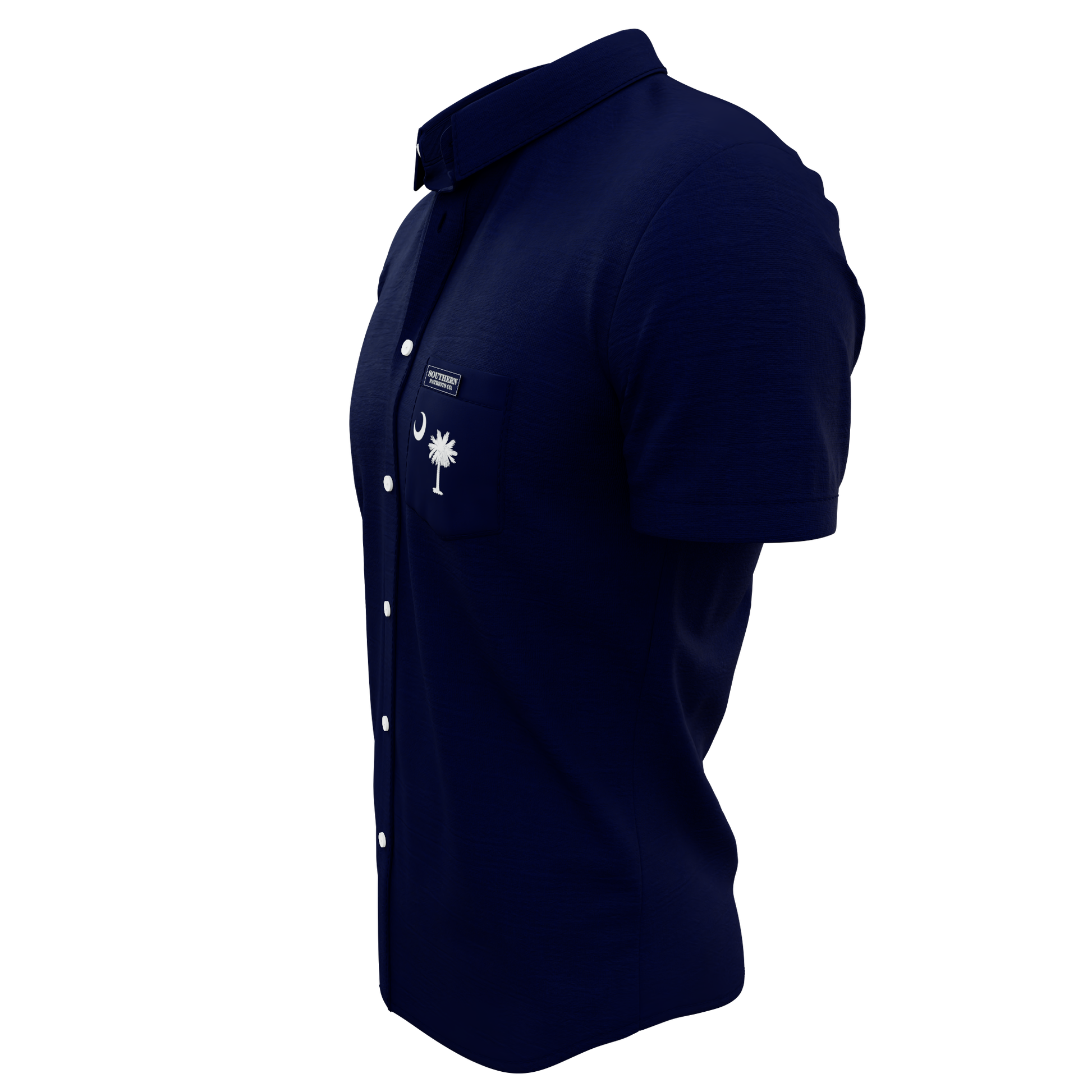 A Navy Blue button down polo shirt with the South Carolina state flag on the pocket. It is 92% Poly, 8% Spandex. It is stretchy, durable, quick drying, moisture wicking, and it is UV 50+.