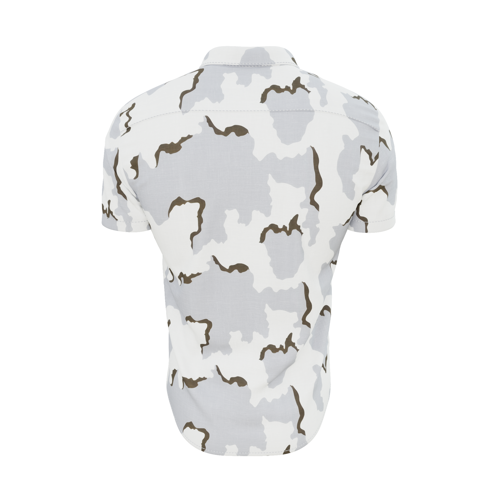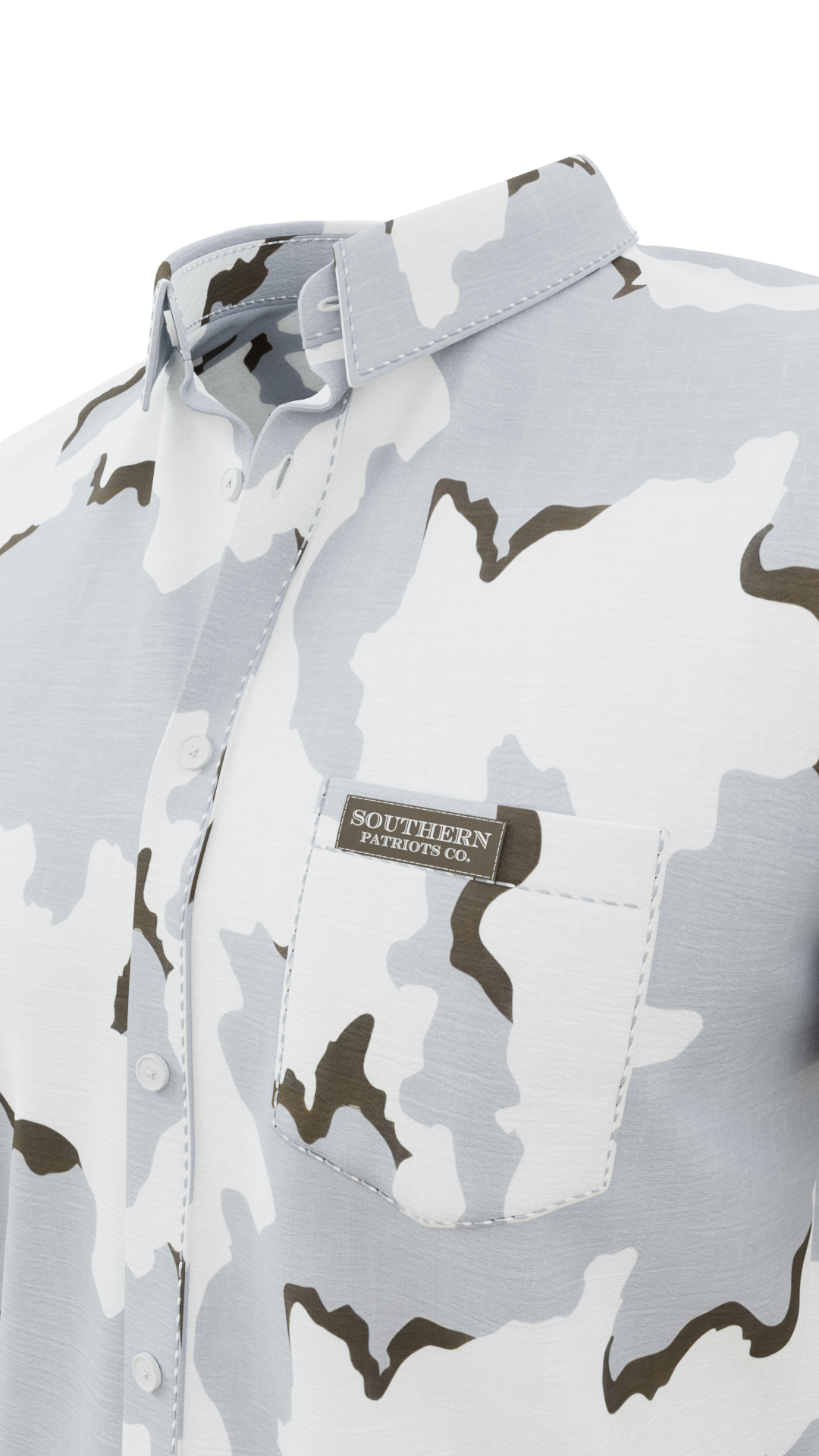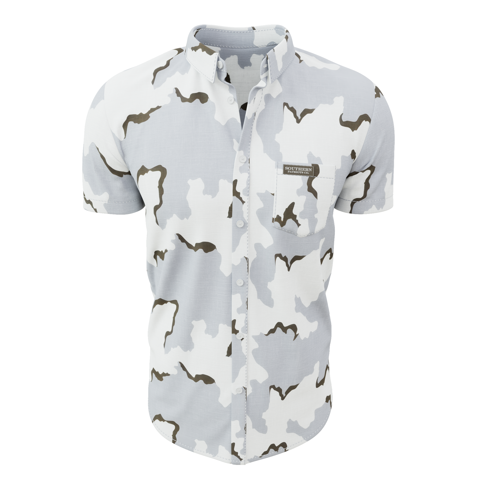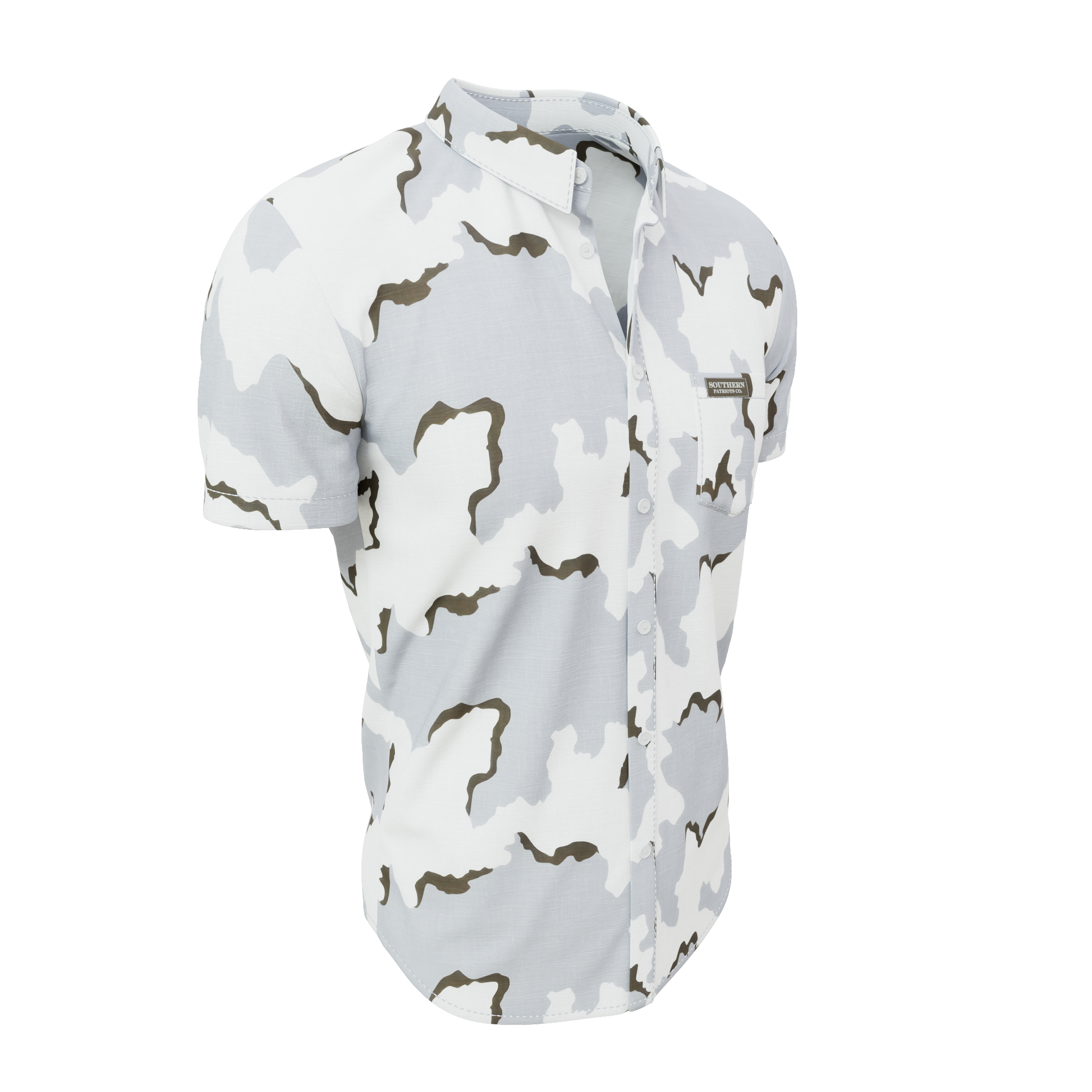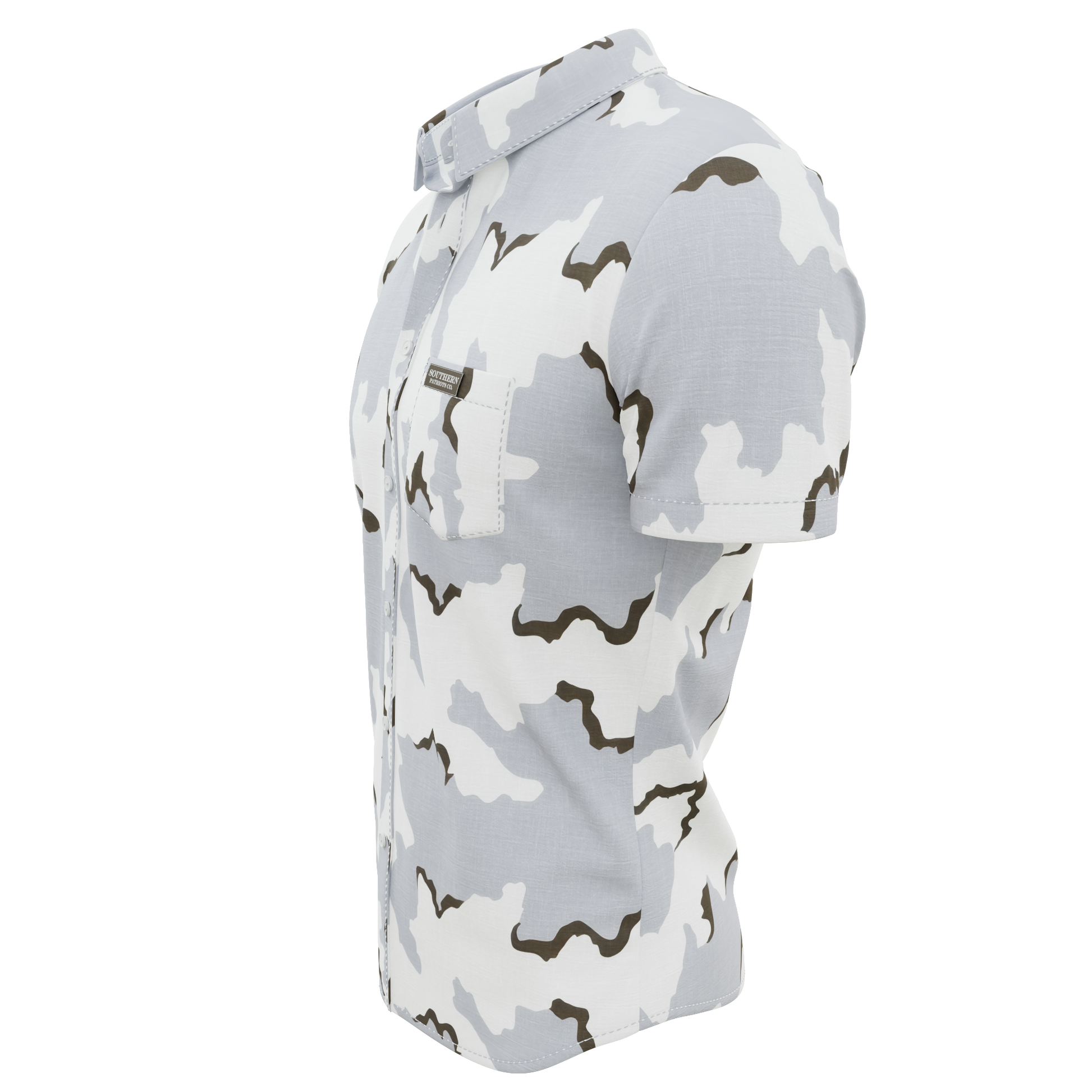 Our 3 Color Snow Camo button down polo shirt! It is 92% Poly, 8% Spandex. It is stretchy, durable, quick drying, moisture wicking, and it is UV 50+.