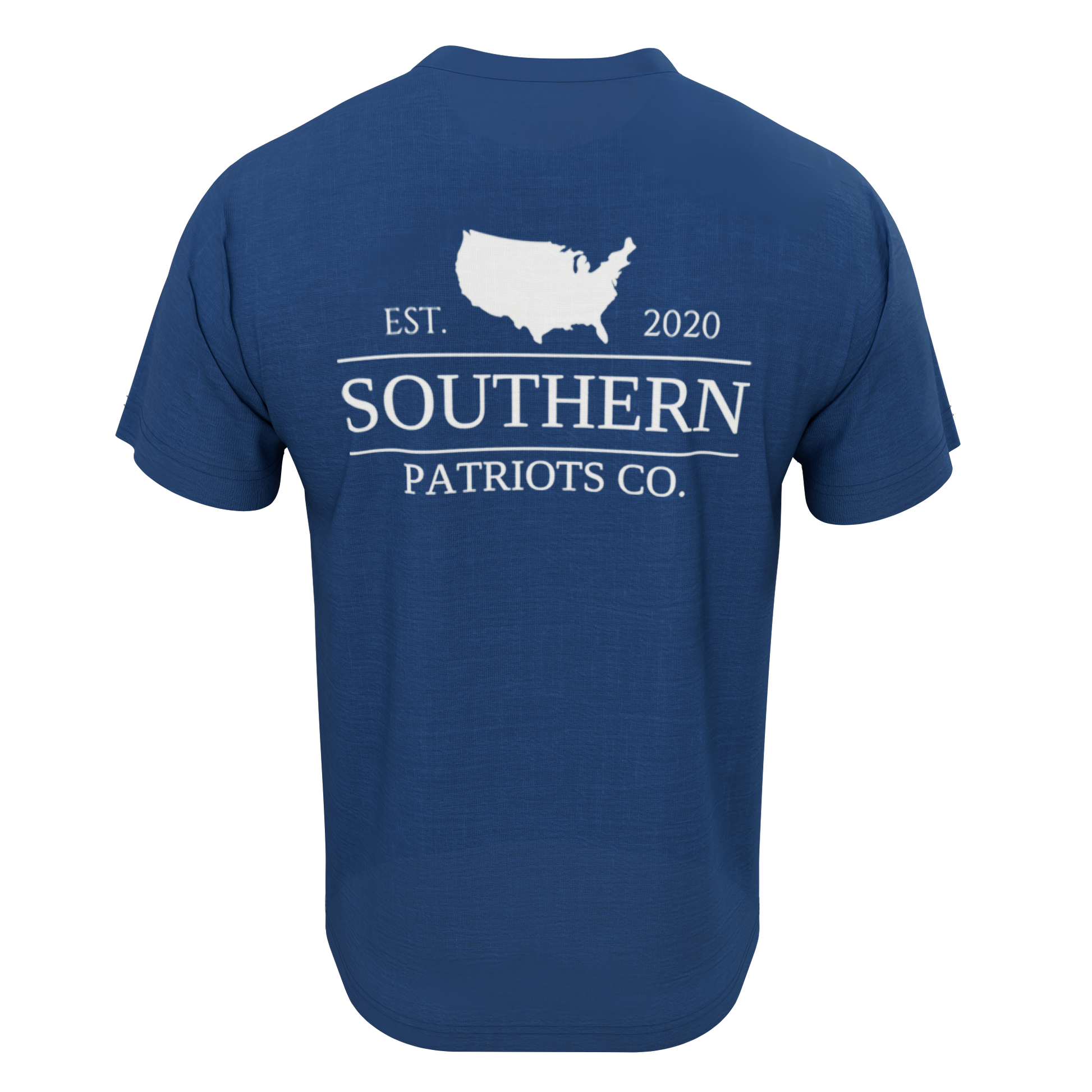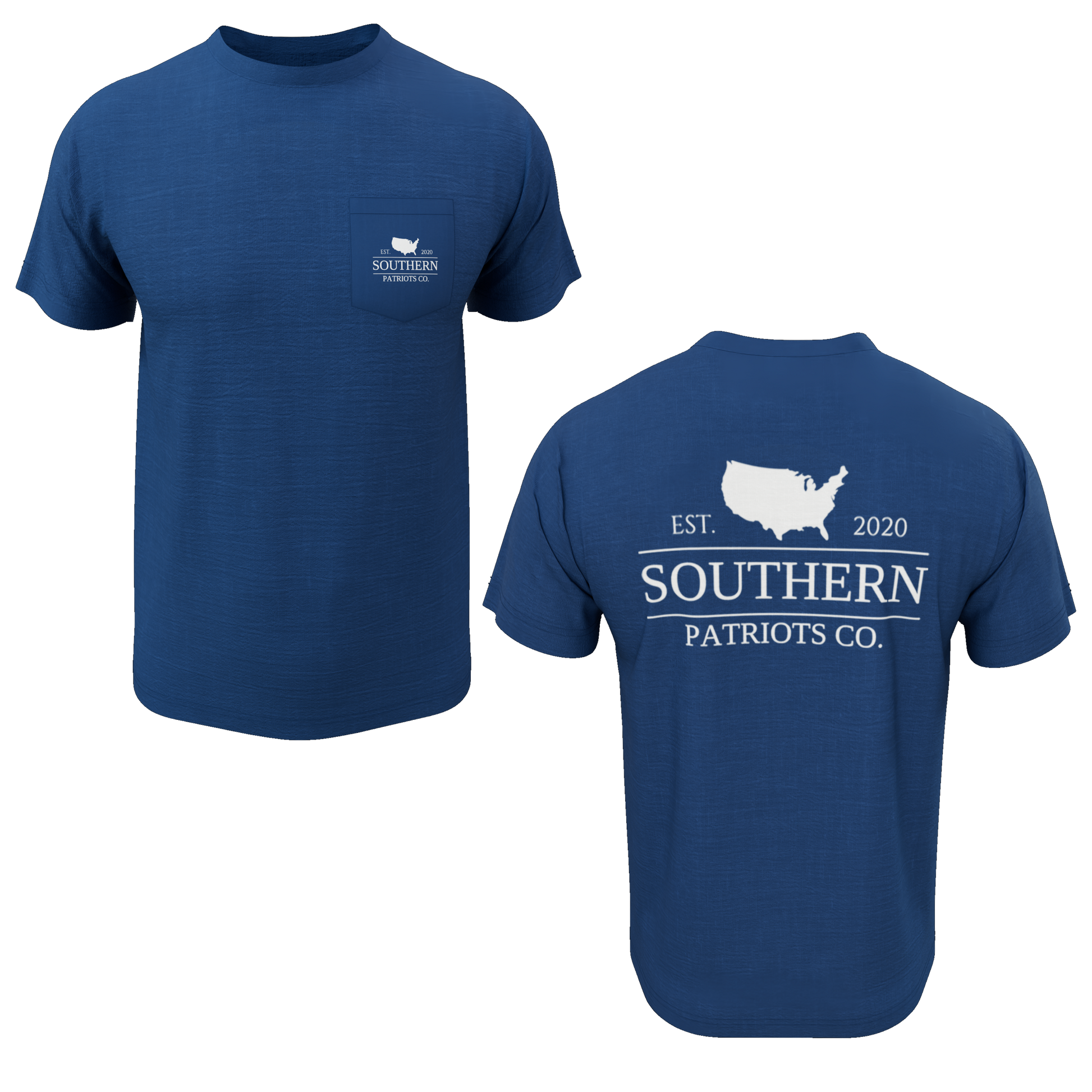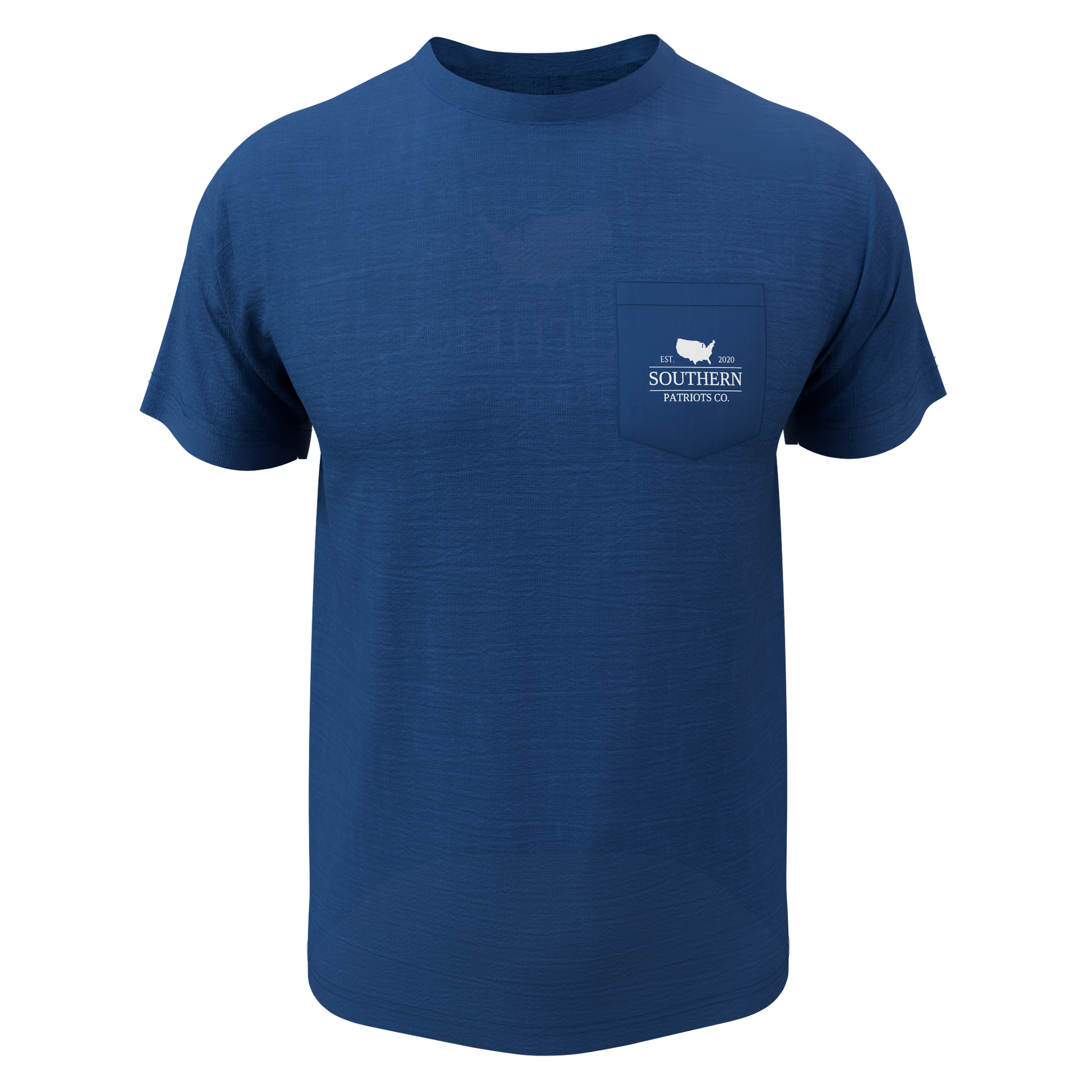 Patriot Blue colored shirt. 50% Cotton, 50% Polyester.