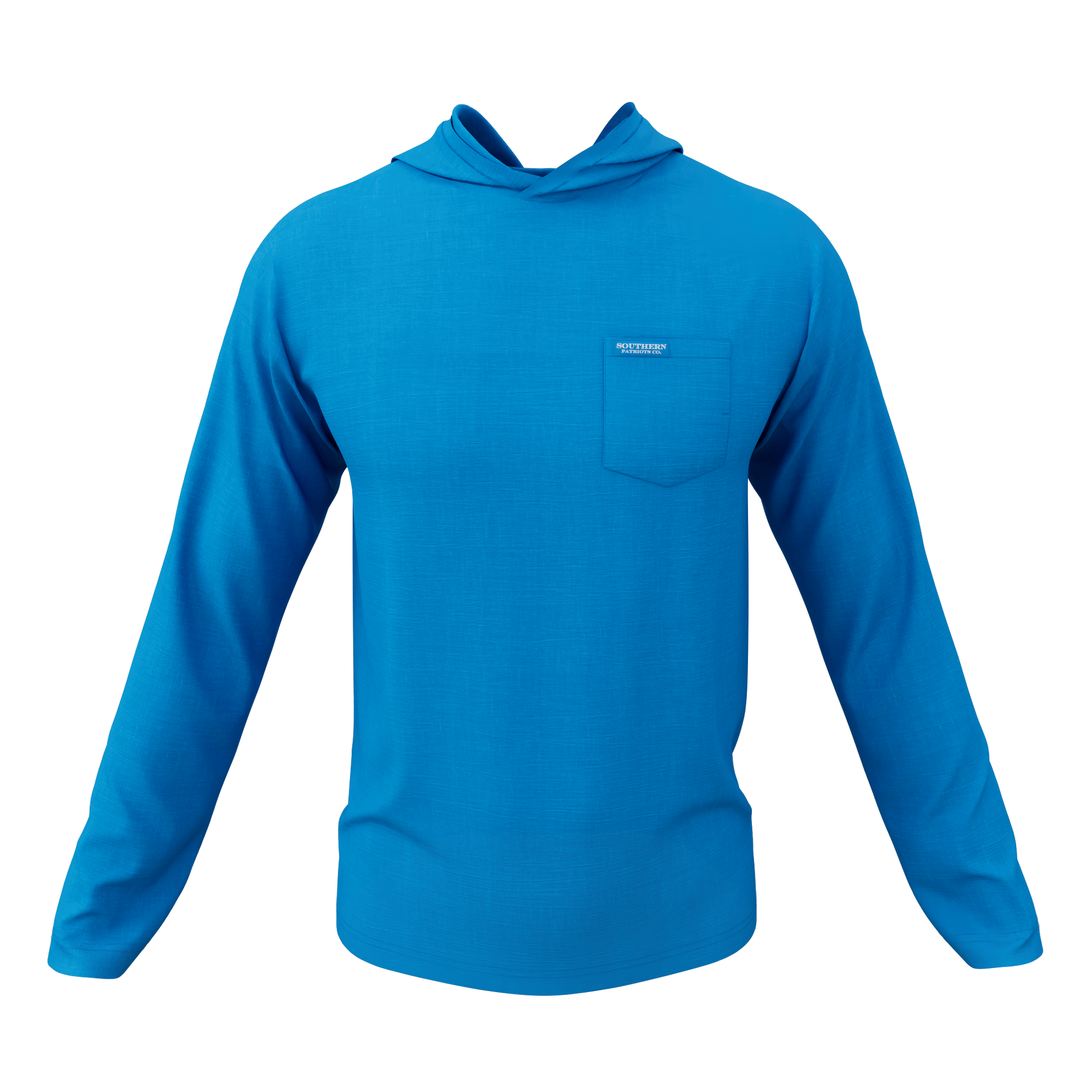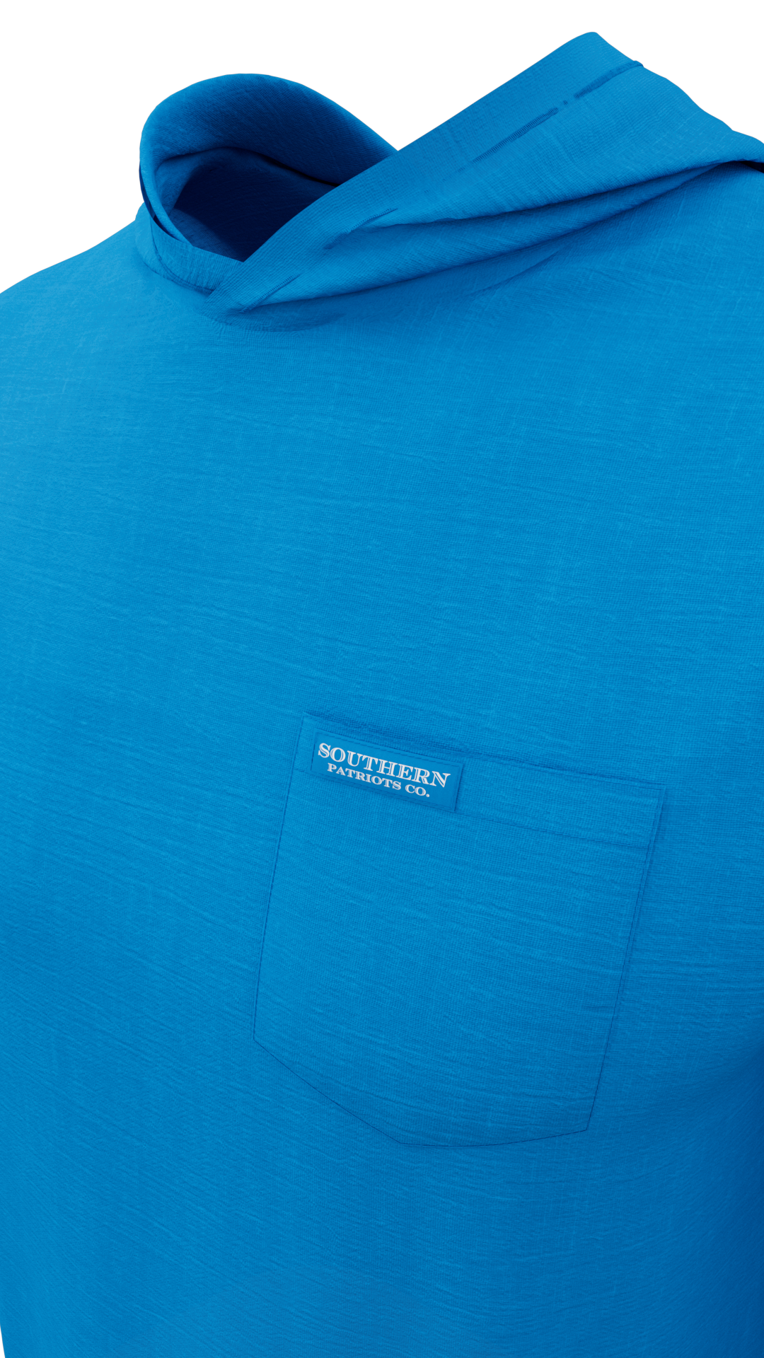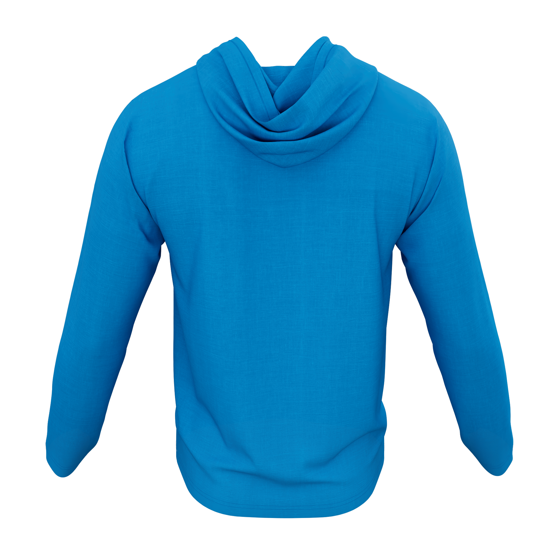 Our Powder Blue lightweight hoodie. It is 92% Poly, 8% Spandex. It is stretchy, durable, quick drying, moisture wicking, and it is UV 50+.