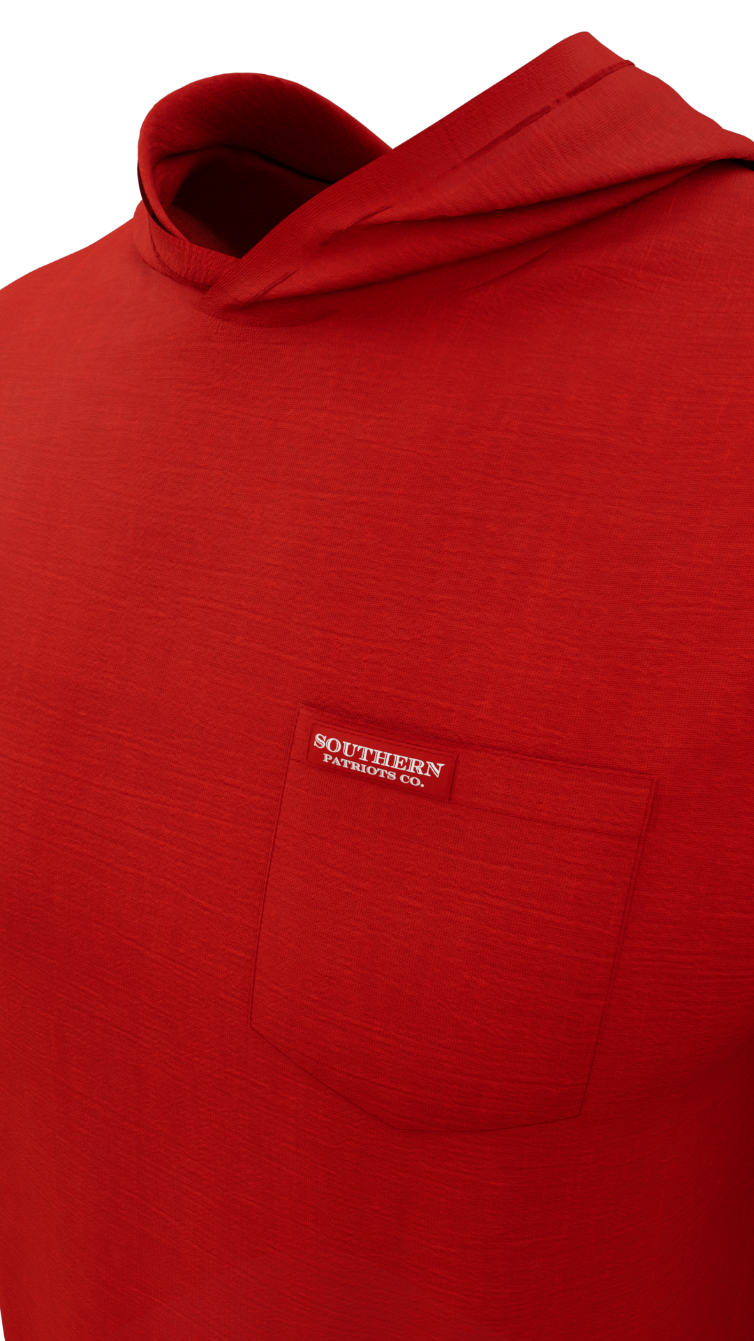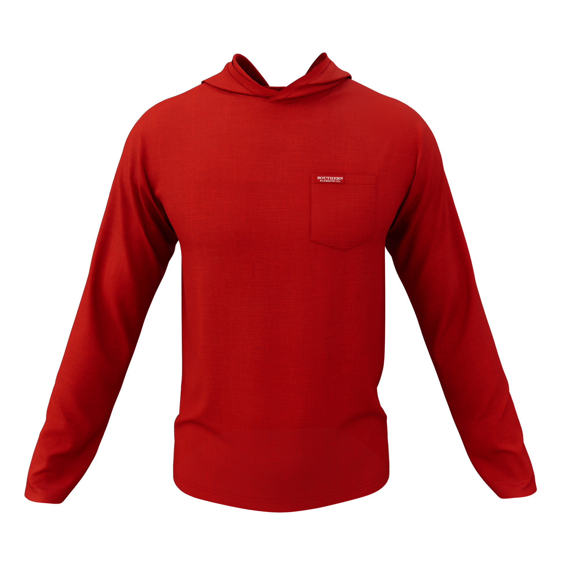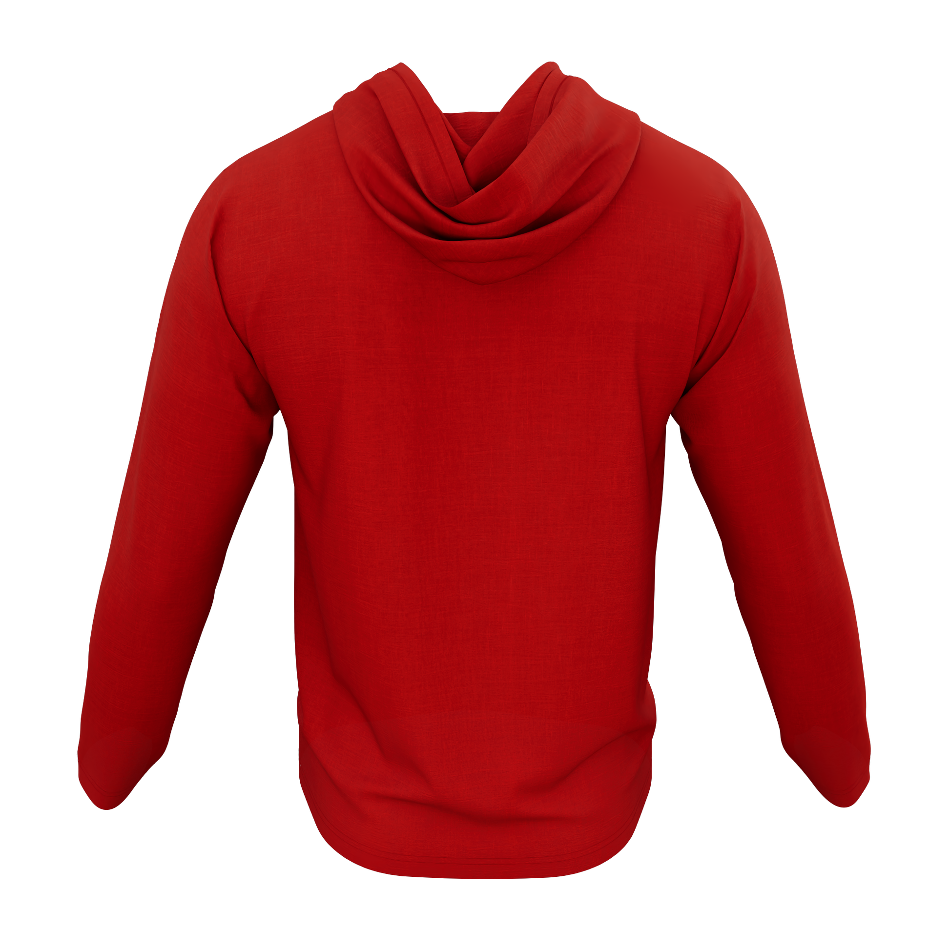 Our Red lightweight hoodie. It is 92% Poly, 8% Spandex. It is stretchy, durable, quick drying, moisture wicking, and it is UV 50+.
