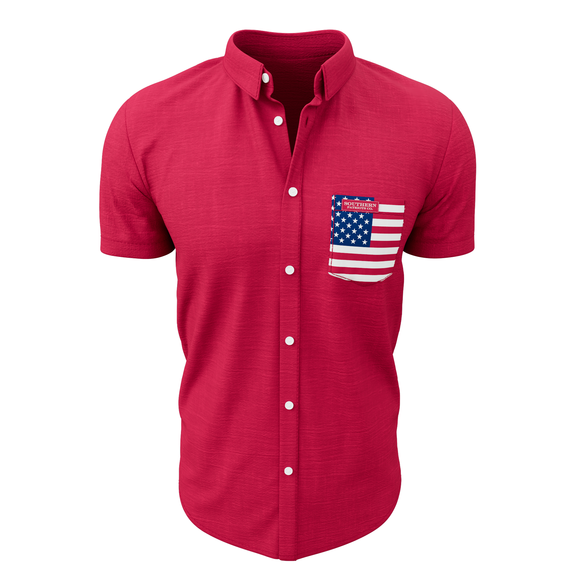 Our Red button down polo shirt with an American flag pocket. It is 92% Poly, 8% Spandex. It is stretchy, durable, quick drying, moisture wicking, and it is UV 50+.
