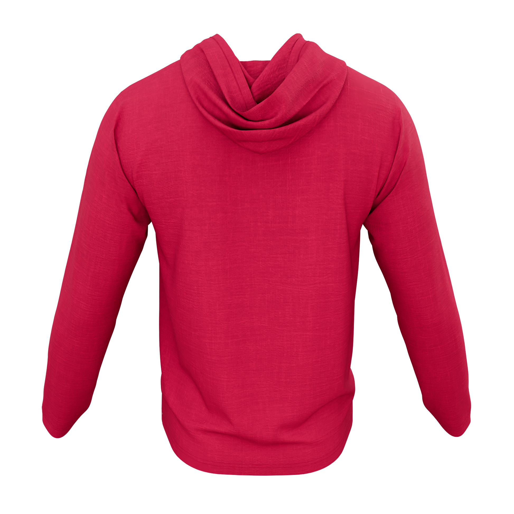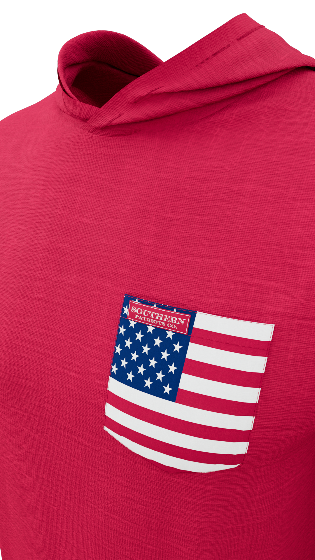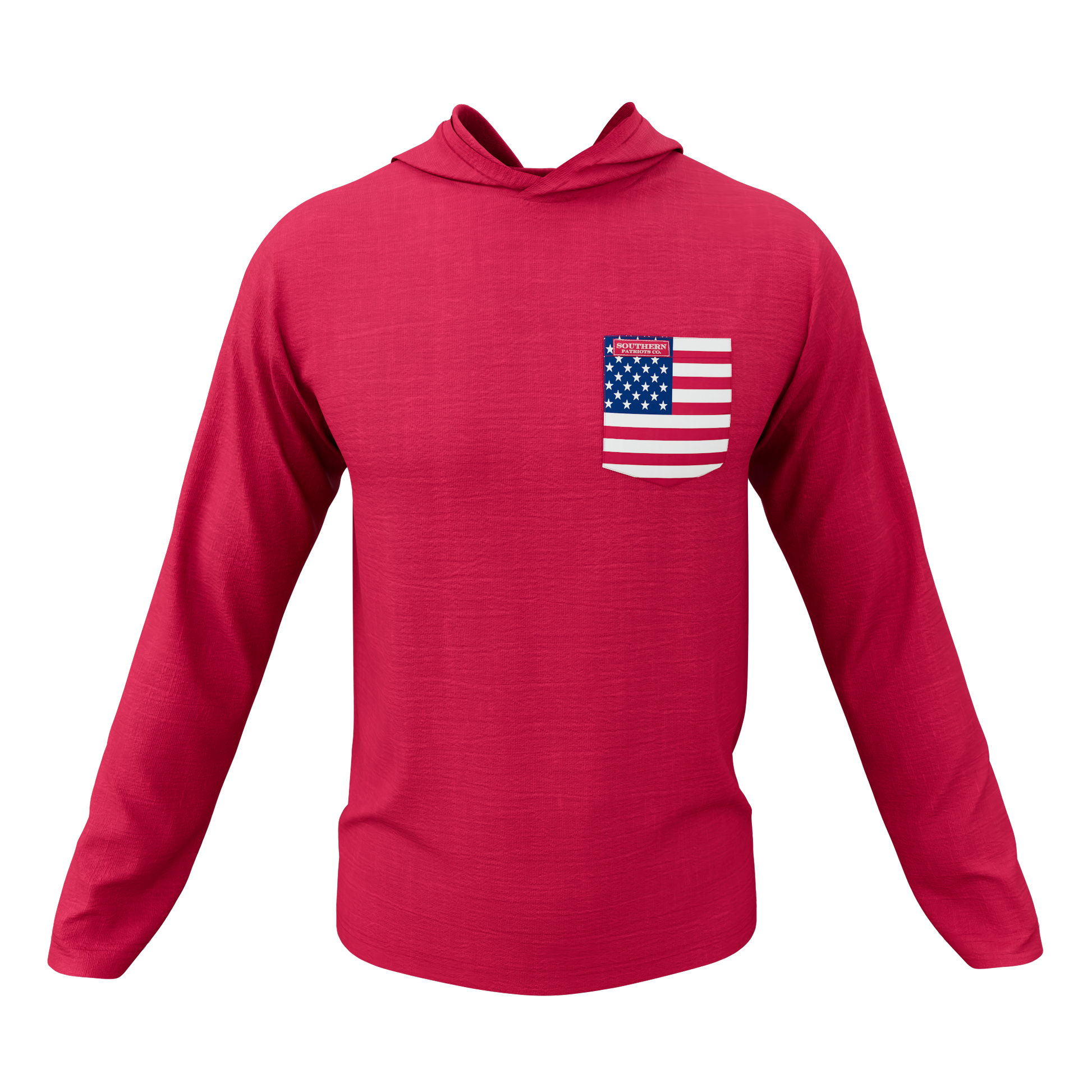 Our Red lightweight hoodie with an American flag pocket. It is 92% Poly, 8% Spandex. It is stretchy, durable, quick drying, moisture wicking, and it is UV 50+.