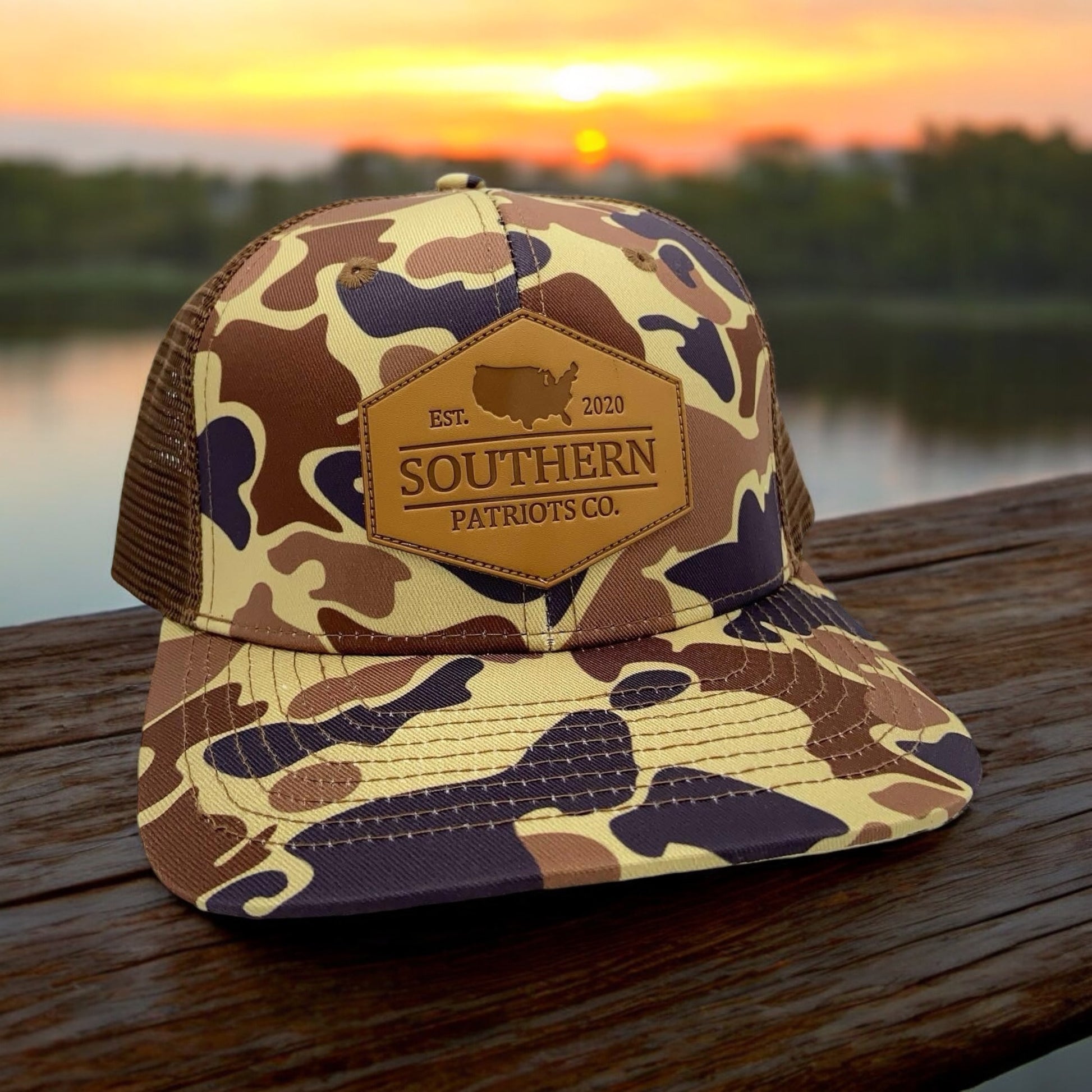 Retro Duck Camo with a brown mesh and a leather patch. 6 panel snapback.