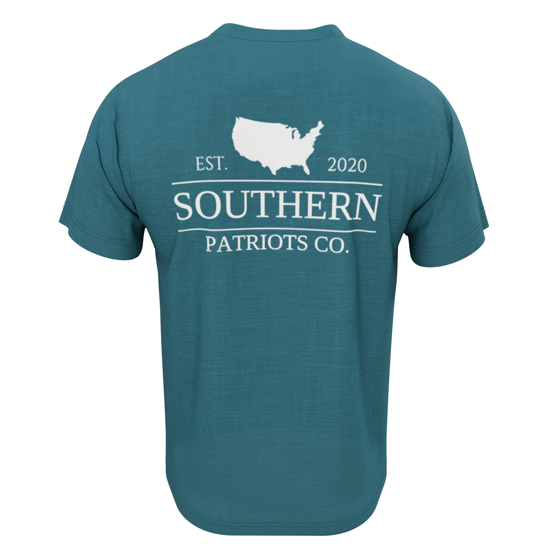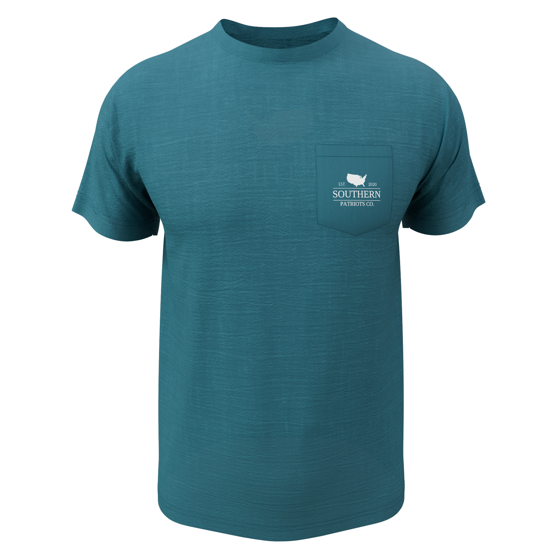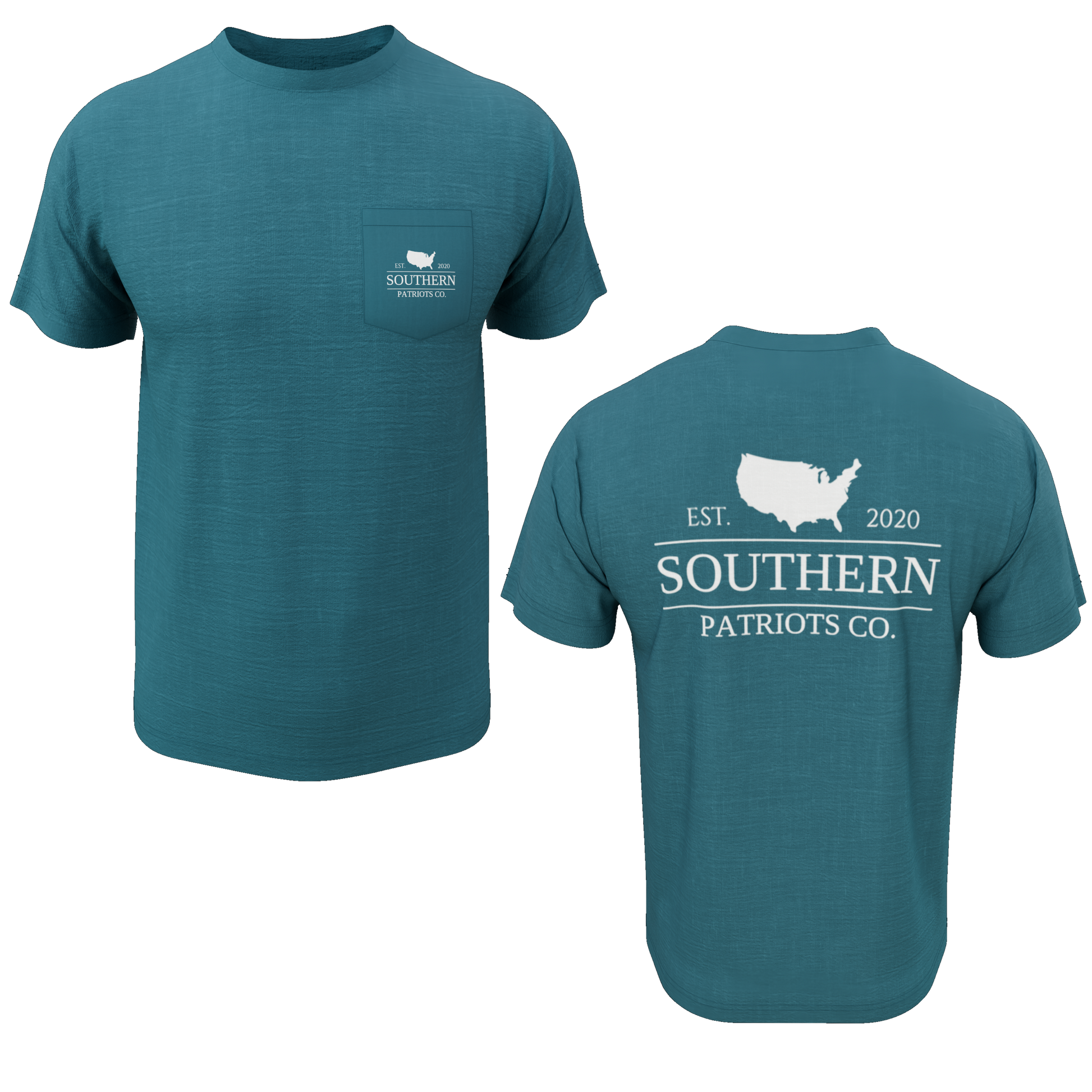 Teal colored shirt. 50% Cotton, 50% Polyester.