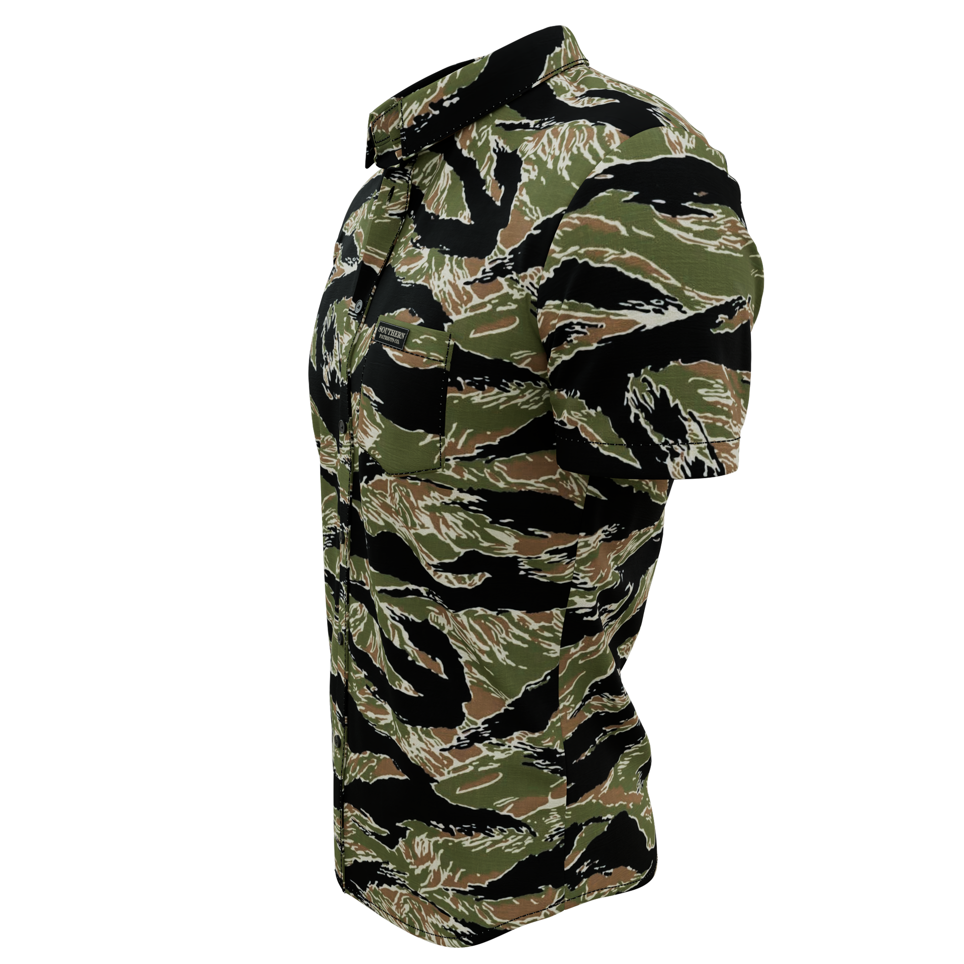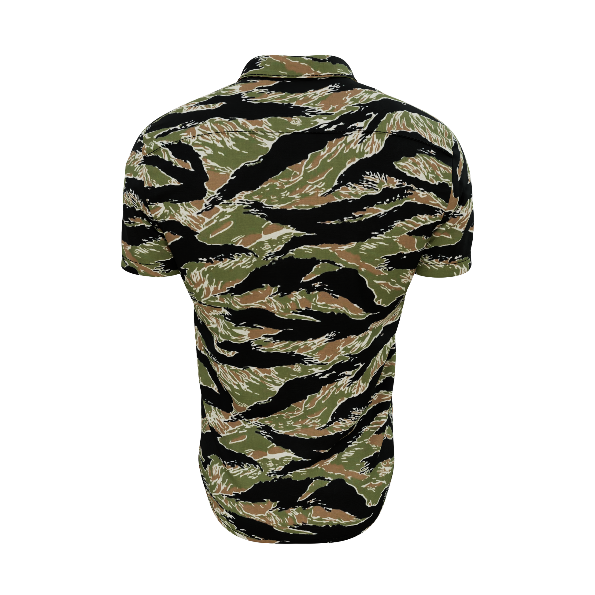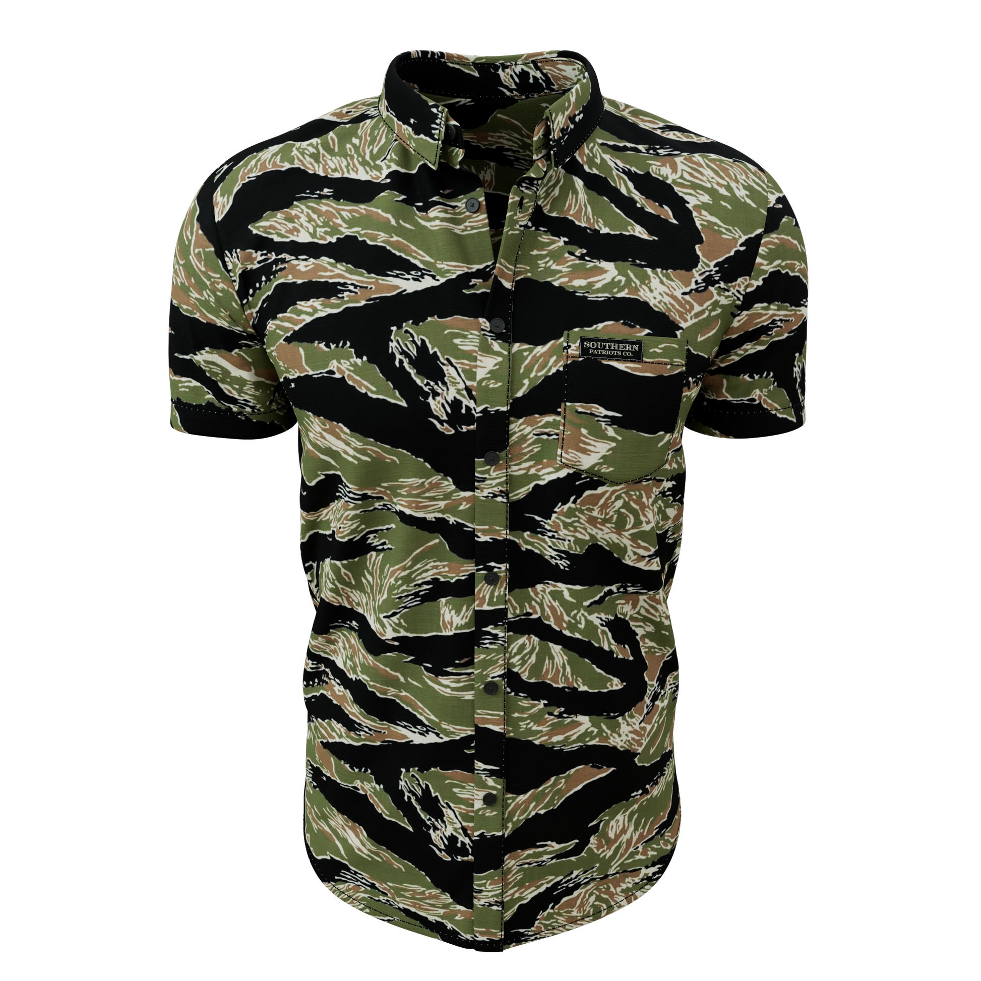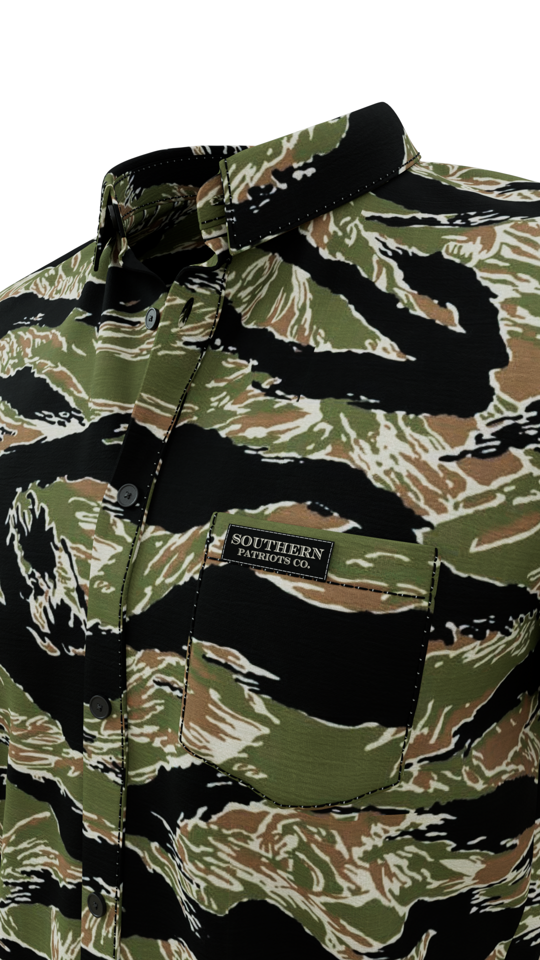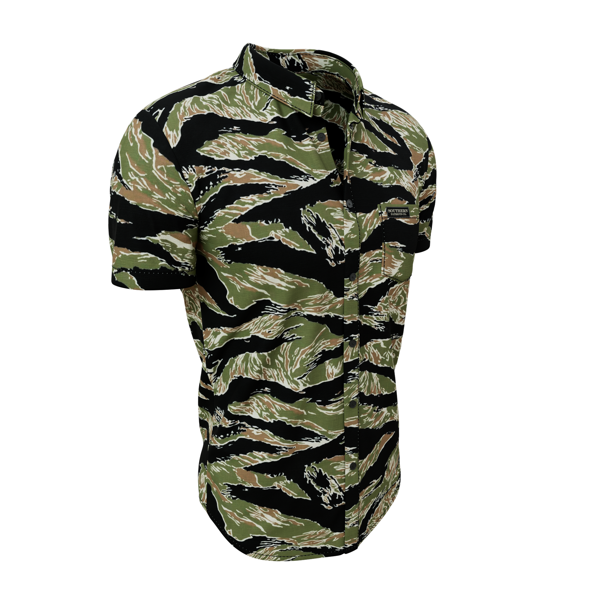 Tiger Stripe Camo, used some by American Armed Forces in the Vietnam War. It is 92% Poly, 8% Spandex. It is stretchy, durable, quick drying, moisture wicking, and it is UV 50+.