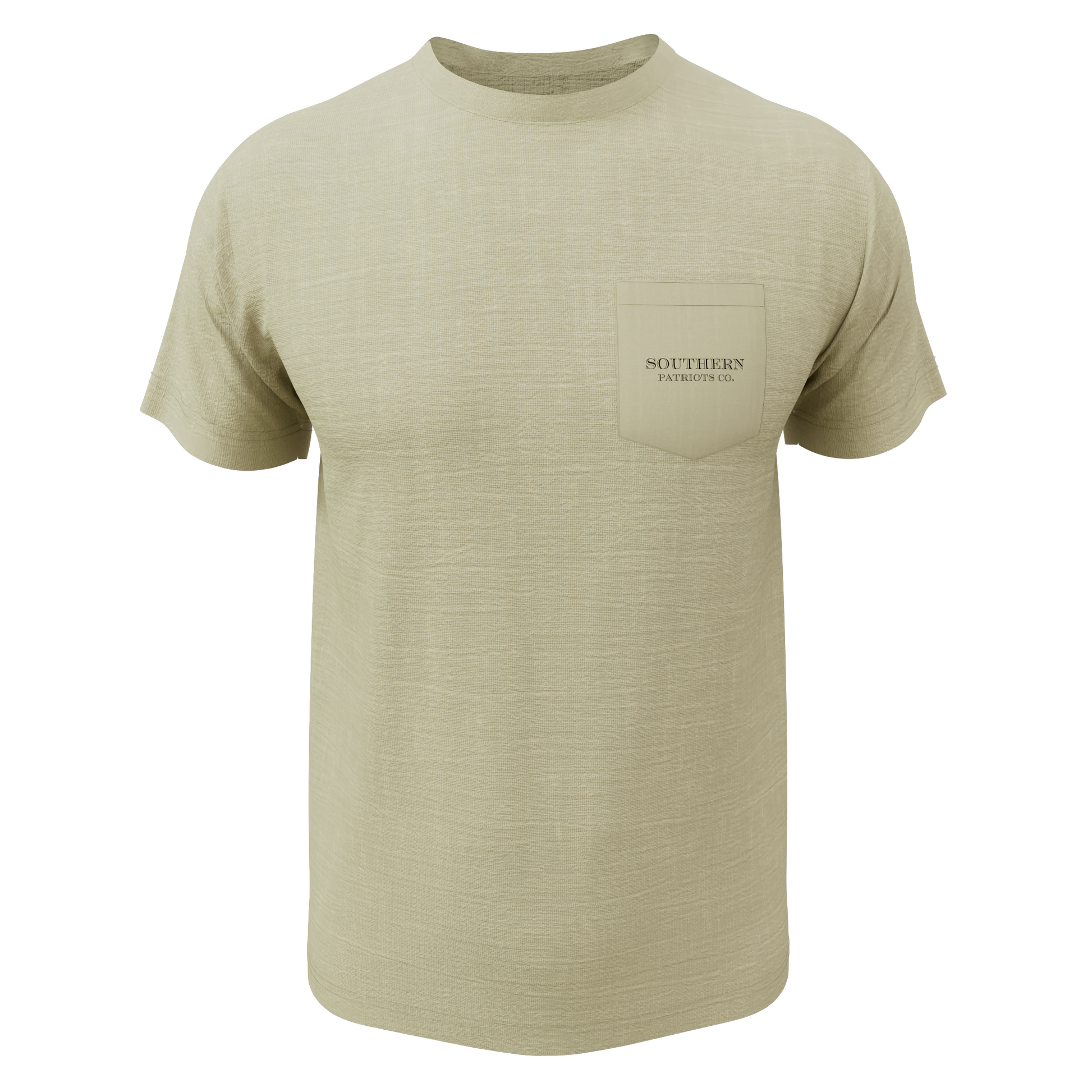A Buck in front of the US flag. 50% Cotton, 50% Polyester.
