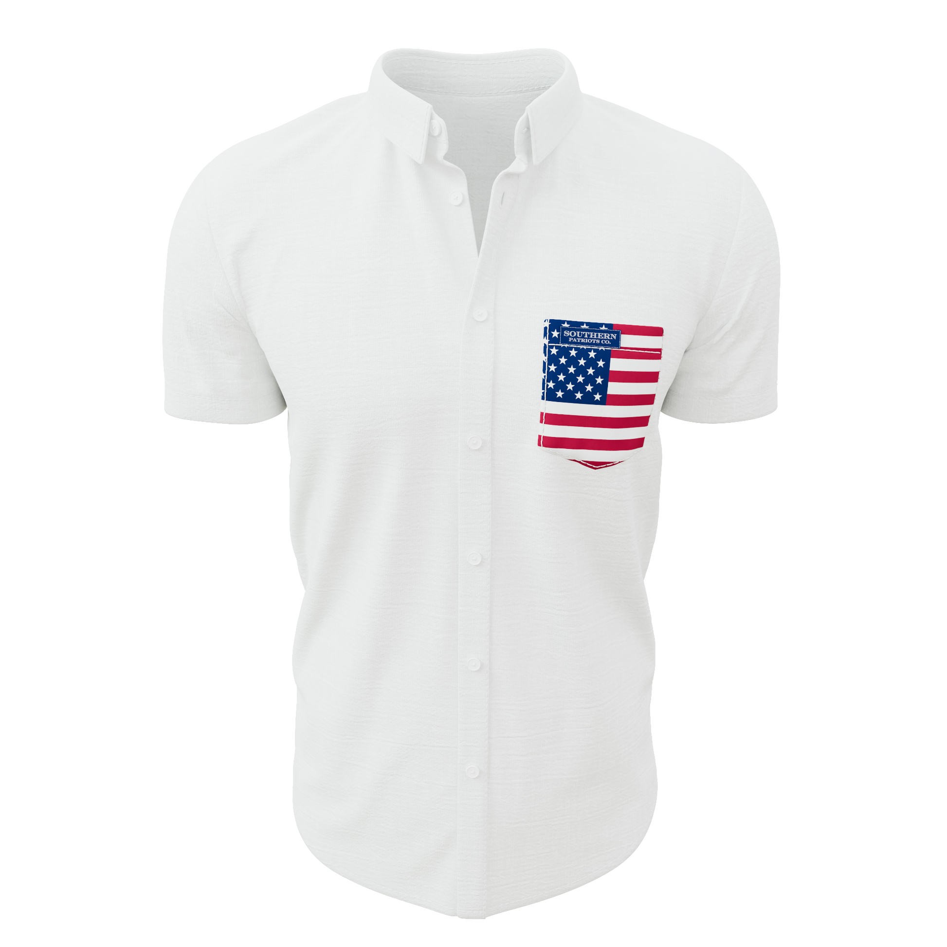 Our white button down polo shirt with an American flag pocket. It is 92% Poly, 8% Spandex. It is stretchy, durable, quick drying, moisture wicking, and it is UV 50+.