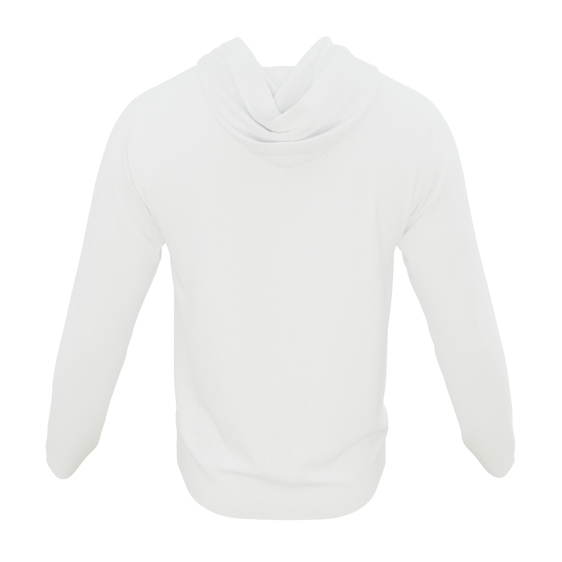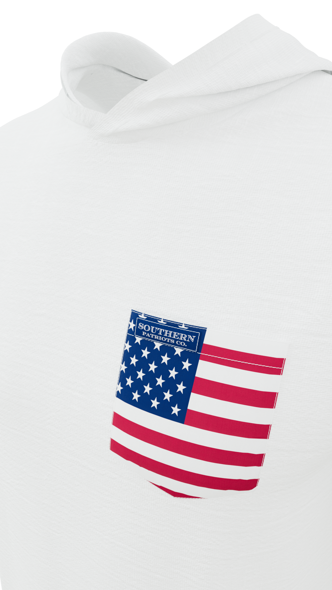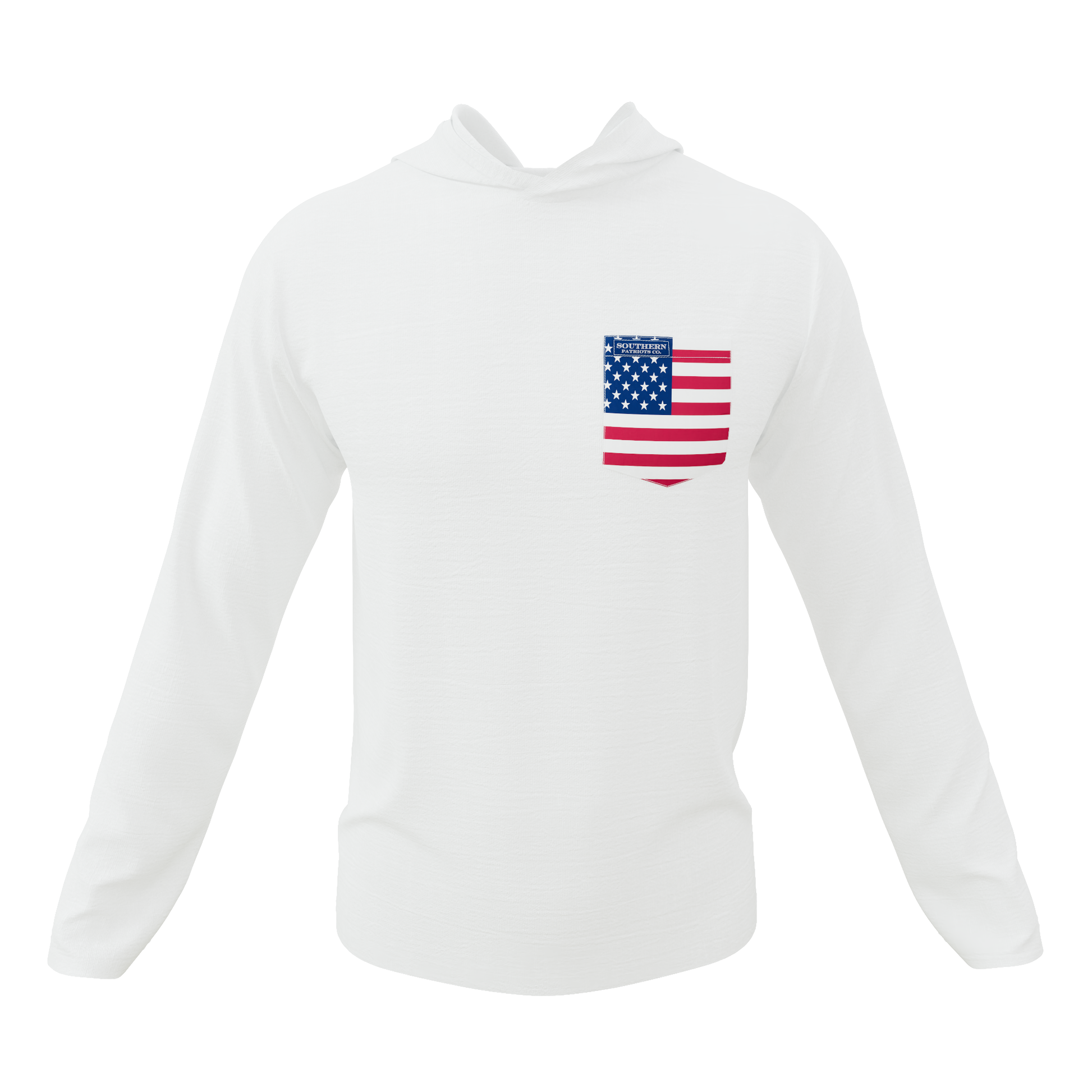 Our white lightweight hoodie with an American flag pocket. It is 92% Poly, 8% Spandex. It is stretchy, durable, quick drying, moisture wicking, and it is UV 50+.