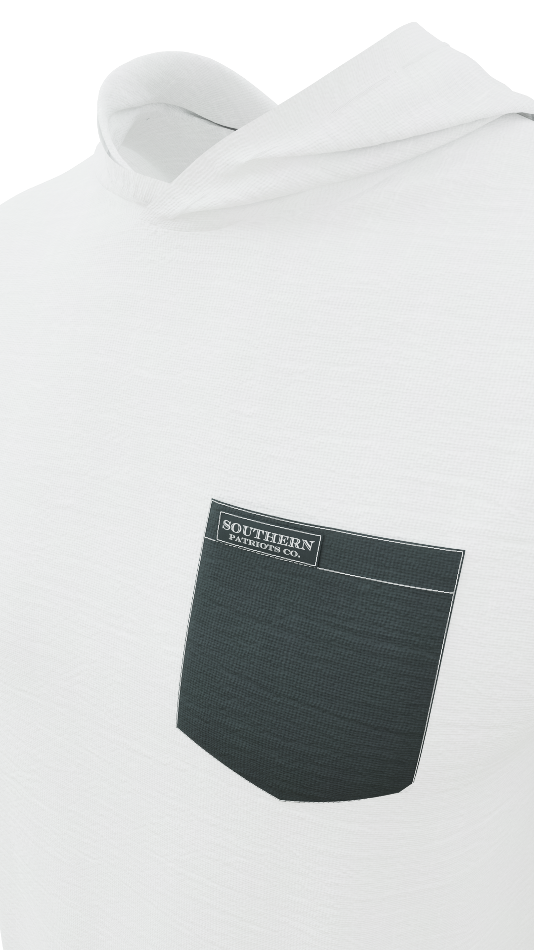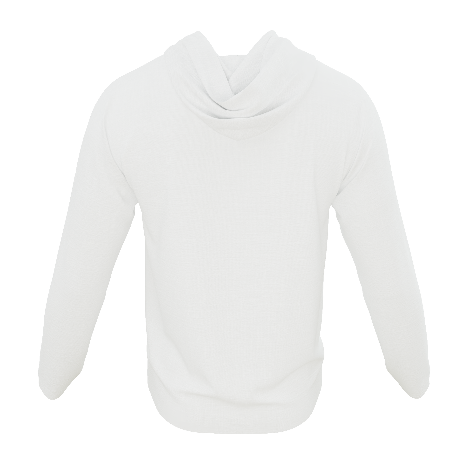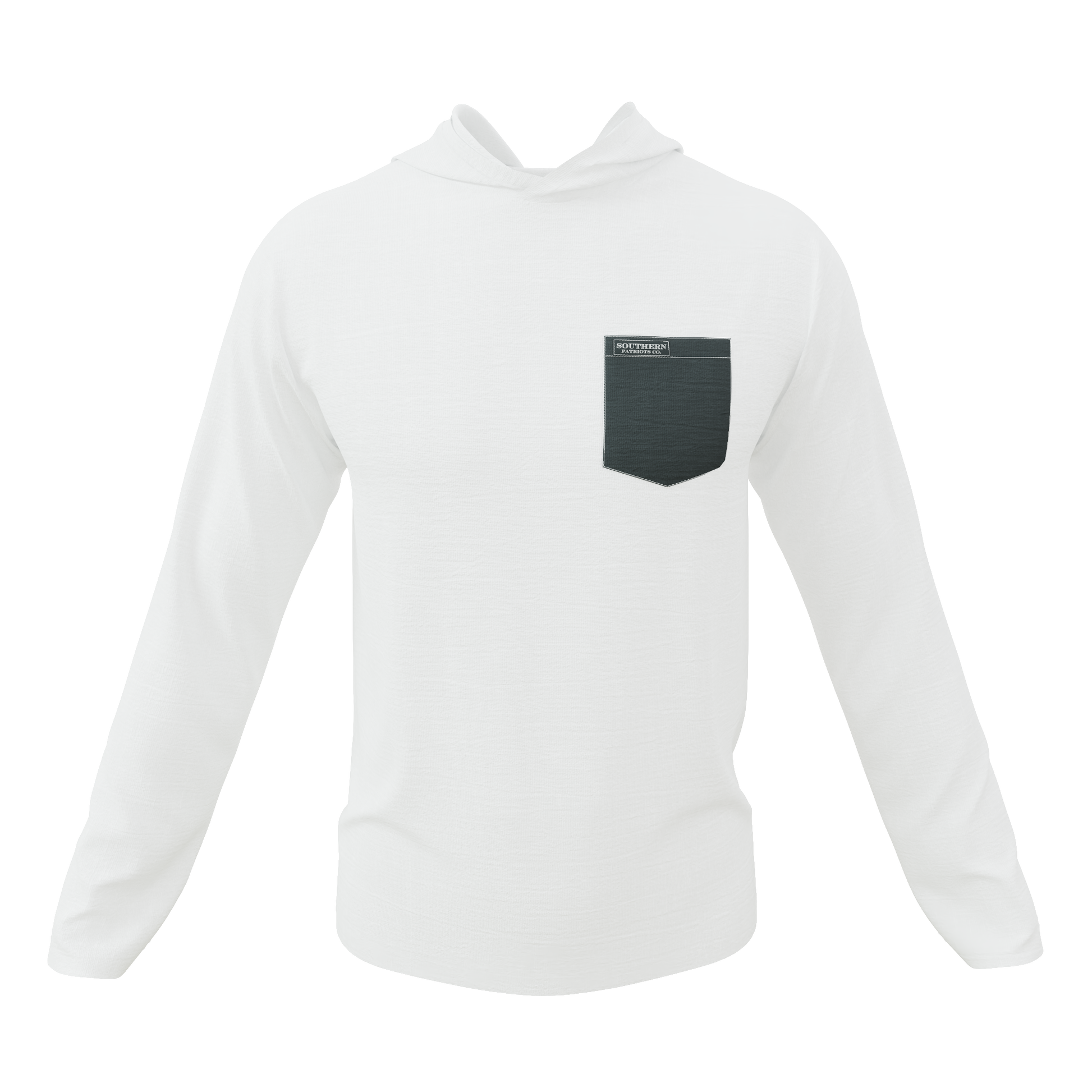 Our White & Charcoal Gray pocket lightweight hoodie. It is 92% Poly, 8% Spandex. It is stretchy, durable, quick drying, moisture wicking, and it is UV 50+.